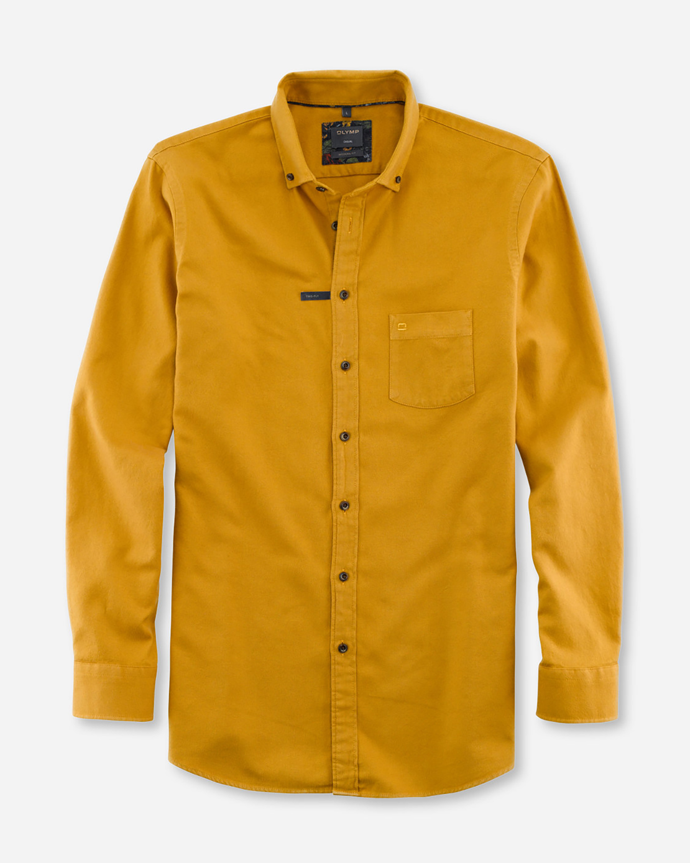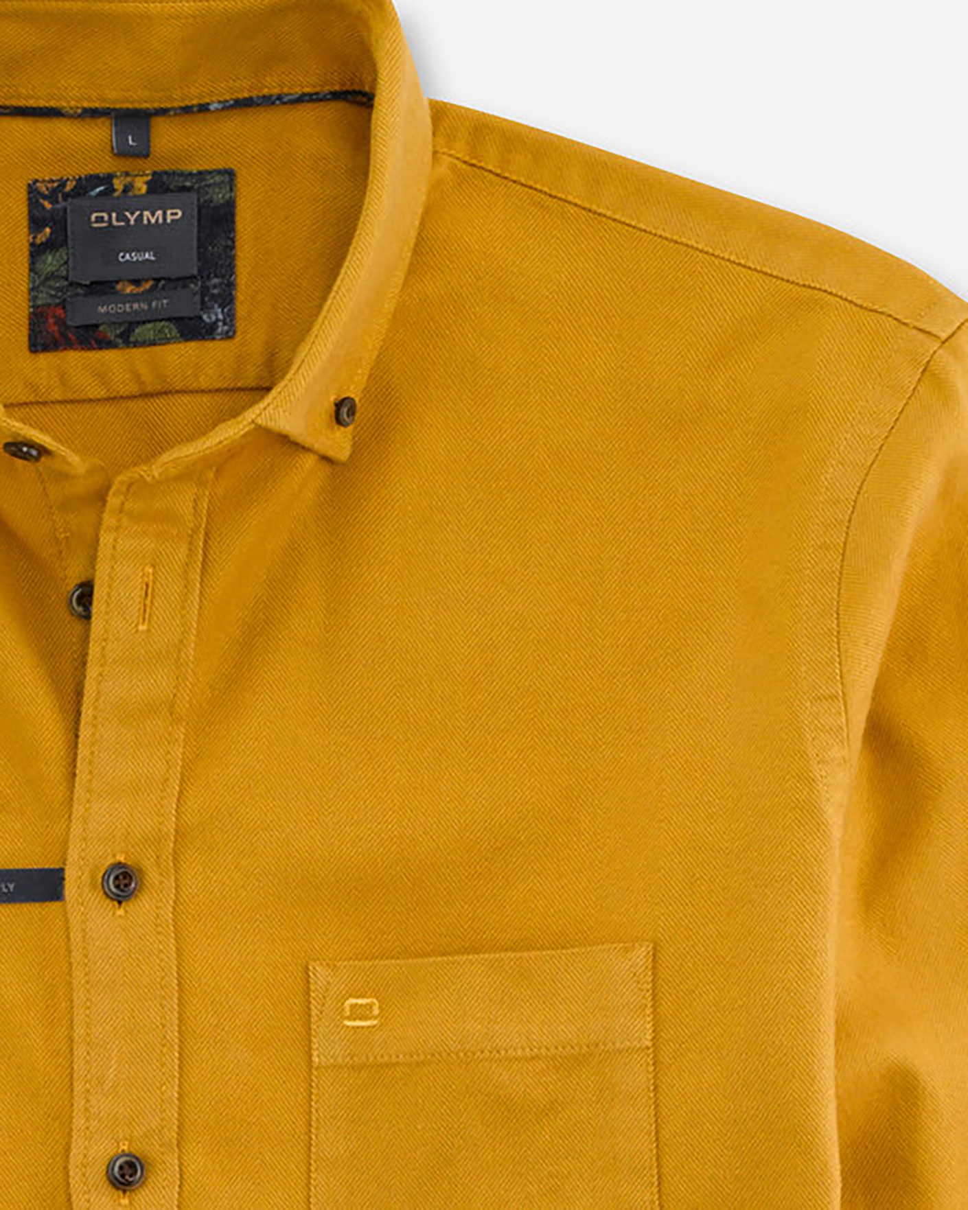 Повседневная рубашка OLYMP Casual Modern Fit горчичного цвета в строчный рисунок-елочка. Классический современный крой, воротник Button-Down, а также накладной нагрудный карман с аккуратной вышивкой логотипа. Рубашка - модный компаньон для отдыха из чистого хлопка.