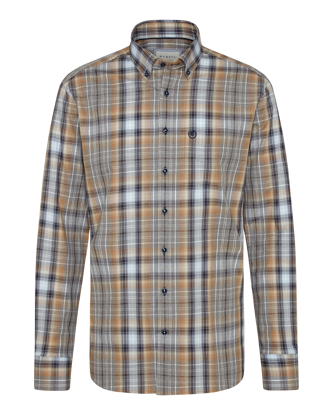 Рубашка Bugatti серо-бежевого цвета в крупную клетку. Модель из 100% хлопка с воротником Button-Down, планкой на пуговицы по всей длине. Имеется накладной карман на груди с аккуратной вышивкой логотипа. Рубашка станет фаворитом вашего повседневного гардероба.