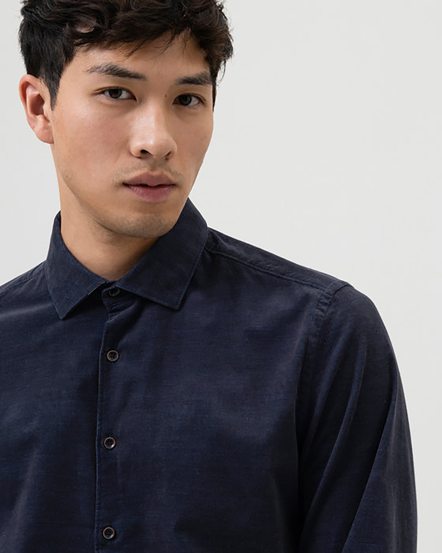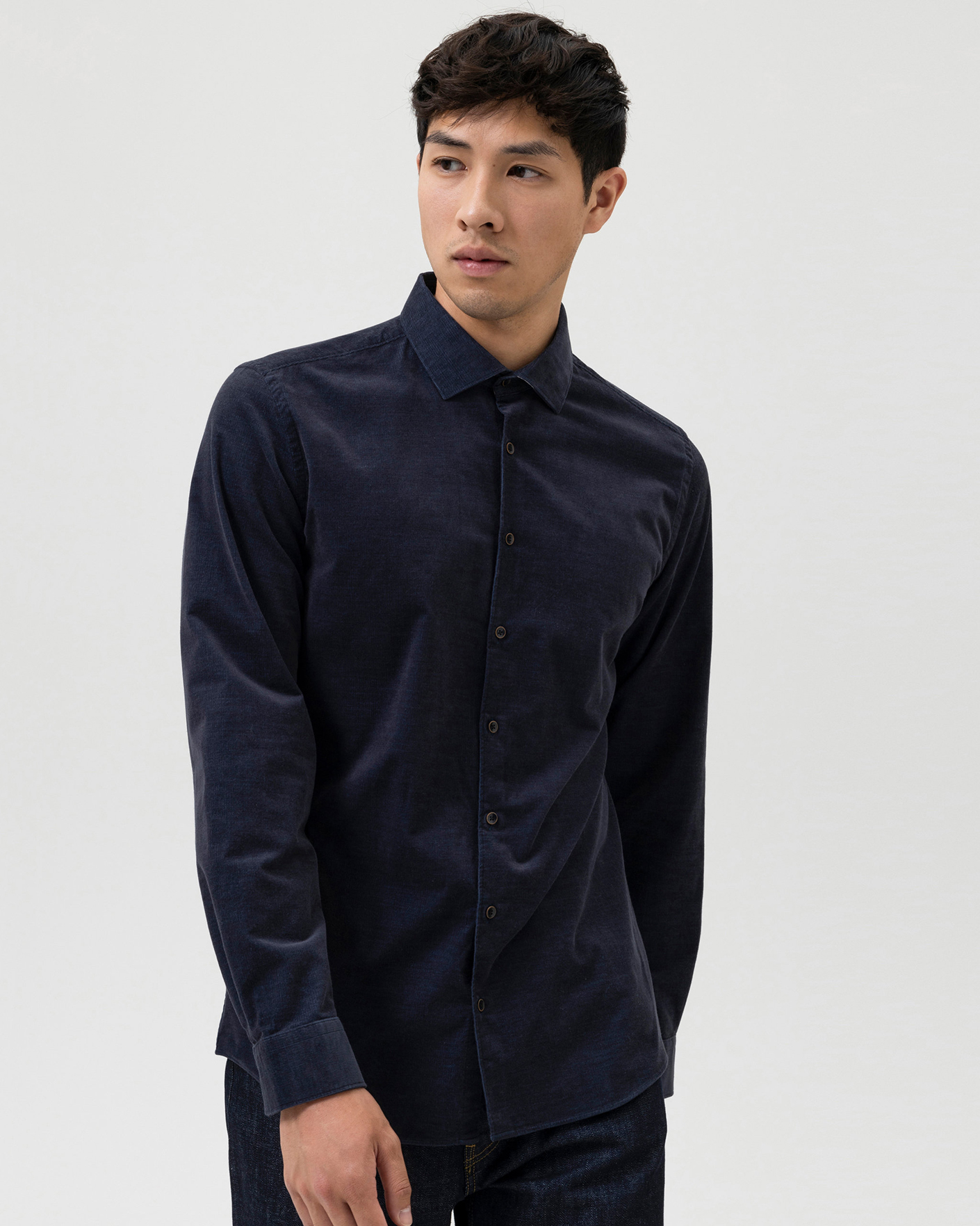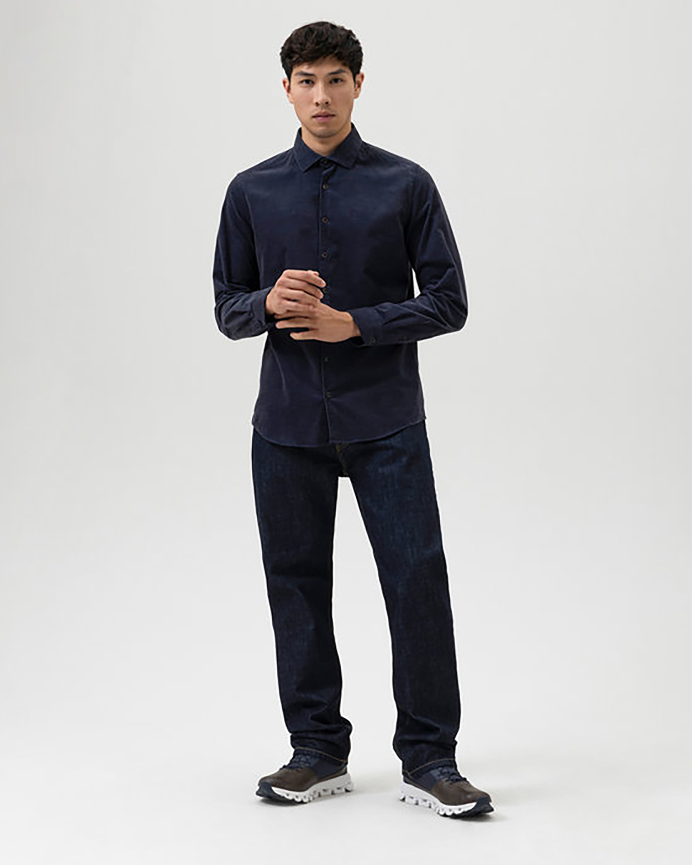 Повседневная рубашка Olymp Level Five Smart Casual темно-синего цвета в микровельветовую текстуру. Модель с воротником Kent, планкой на пуговицы, регулируемые манжеты с небольшой складкой. Рубашка станет отличным дополнением к вашему повседневному образу.