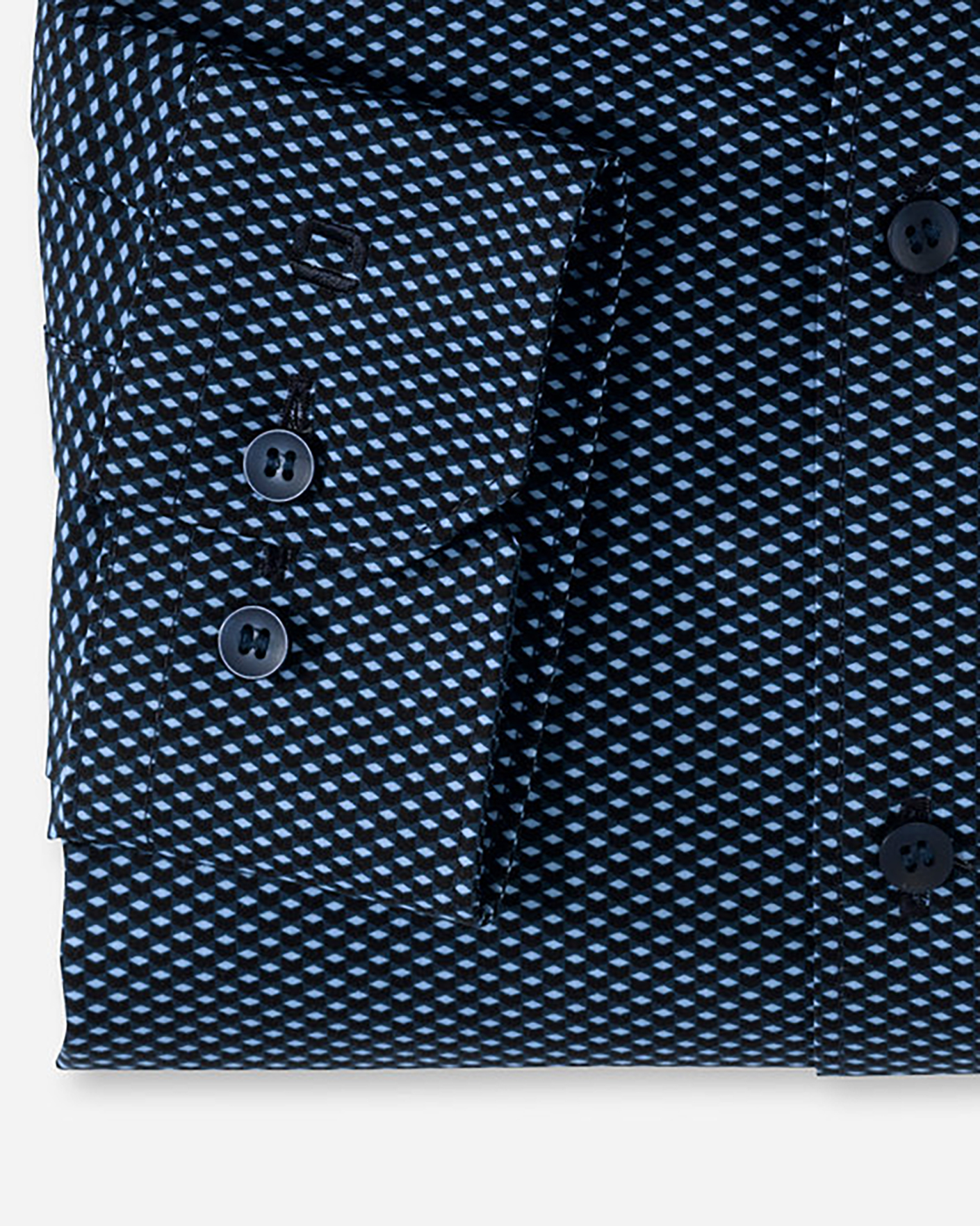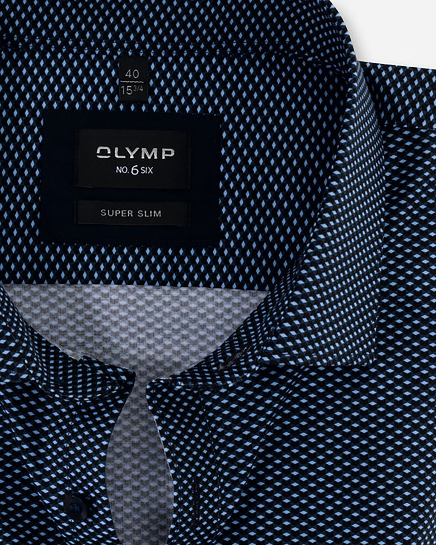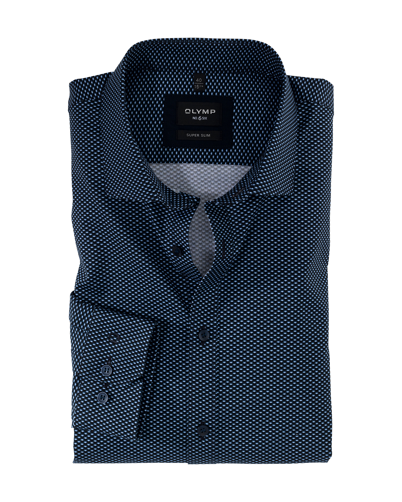 Деловая рубашка Olymp No Six super slim темно-синего цвета в мелкий рисунок. Хлопковая модель с воротником Modern Kent, планкой на пуговицы в тон. Рубашка - это классика, которая обязательна в деловом гардеробе.