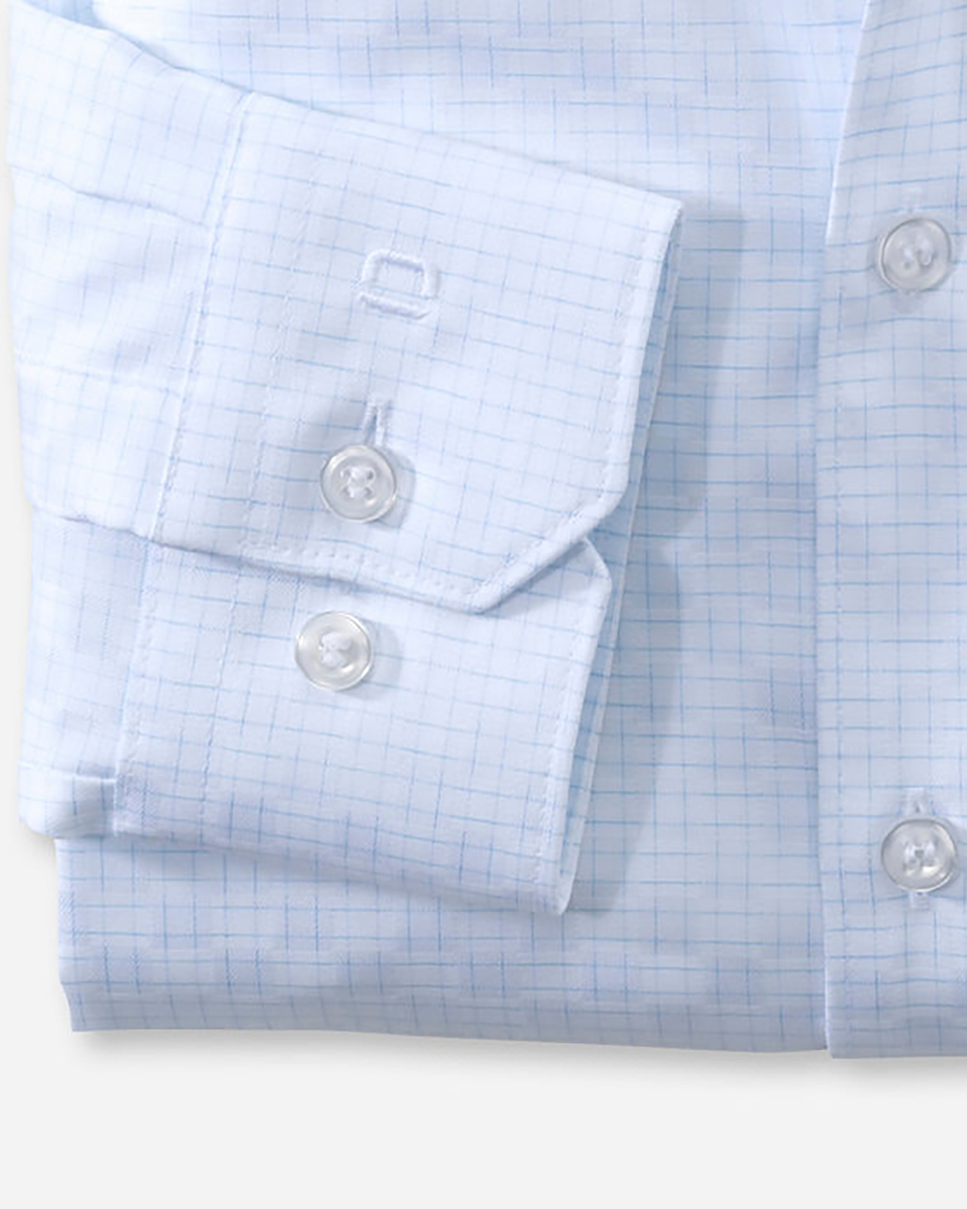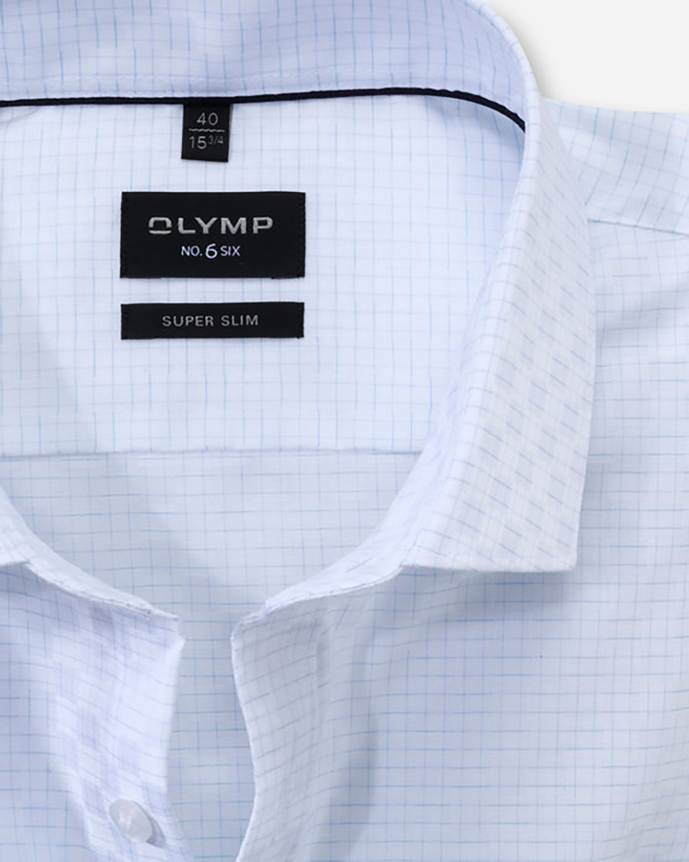 Бело-голубая рубашка OLYMP Nmber Six Super Slim в мелкую клетку с длинным рукавом и элегантным воротником Modern Kent. Рубашка станет ярким дополнением к Вашему деловому гардеробу.