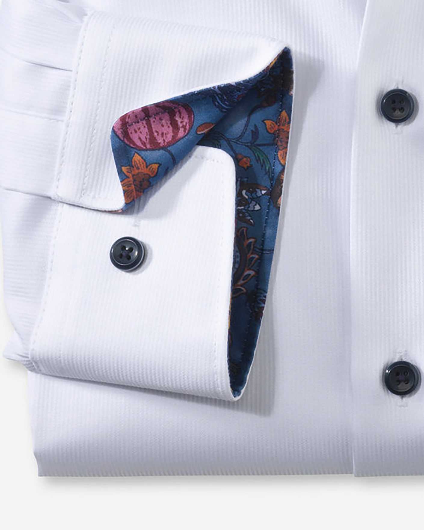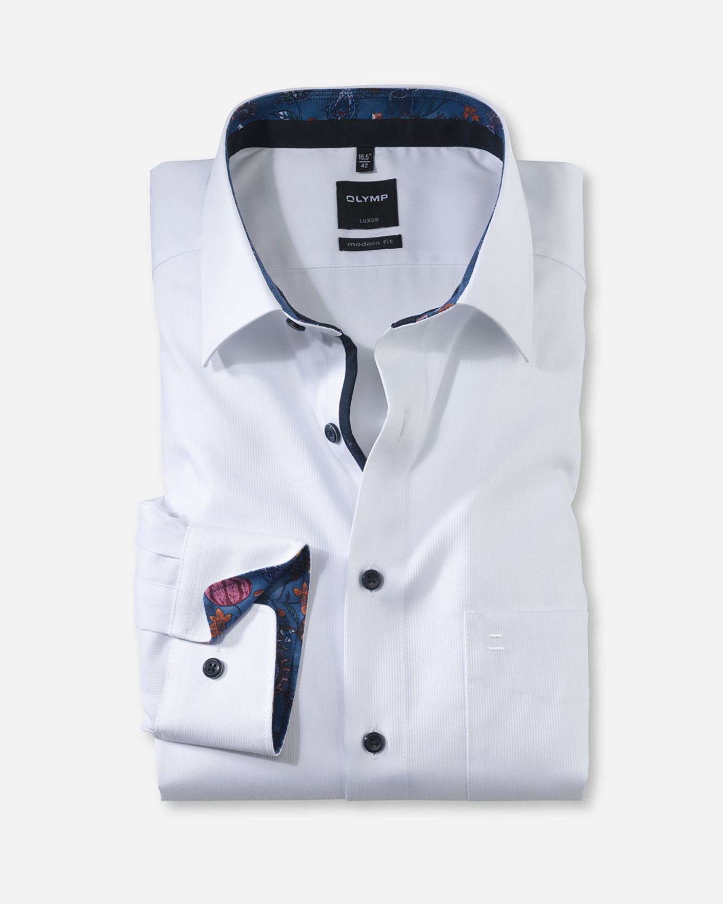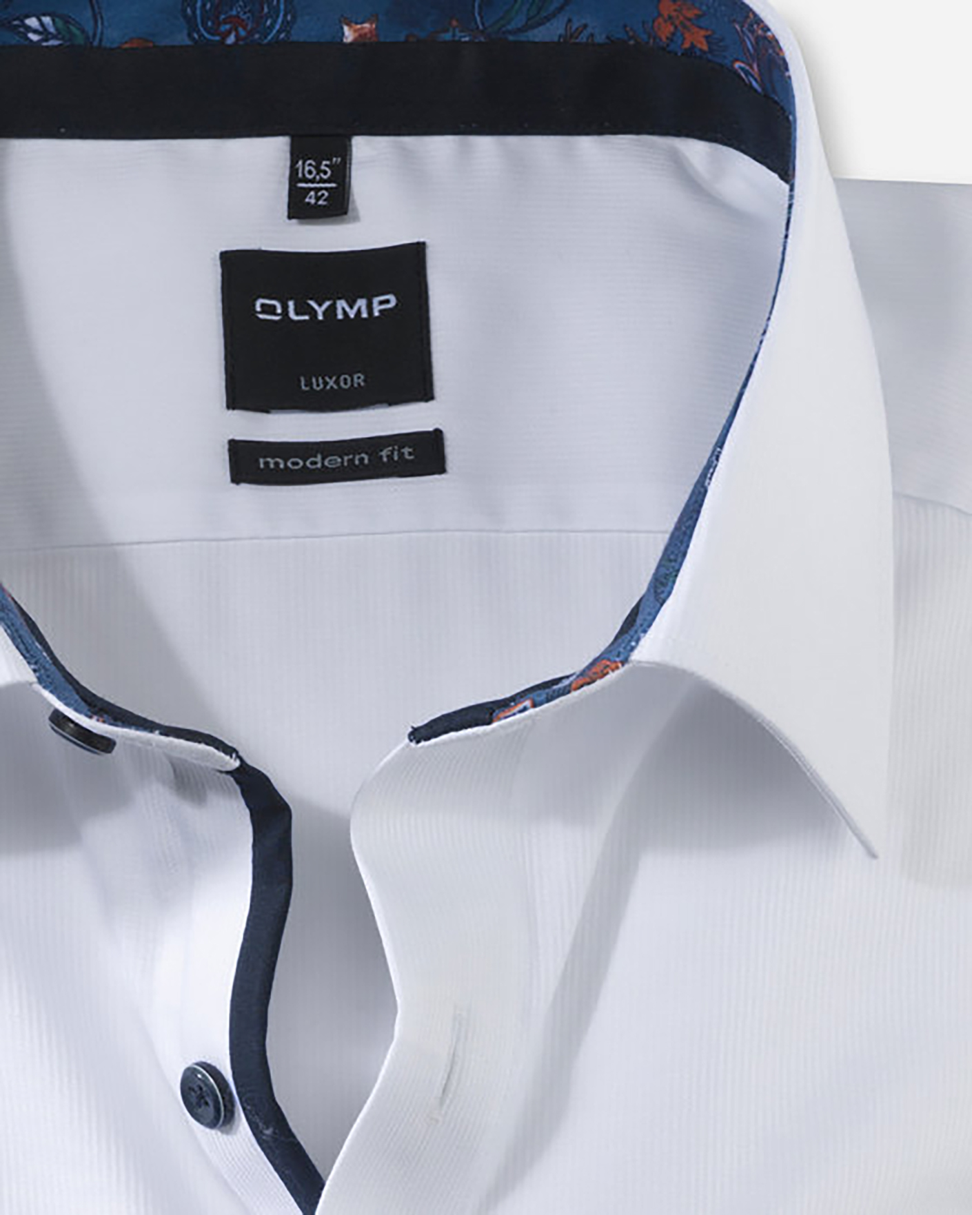 Рубашка OLYMP Luxor Modern Fit белого цвета в строчный вертикальный рисунок. 100% хлопок, космополитичный воротник New Kent и манжеты с внутренней отделкой и контрастной планкой на пуговицах темно-синего цвета. Рубашка - идеальный компаньон в течение всего рабочего дня.