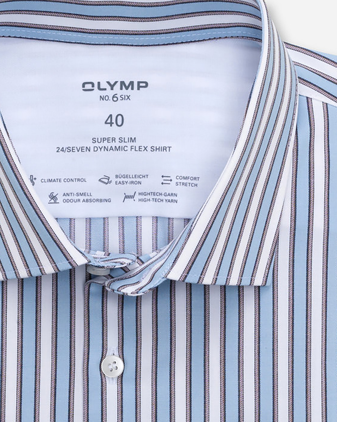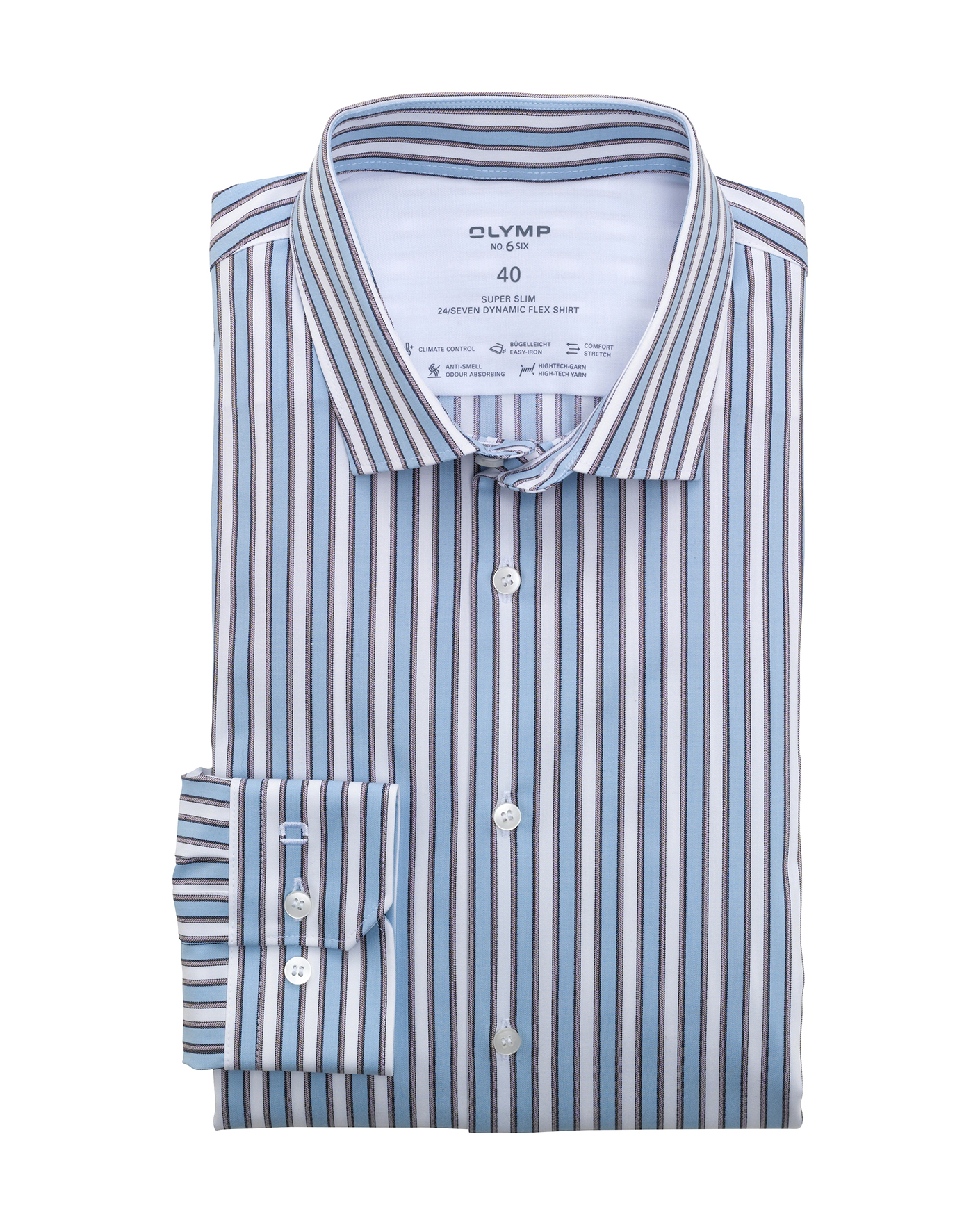 Деловая рубашка Olymp No Six Super slim 24/Seven CLIMATE CONTROL бело-голубого цвета в вертикальную п олосу. Хлопковая модель с воротником Modern Kent, планкой на белые пуговицы. Рубашка - это классика, которая обязательна в деловом гардеробе.