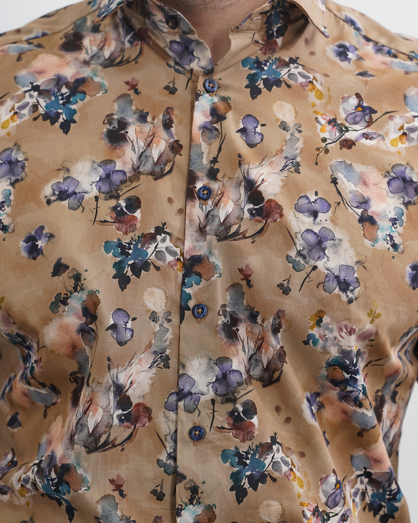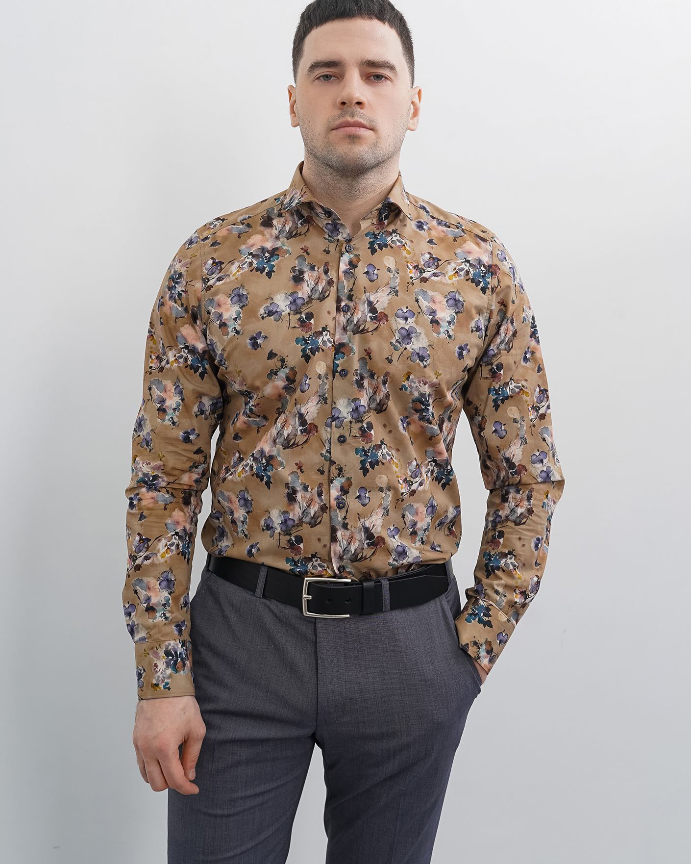 Яркая рубашка Digel бежевого цвета в крупный цветочный рисунок. Модель из 100% хлопка с отложным воротником и застежкой на пуговицы. Качественная рубашка - залог успешного бизнеса.