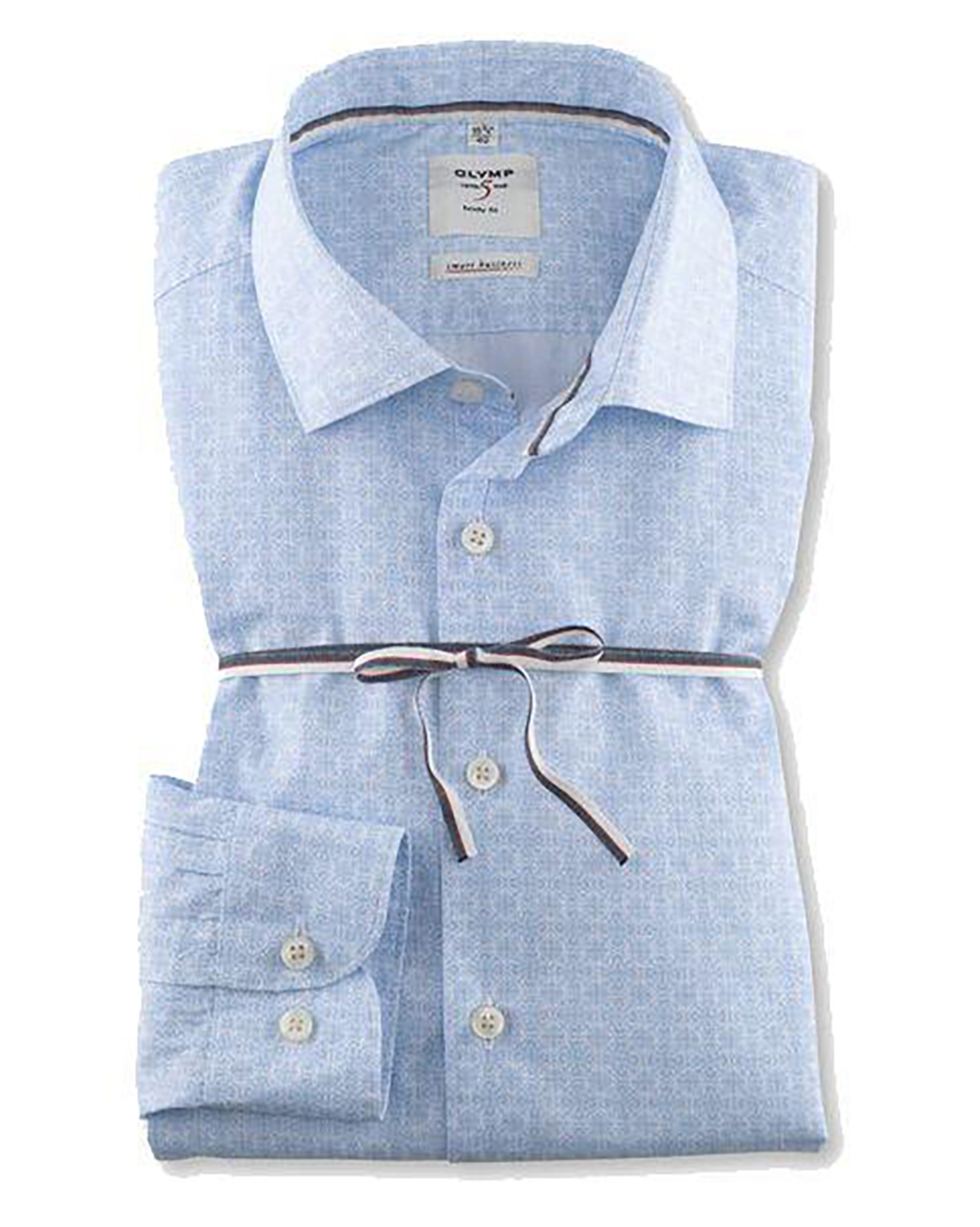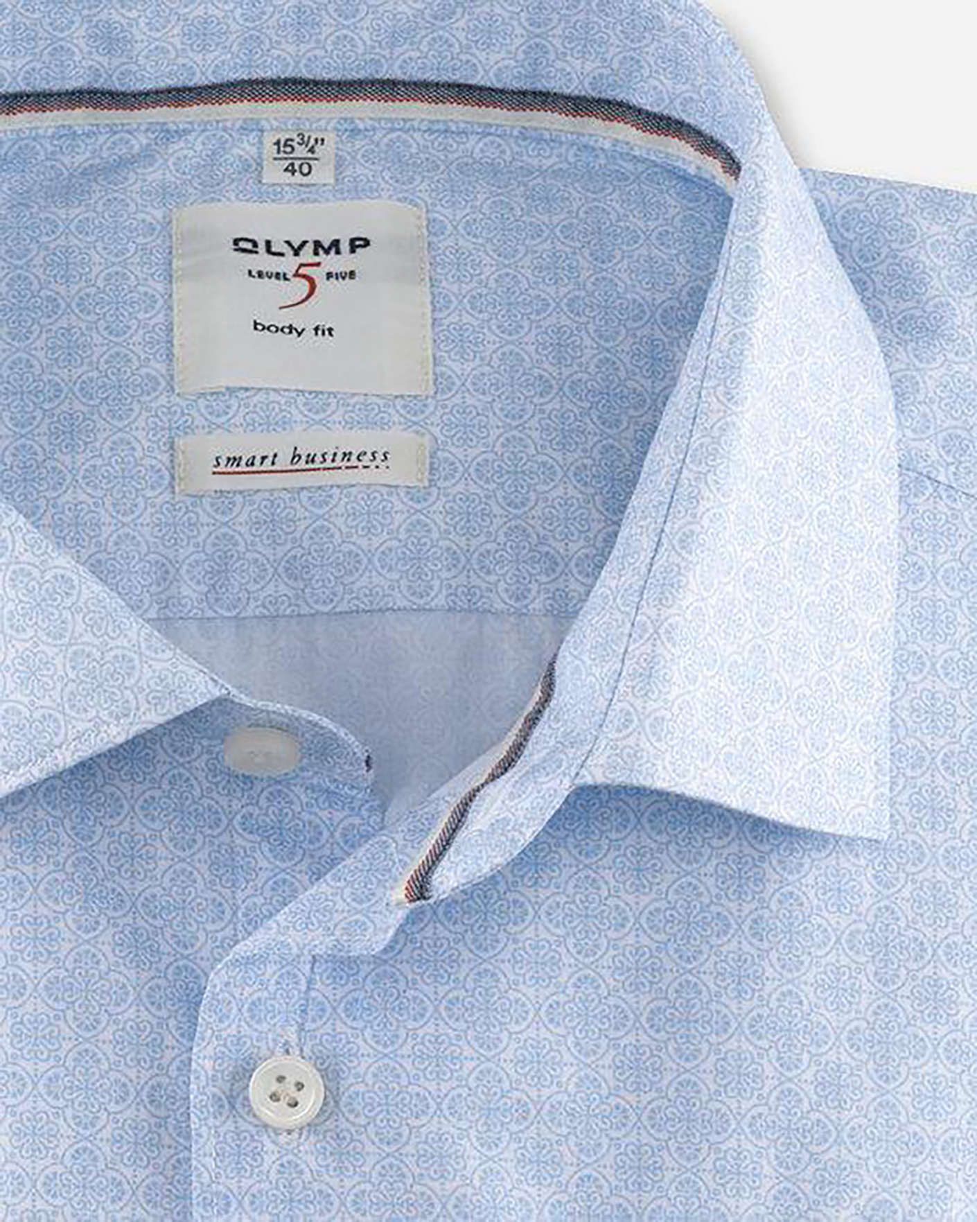 Рубашка OLYMP Level Five Smart Business голубого оттенка в мелкий орнамент. Модель сочетает в себе два стиля: деловой и повседневный жизни. Регулируемые манжеты и воротник Kent дополняют общую картину. Высококачественный хлопок обеспечивает максимальную свободу движений, несмотря на посадку.