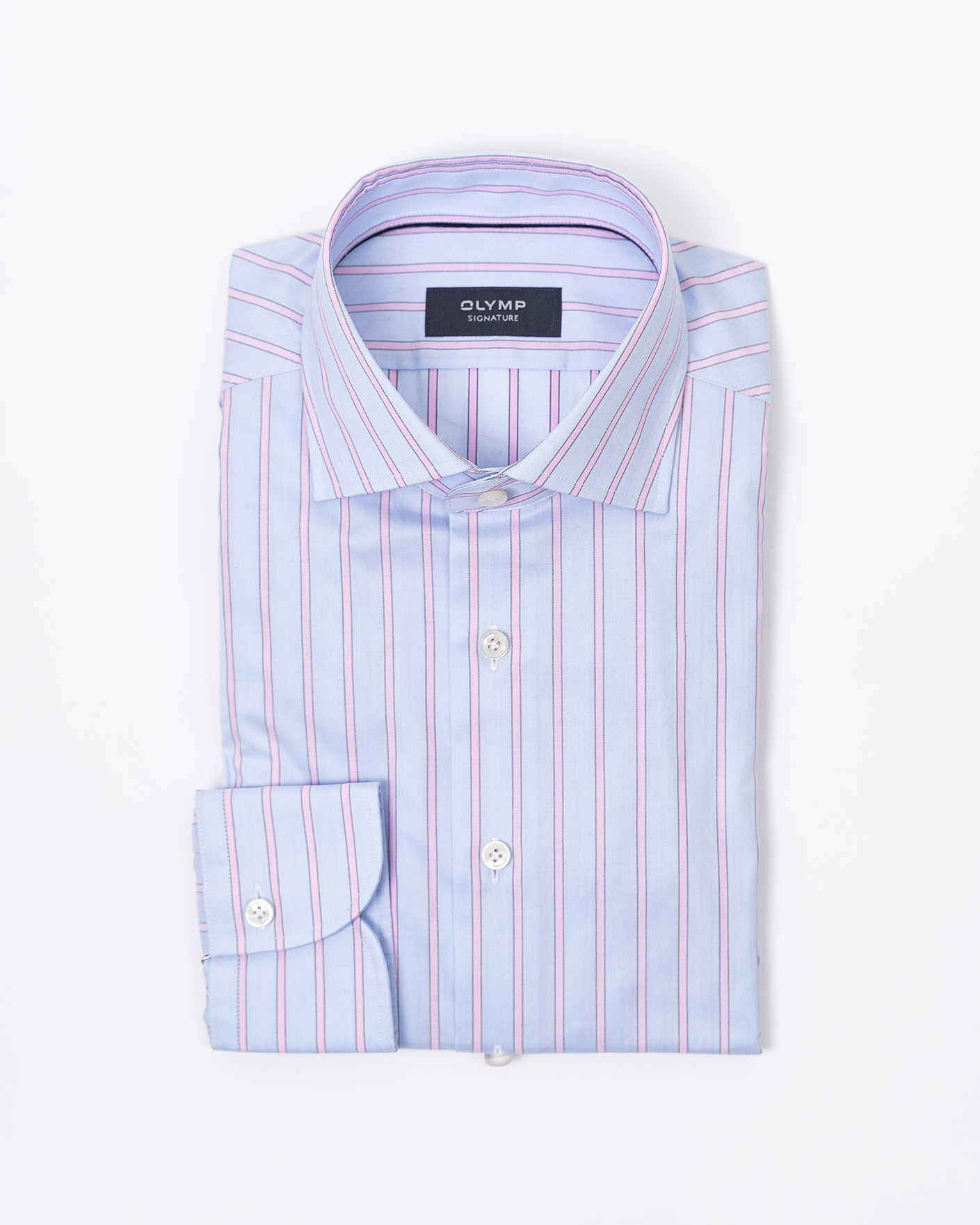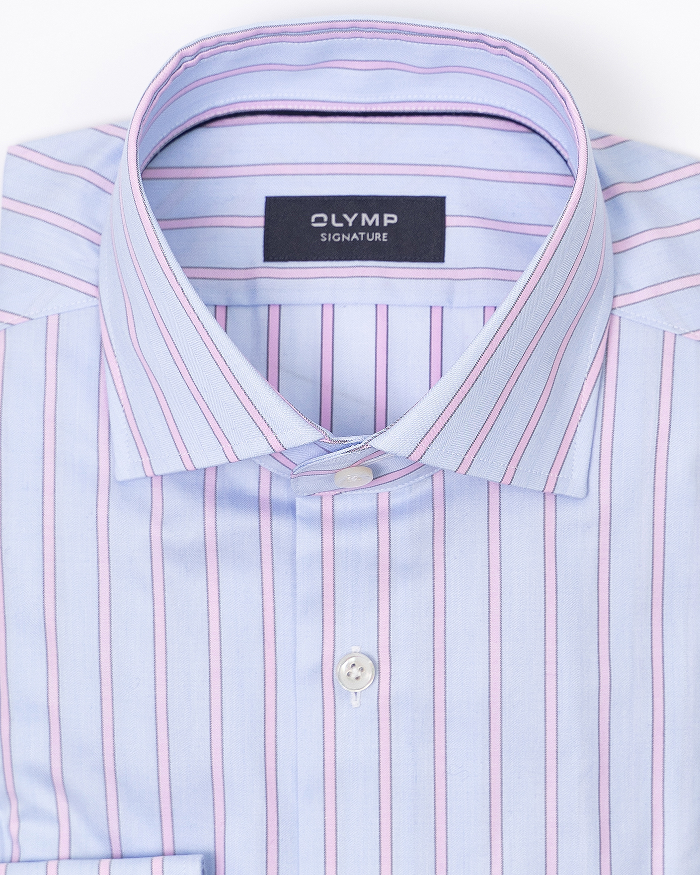 Рубашка OLYMP SIGNATURE голубого цвета в тонкую вертикальную полосу. Модель с воротником SIGNATURE Kent. Облигающий крой идеально подчеркивает фигуру и обеспечивает максимальную свободу движений в течение всего дня.