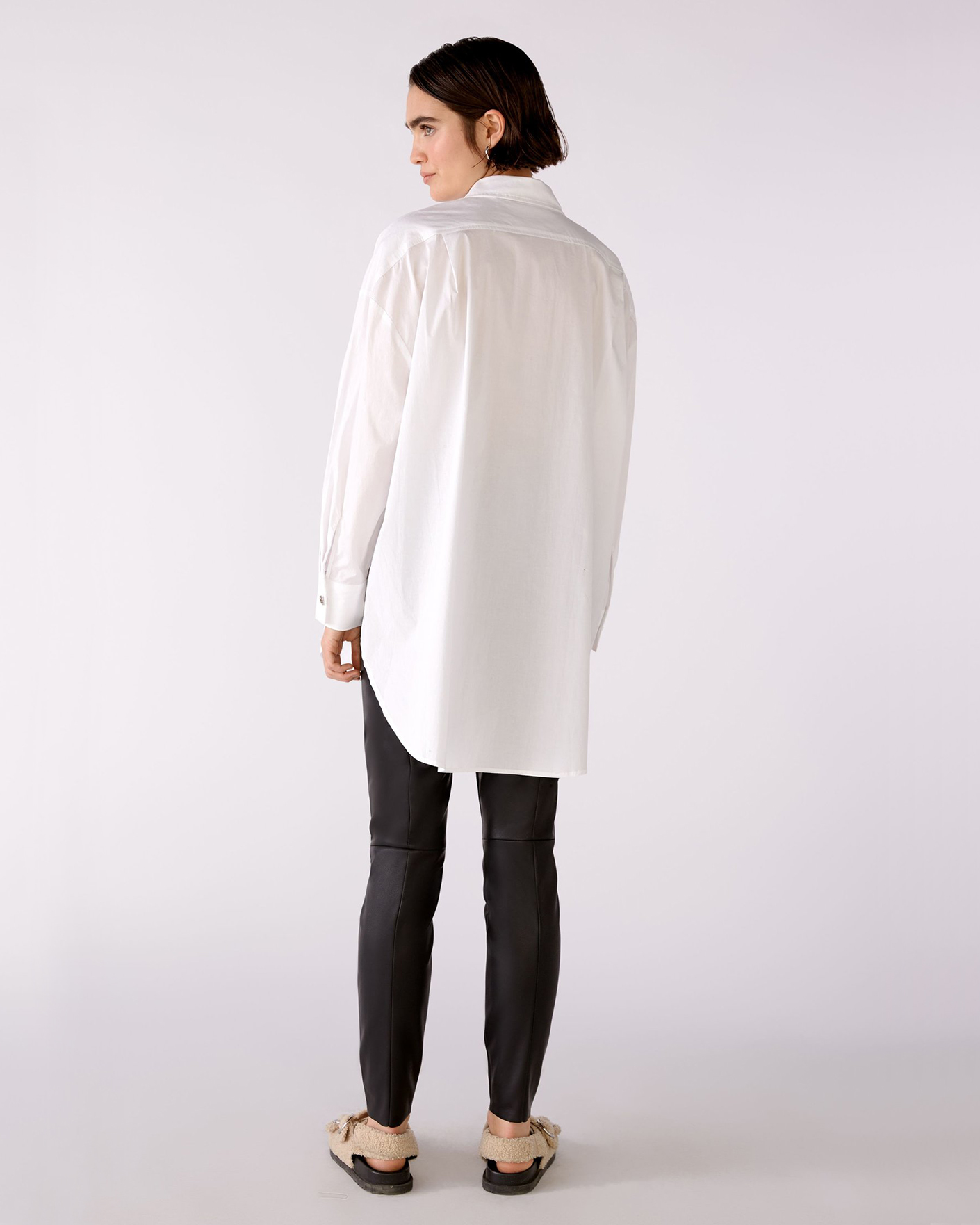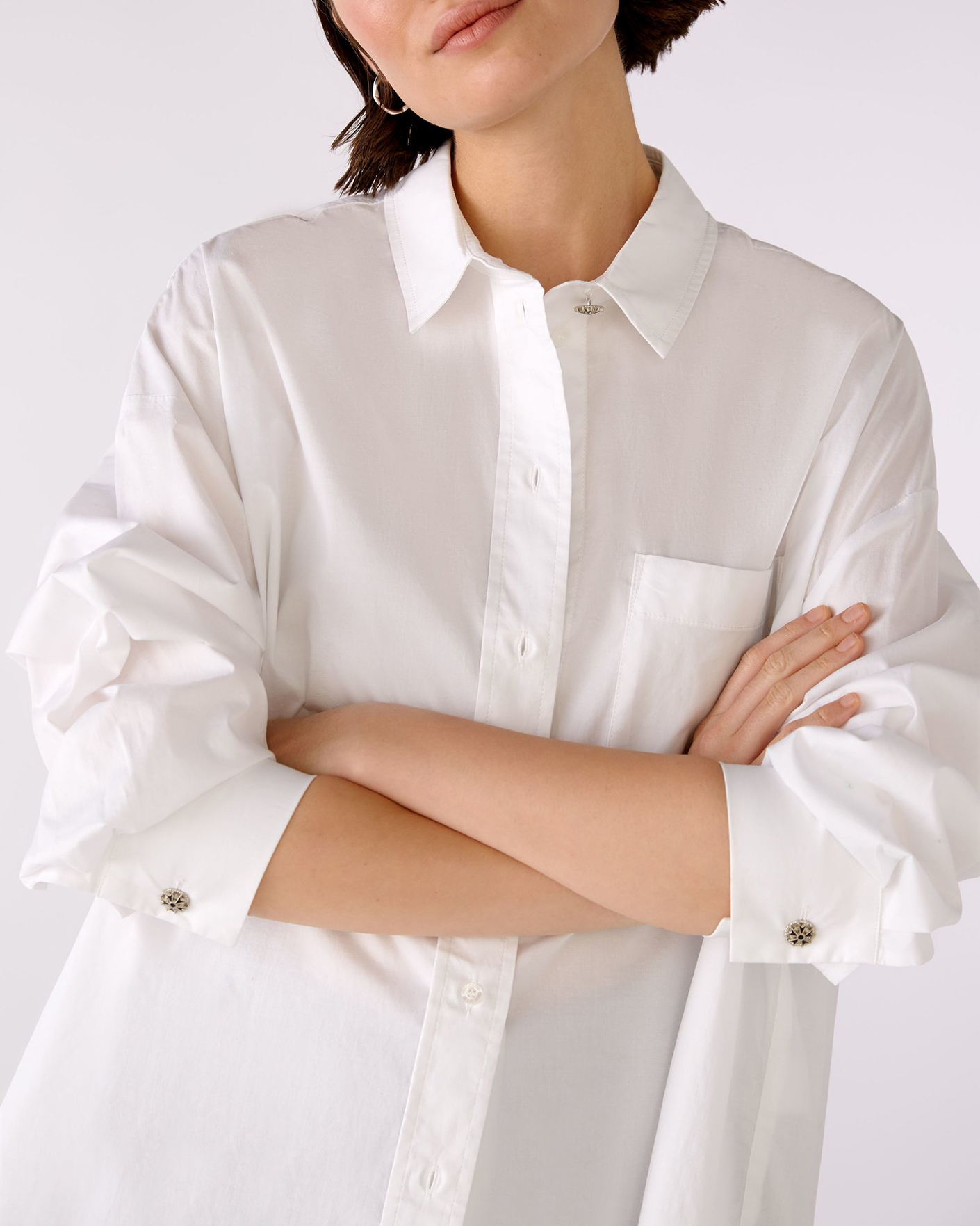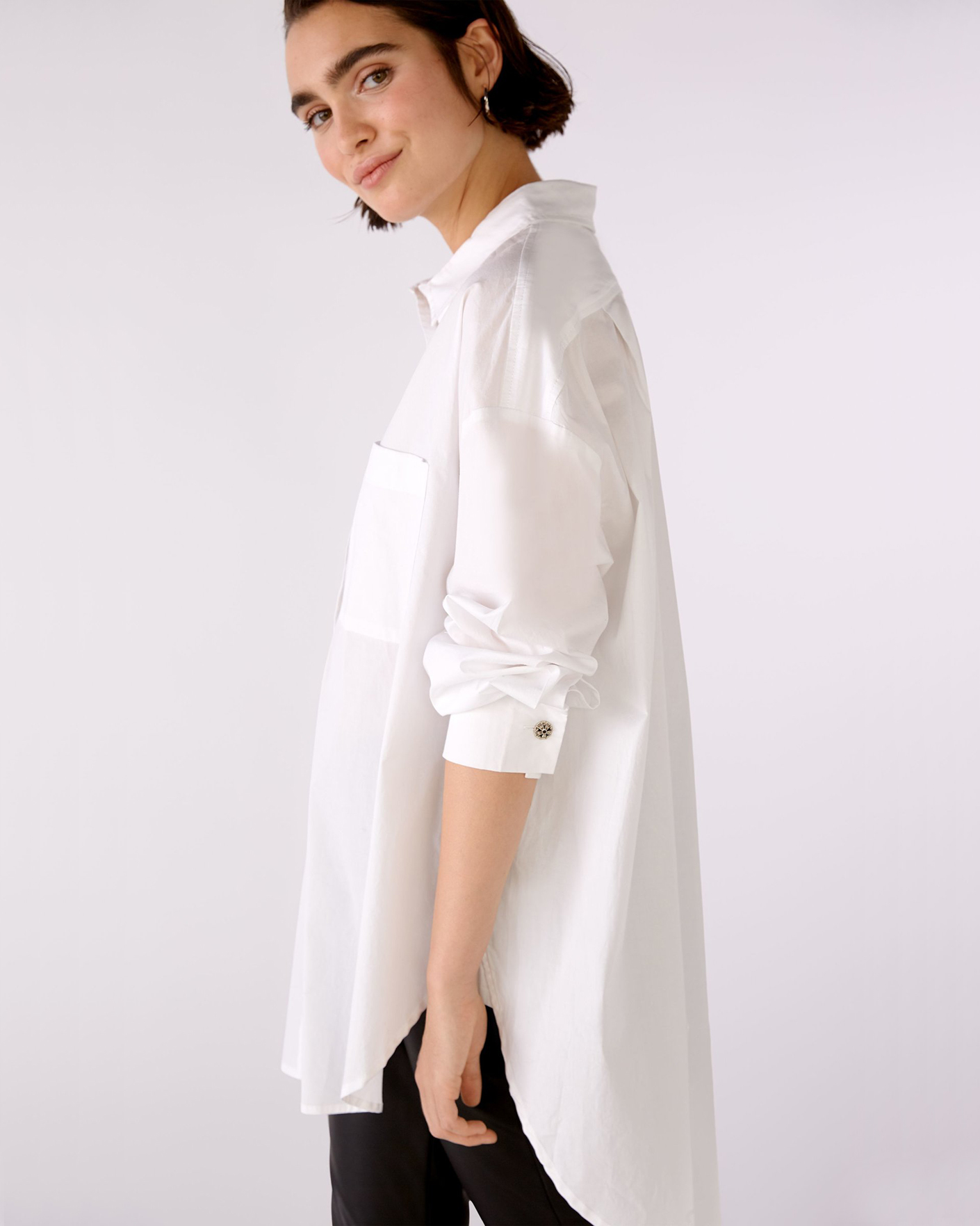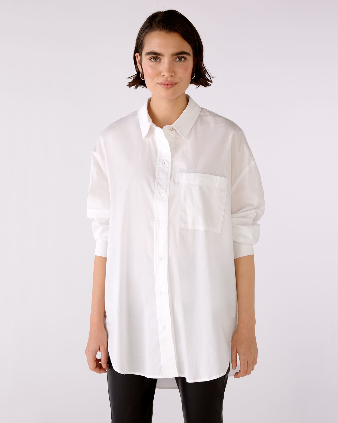 Свободная рубашка OUI белого цвета. Хлопковая модель с отложным воротником, планкой на белые пуговицы, имеется накладной нагрудный карман. Удлиненная спинка, небольшие закругленные разрезы по бокам. Рубашка станет фаворитом вашего гардероба на каждый день.