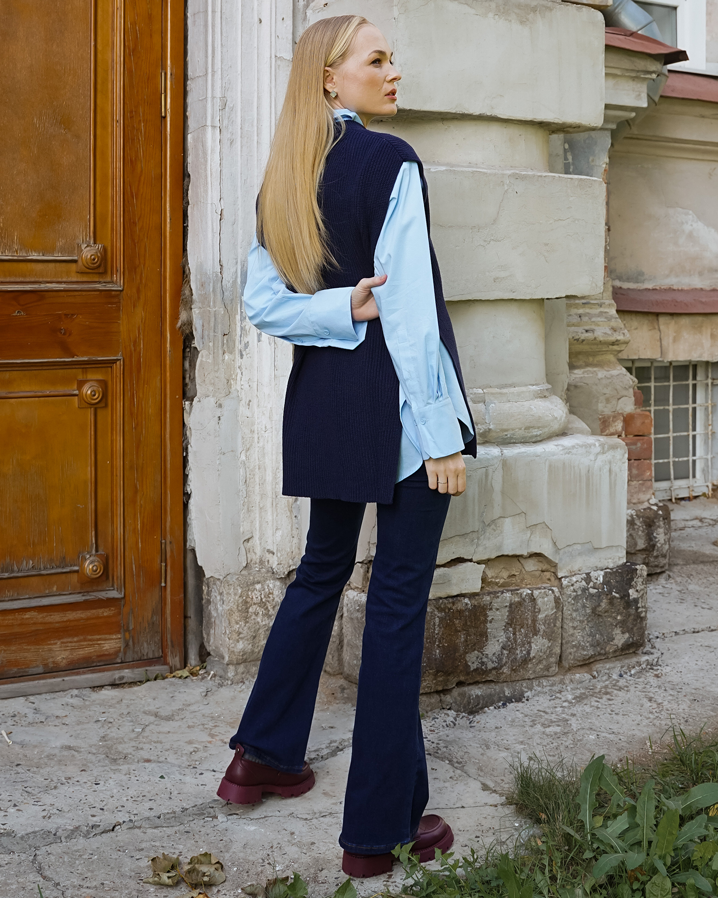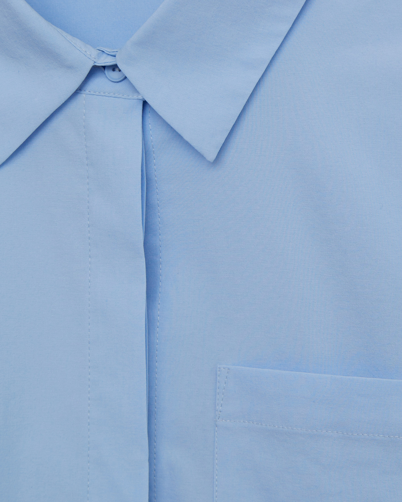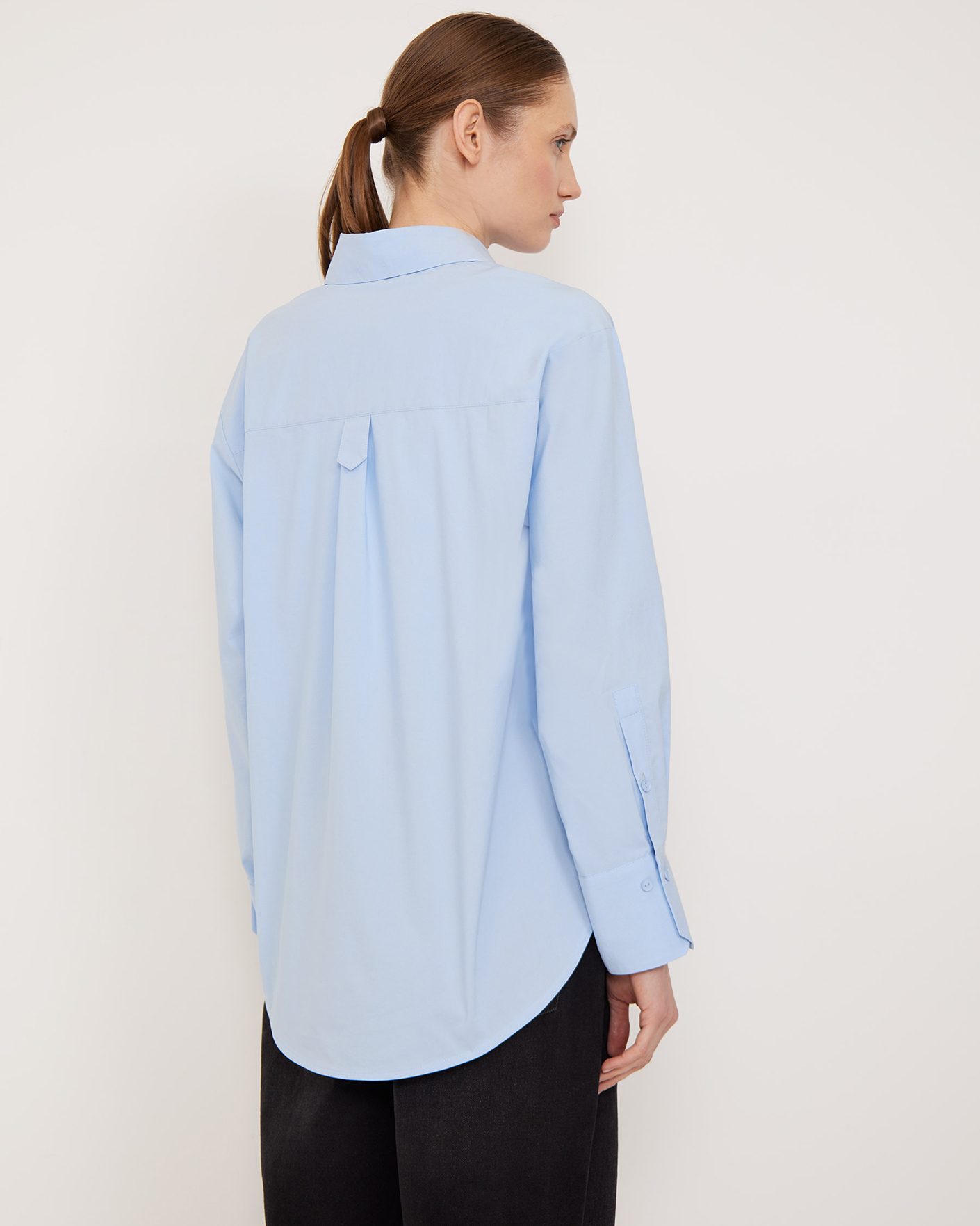 Свободная рубашка Emka голубого цвета. Модель из 100% хлопка с отложным воротником, застежка на скрытые пуговицы, имеется накладной карман на груди. Рубашка станет фаворитом вашего гардероба.