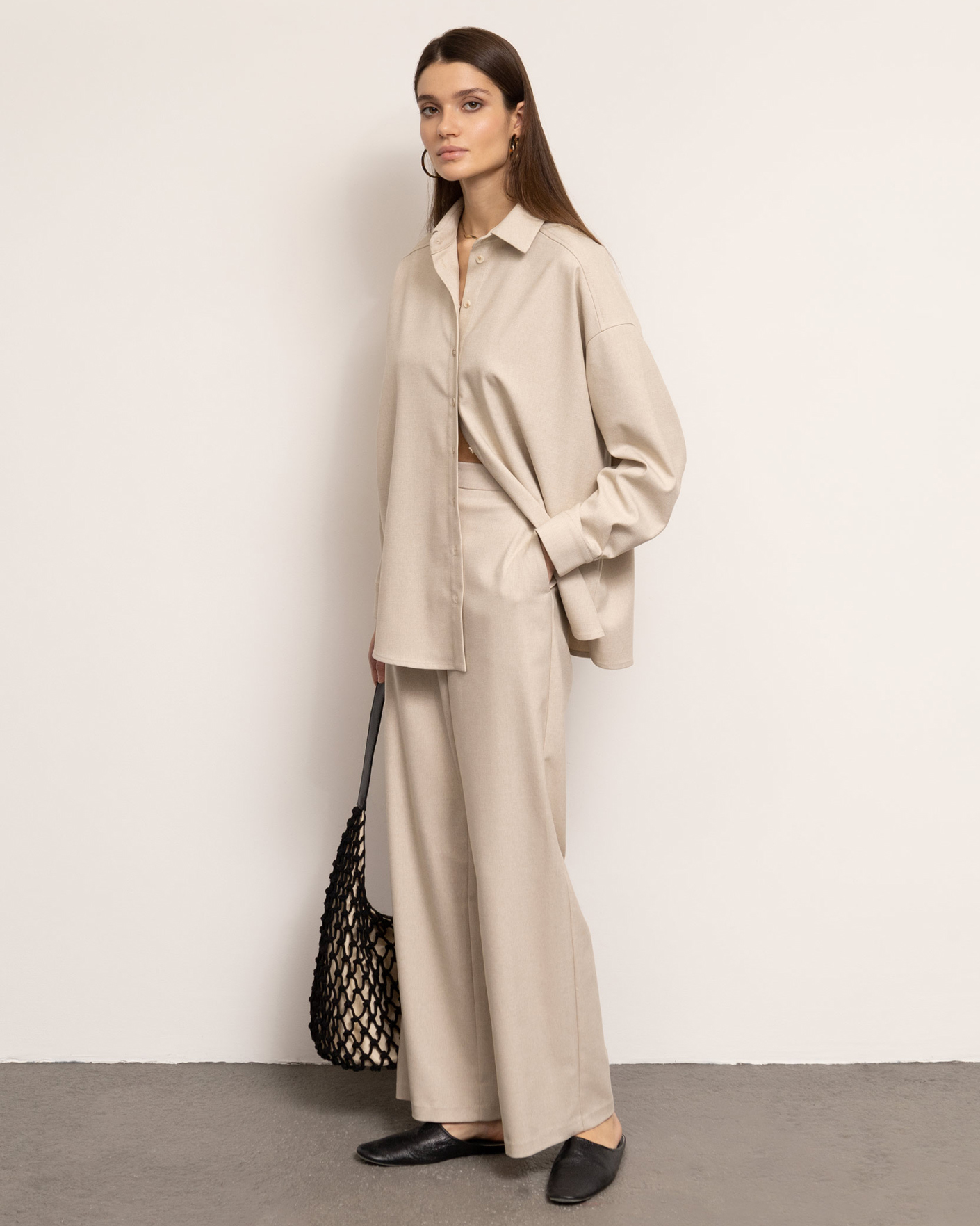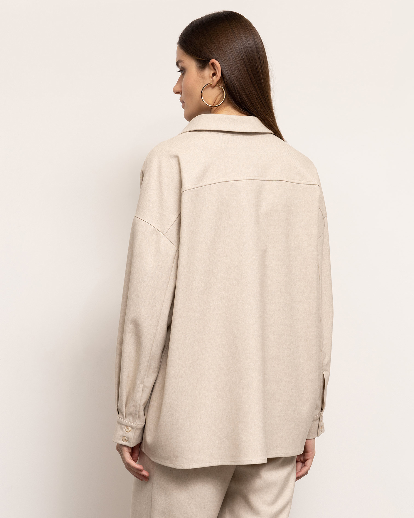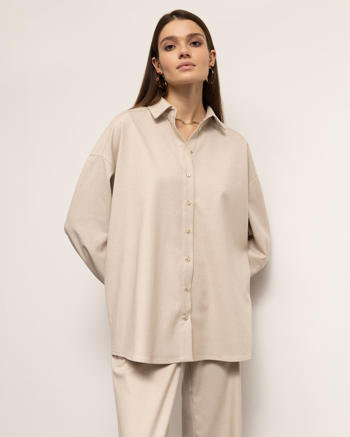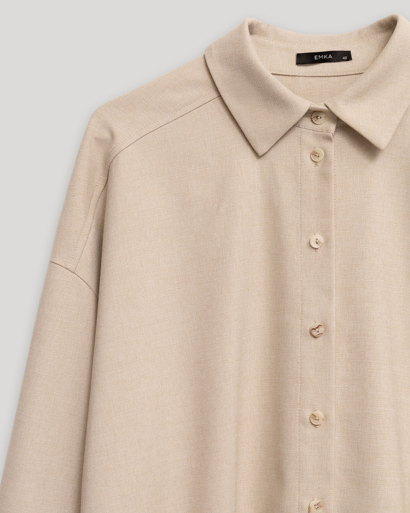 Свободная рубашка Emka бежевого цвета в строчный рисунок. Модель с отложным воротником, планкой на пуговицы в тон.Спущенная линия плеча с длинными рукавами и регулируемыми манжетами. Рубашка отлично впишется в ваш гардероб.