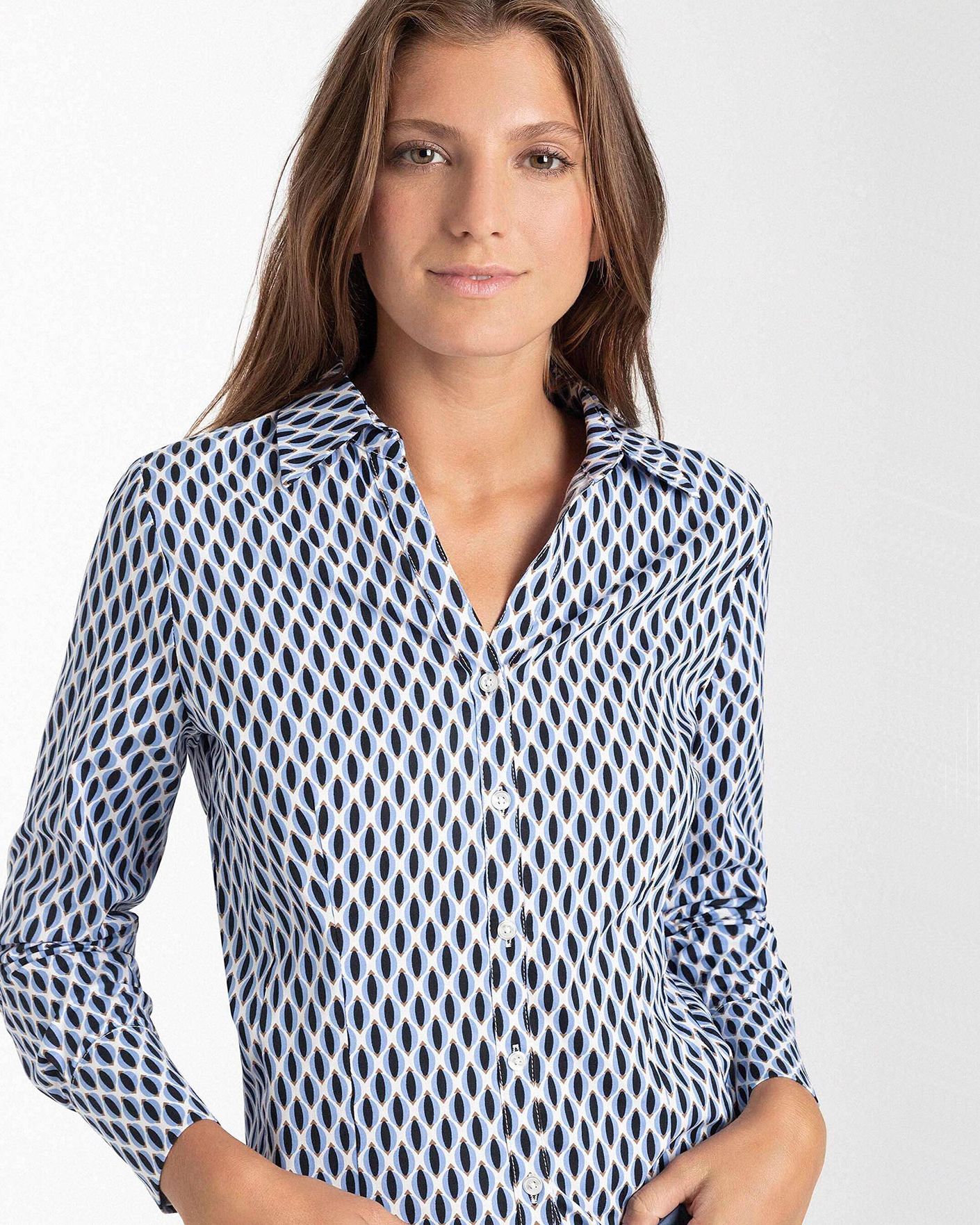Полуприталенная рубашка More&More голубого цвета в геометрический рисунок. Хлопковая модель с отложным воротником, небольшим V-образным вырезом и застежкой на пуговицы. Рубашка отлично впишется в повседневный гардероб.