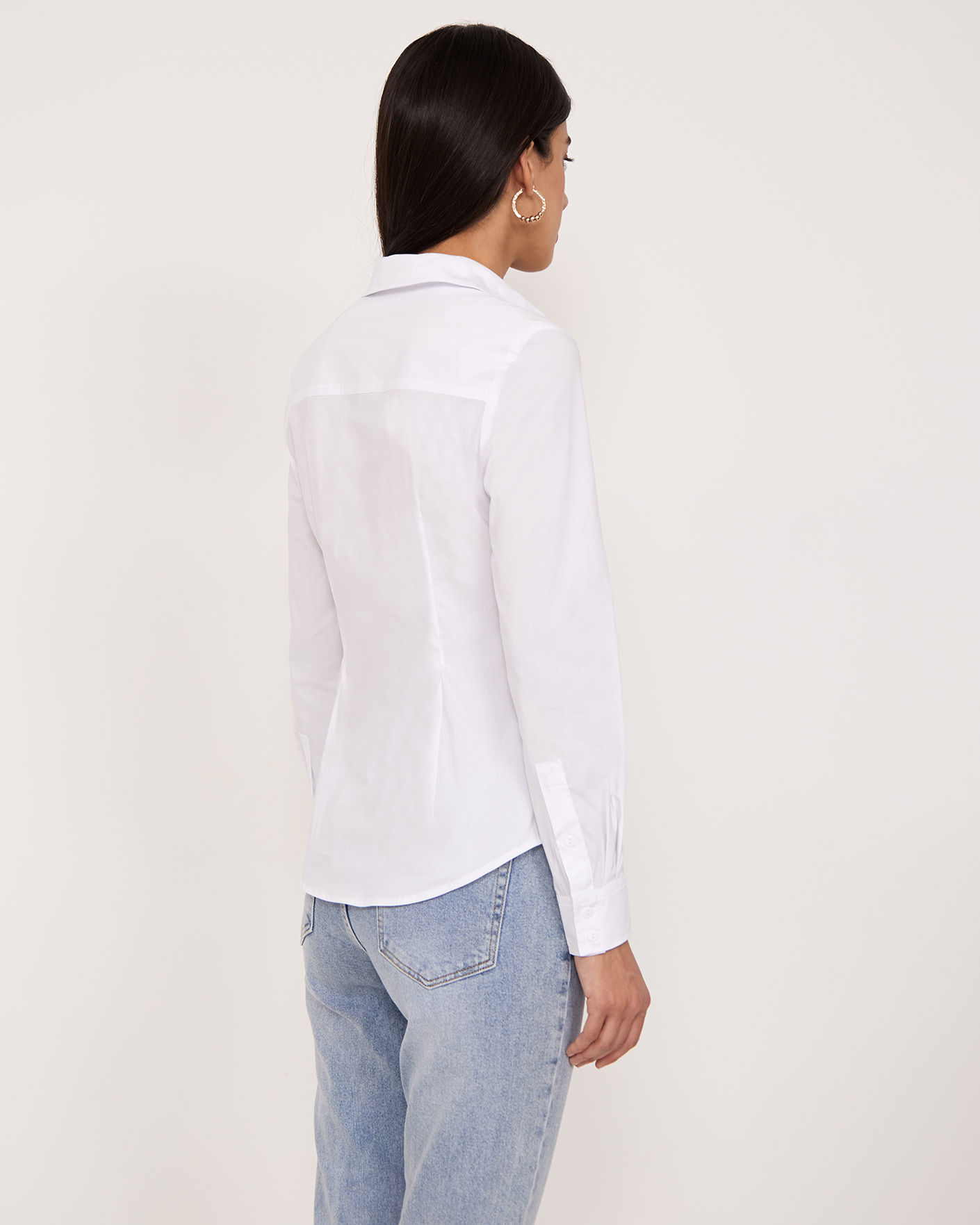 Классическая рубашка Emka белого цвета. Хлопковая приталенная модель с отложным воротником и застежкой на скрытые пуговицы. Рубашку можно сочетать с жилетом, жакетом, кардиганом, джемпером, юбкой и брюками.