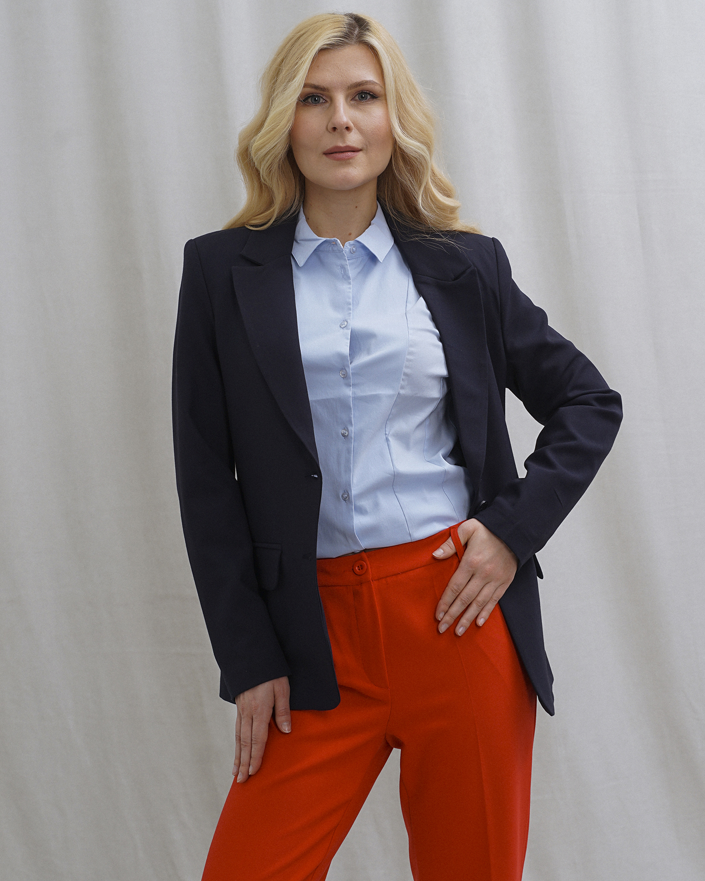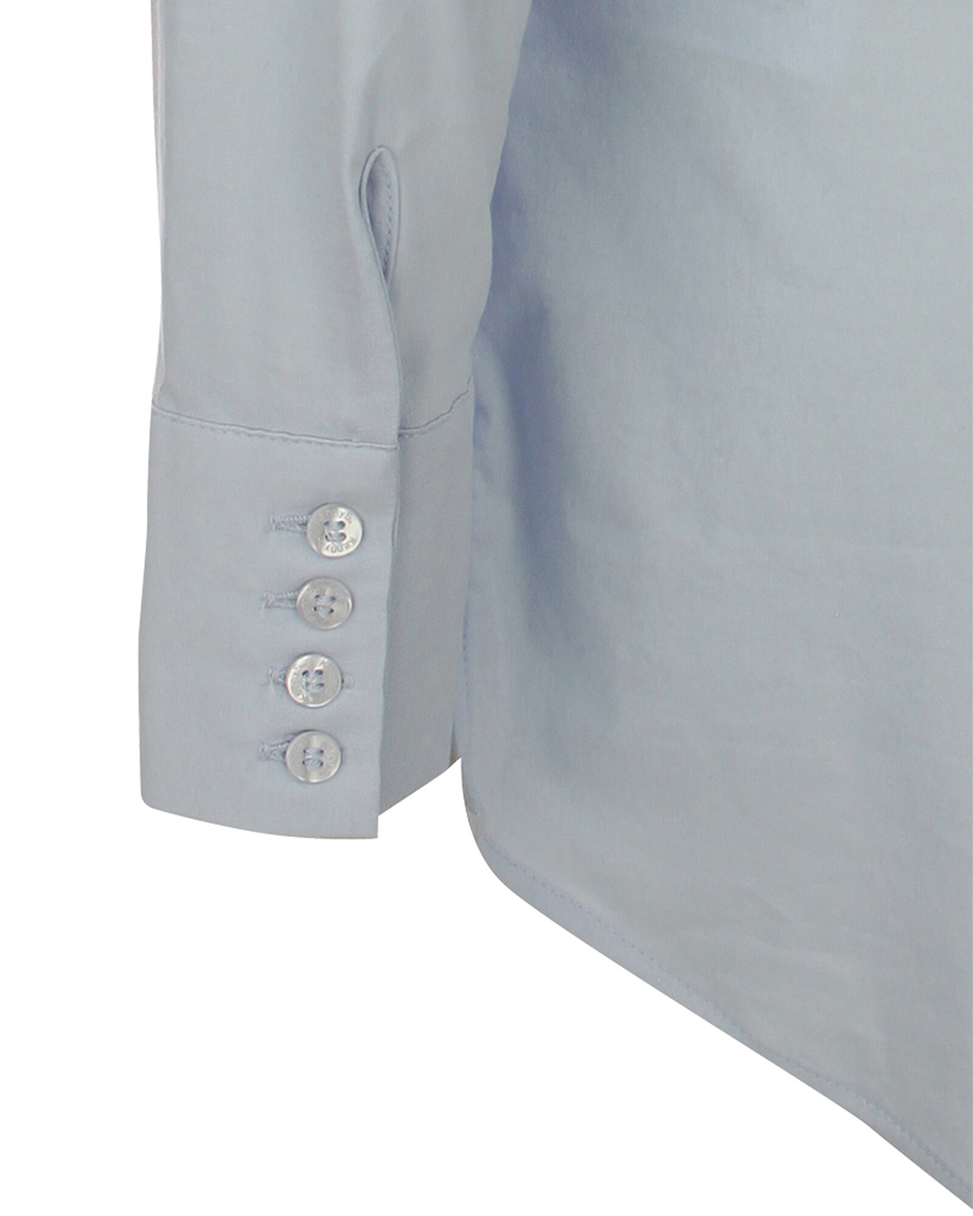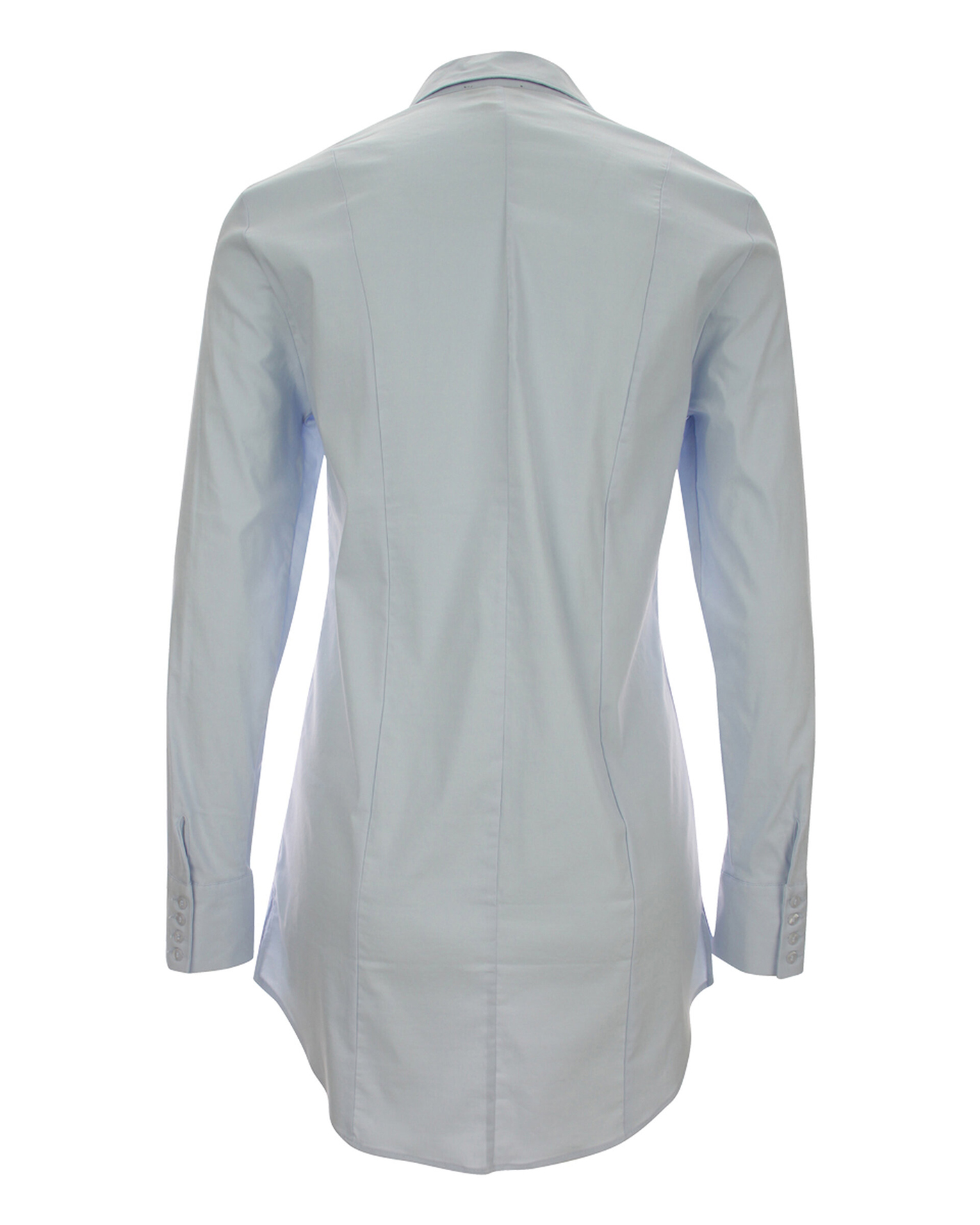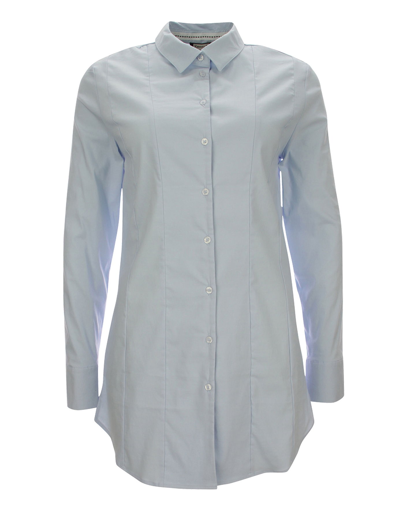 Приталенная рубашка Kenny S. серо-голубого цвета с декоративными строчками. Модель с отлодным воротником и застежкой на пуговицы. Удлиненная модель с закругленными боковыми разрезами. Стильная рубашка отлично сочетается с жилетом, жакетом, джемпером, кардиганом, юбкой и брюками.