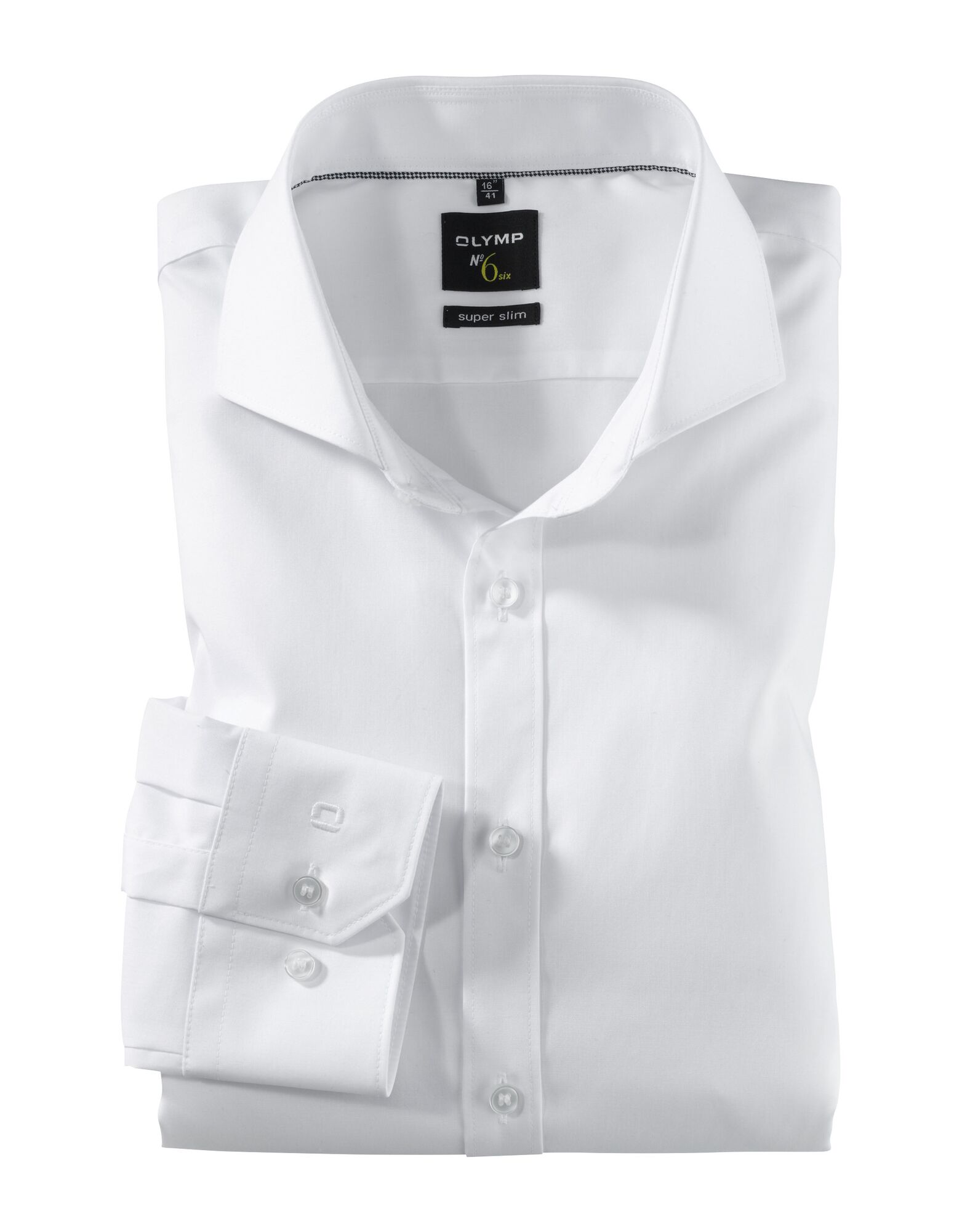 Облегающая белая деловая рубашка линии OLYMP Number Six. Экстремальный воротник "акулы", округлые комбинированные манжеты и узкая планка на пуговицах также подчеркивают стильный look спортивного мужчины.