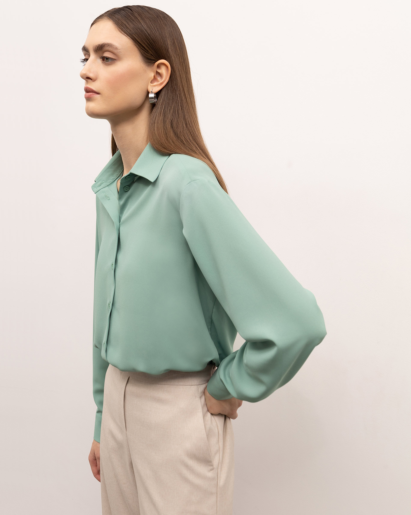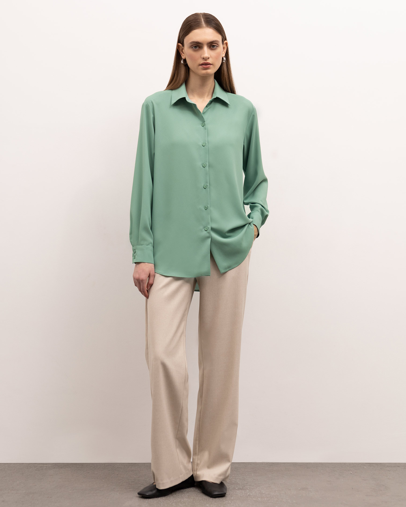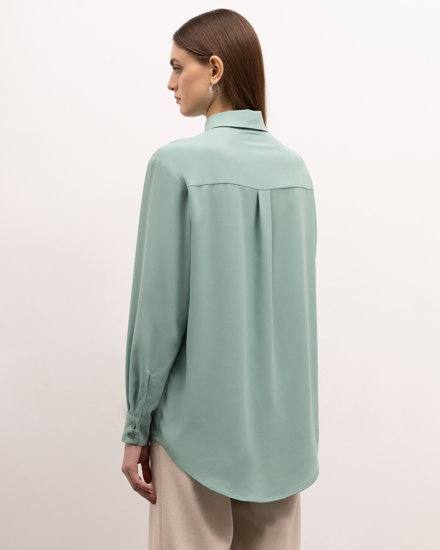 Свободная рубашка Emka зеленого цвета. Модель с отложным воротником, планкой на пуговицы в тон, широкие рукава с регулируемыми манжетами. Удлиненая спинка с закругленными краями. Рубашка отлично впишется в ваш повседневный гардероб.