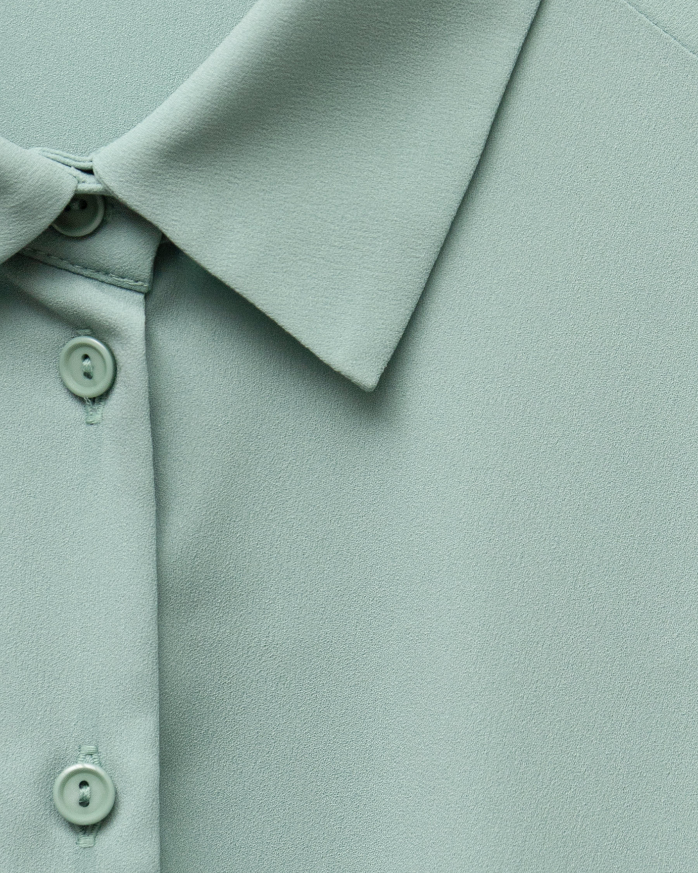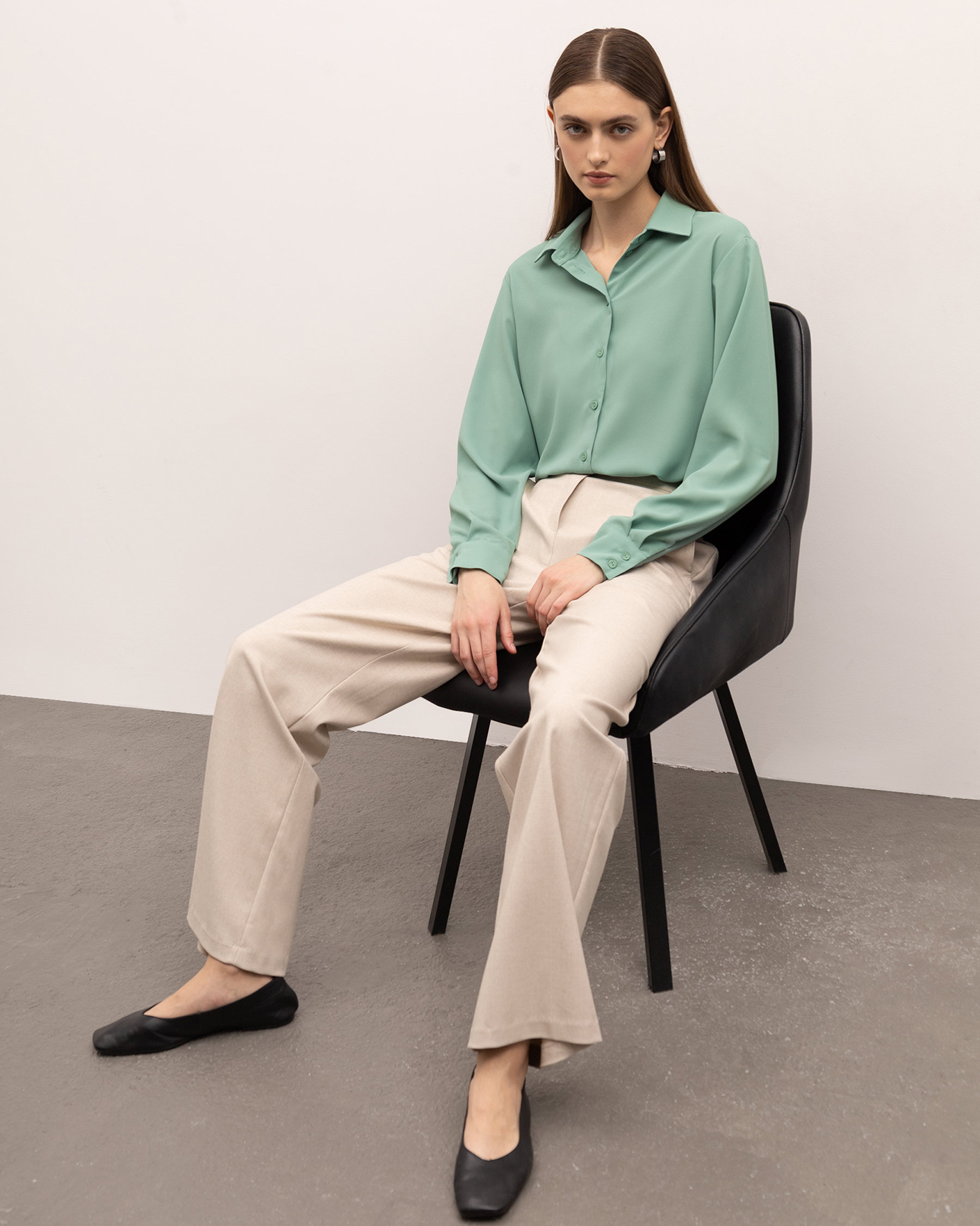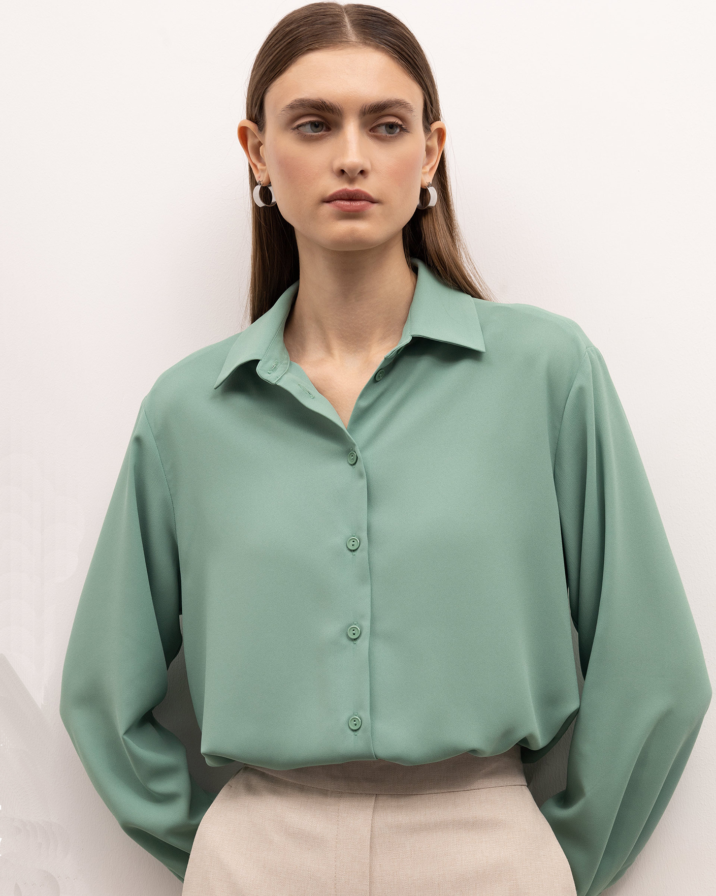 Свободная рубашка Emka зеленого цвета. Модель с отложным воротником, планкой на пуговицы в тон, широкие рукава с регулируемыми манжетами. Удлиненая спинка с закругленными краями. Рубашка отлично впишется в ваш повседневный гардероб.