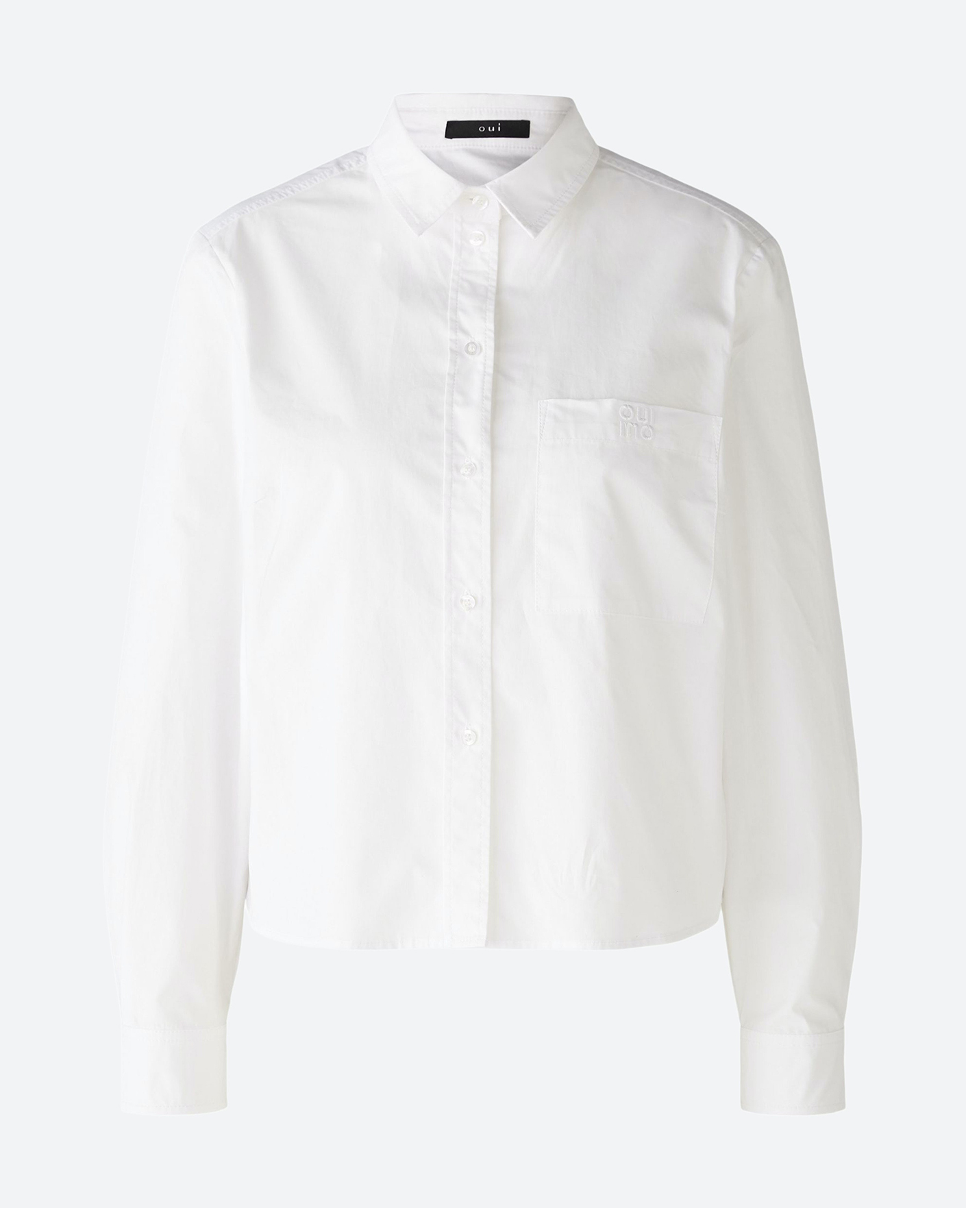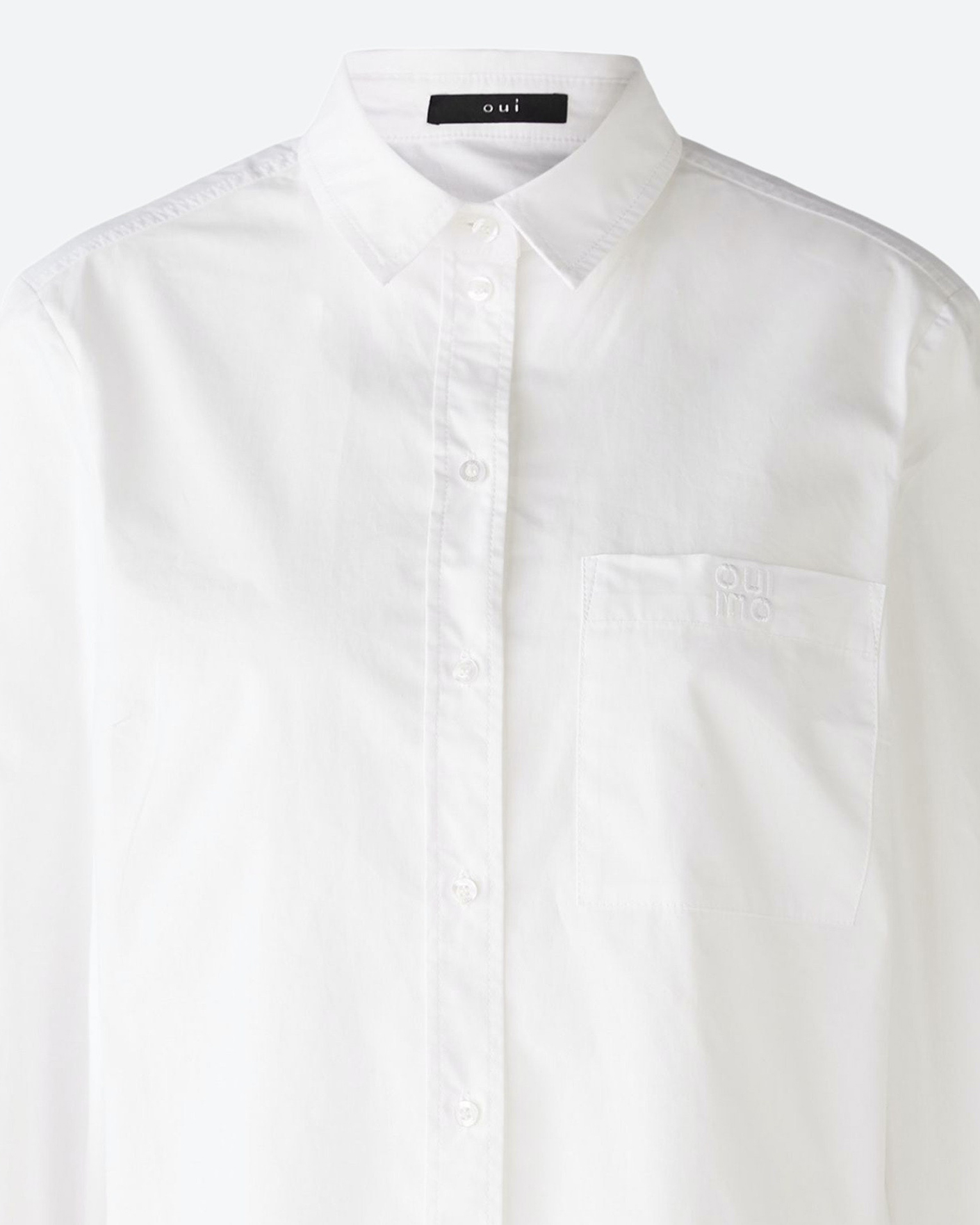 Свободная рубашка OUI белого цвета. Хлопковая модель с отложным воротником и застежкой на пуговицы в тон по всей длине. Также имеется накладной карман на груди с аккуратной вышивкой логотипа. Рубашка - базовая вещь повседневного гардероба.