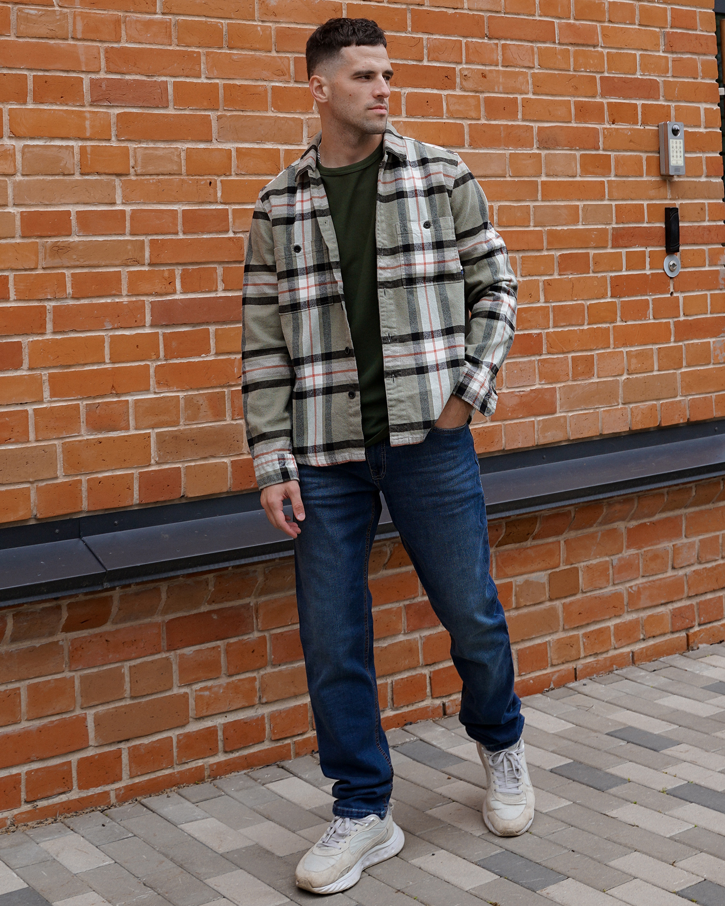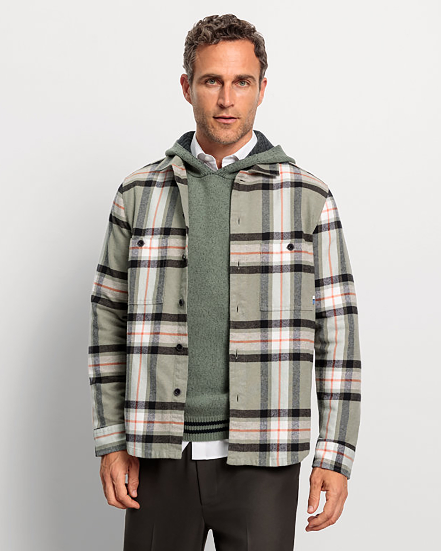 Рубашка-жакет Olump Casual оливкового цвета в крупную клетку и диагональную строчную полосу. Модель из 100% хлопка с отложным воротником, застежка на пуговицы, имеются накладные карманы на пуговицы на груди. Стильная рубашка-жакет станет фаворитом повседневного гардероба.