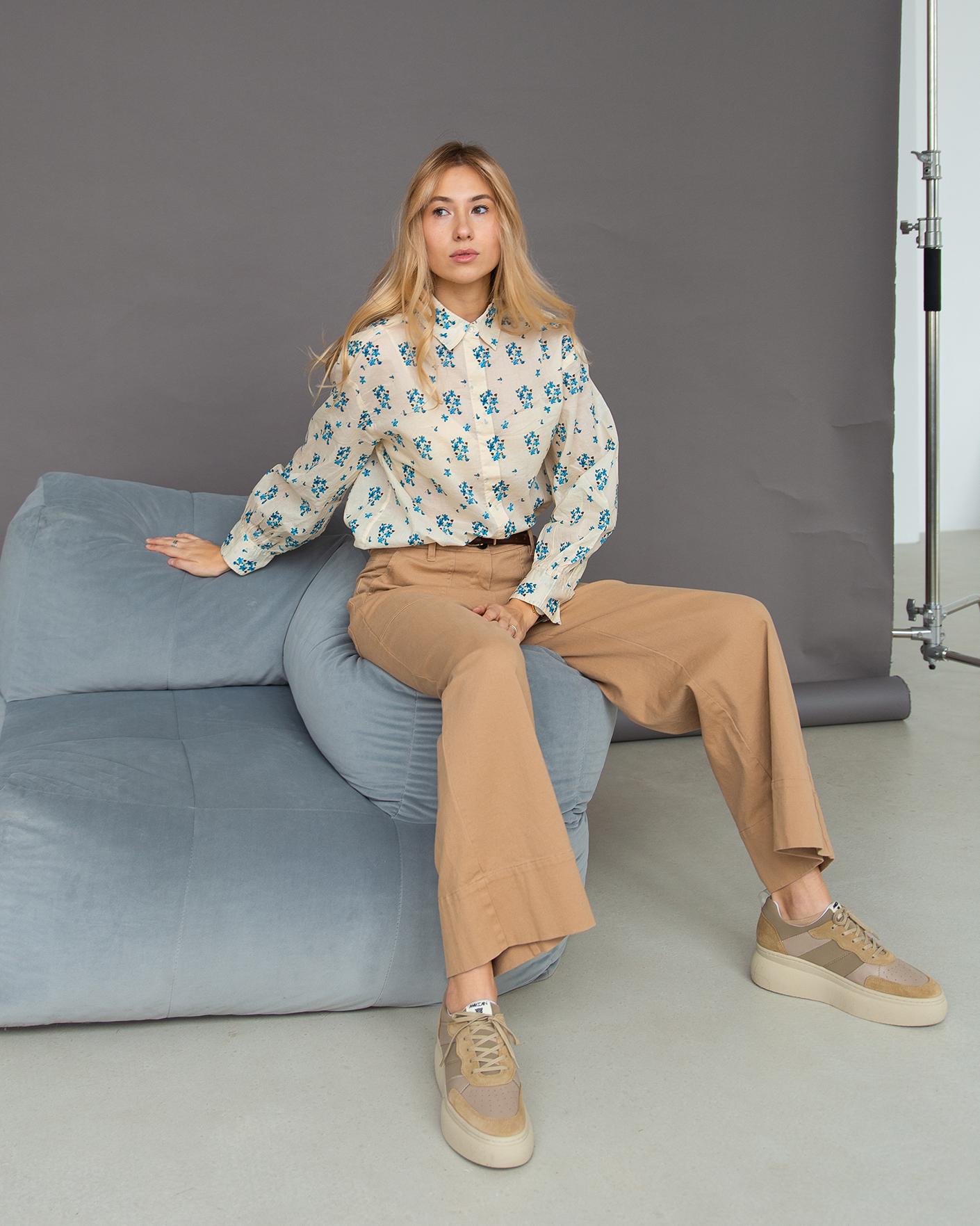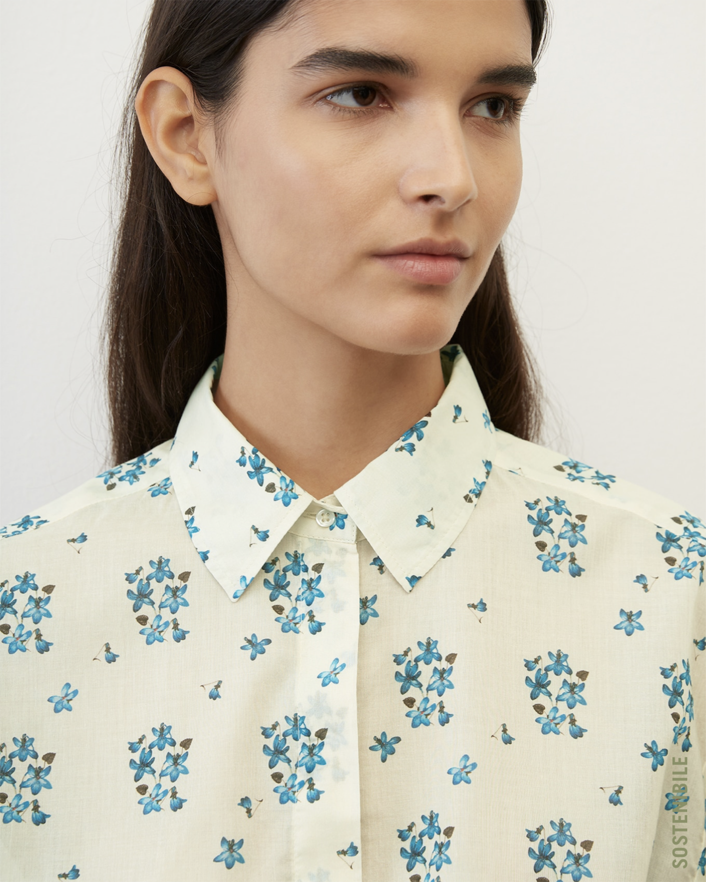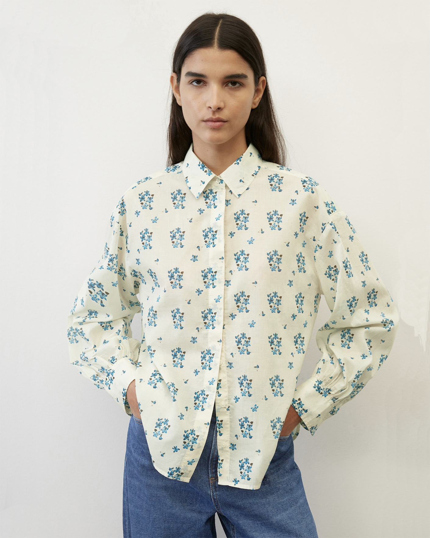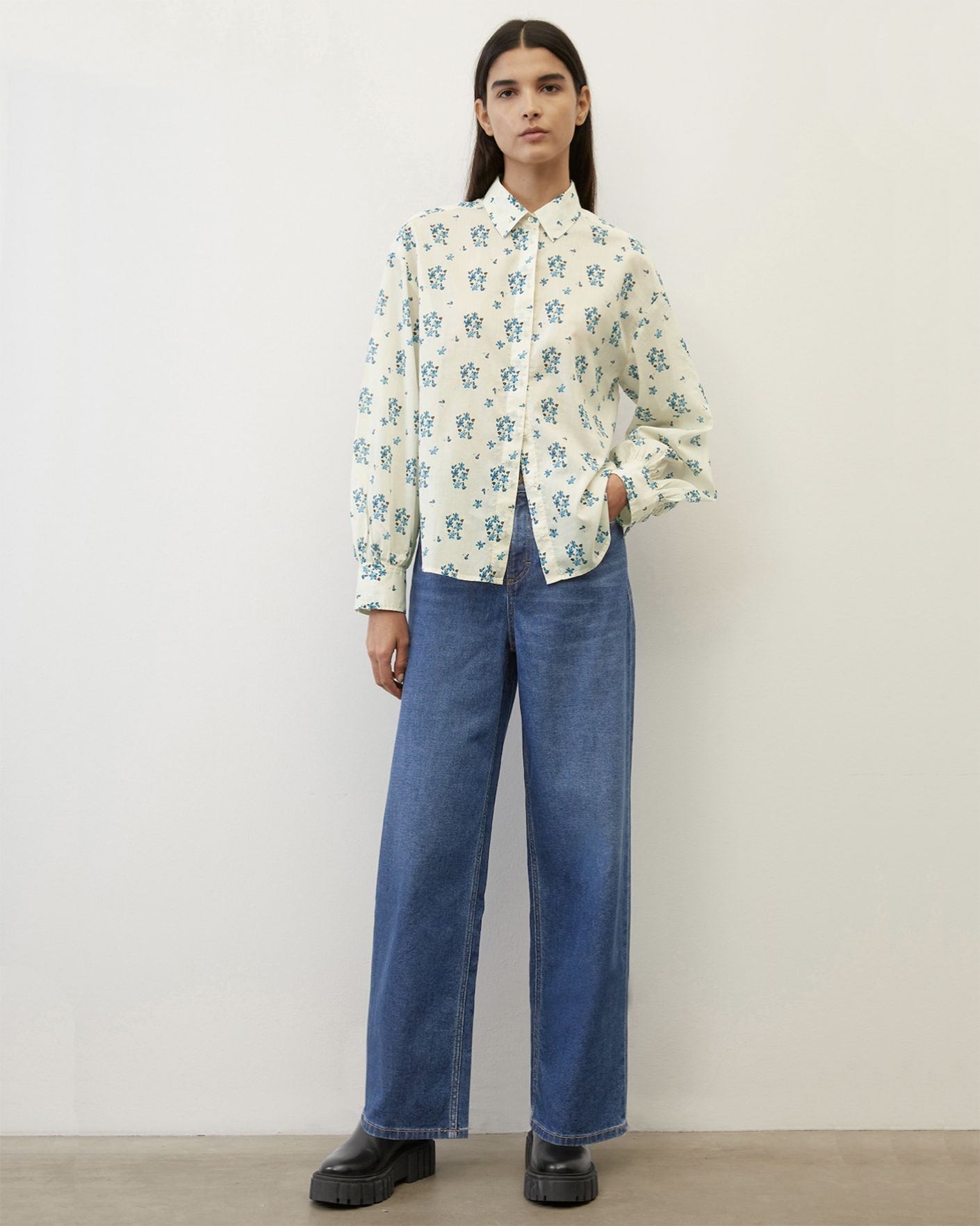 Свободная рубашка Marc O'Polo кремового цвета вмелкий цветочный рисунок. Модель с отложным воротником и скрытой планкой на пуговицы. Рубашку можно сочетать с джемпером, жилетом, жакетом, кардиганом, юбкой и брюками.