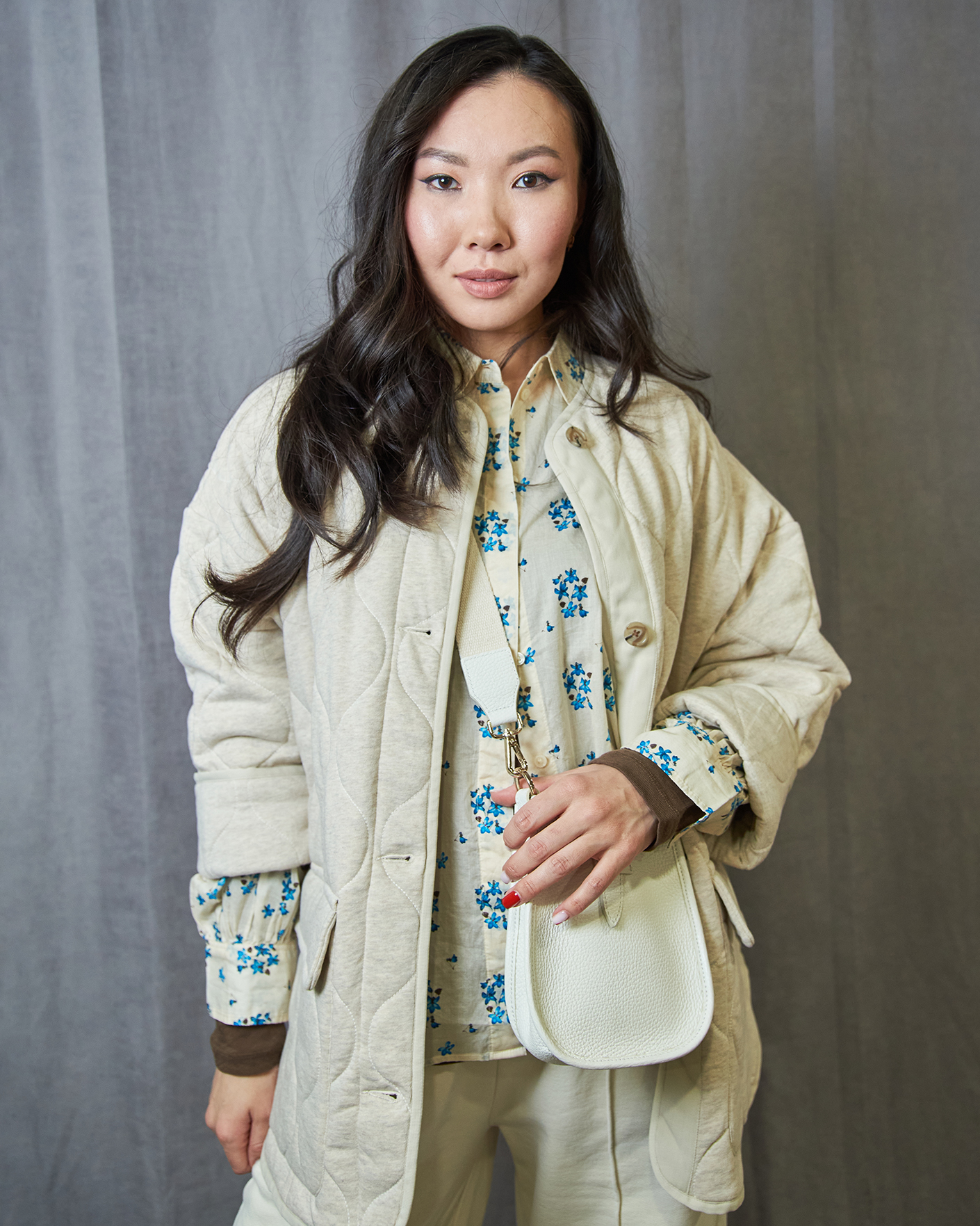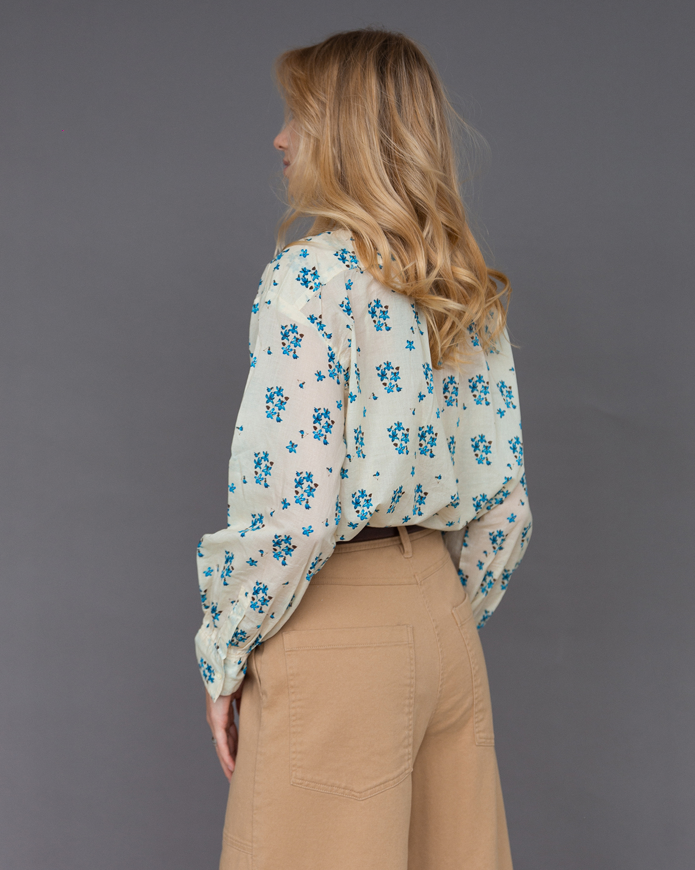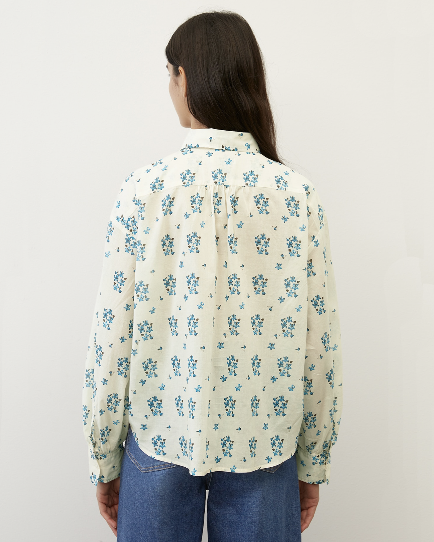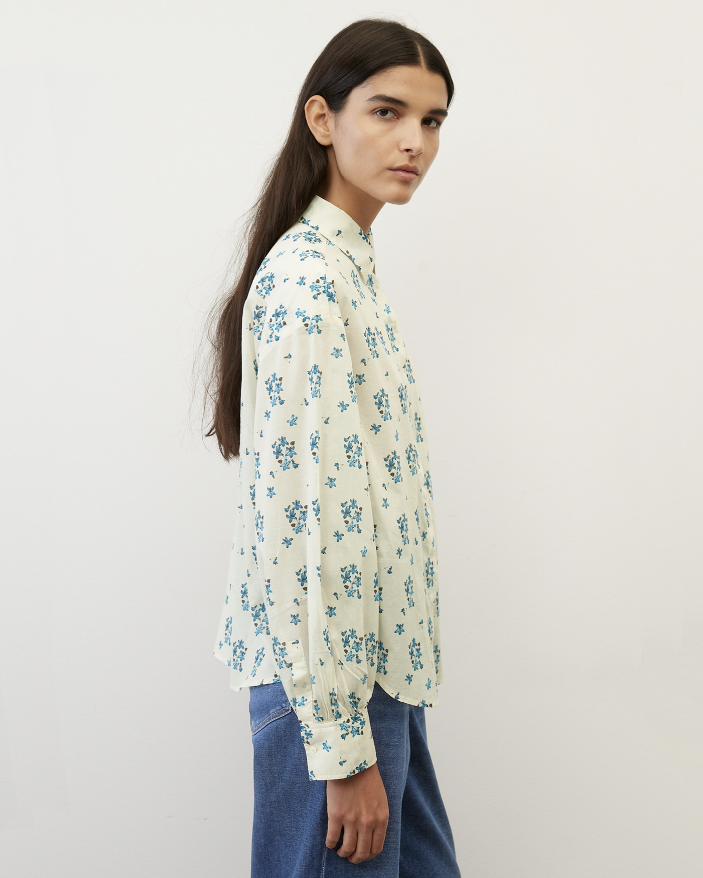 Свободная рубашка Marc O'Polo кремового цвета вмелкий цветочный рисунок. Модель с отложным воротником и скрытой планкой на пуговицы. Рубашку можно сочетать с джемпером, жилетом, жакетом, кардиганом, юбкой и брюками.