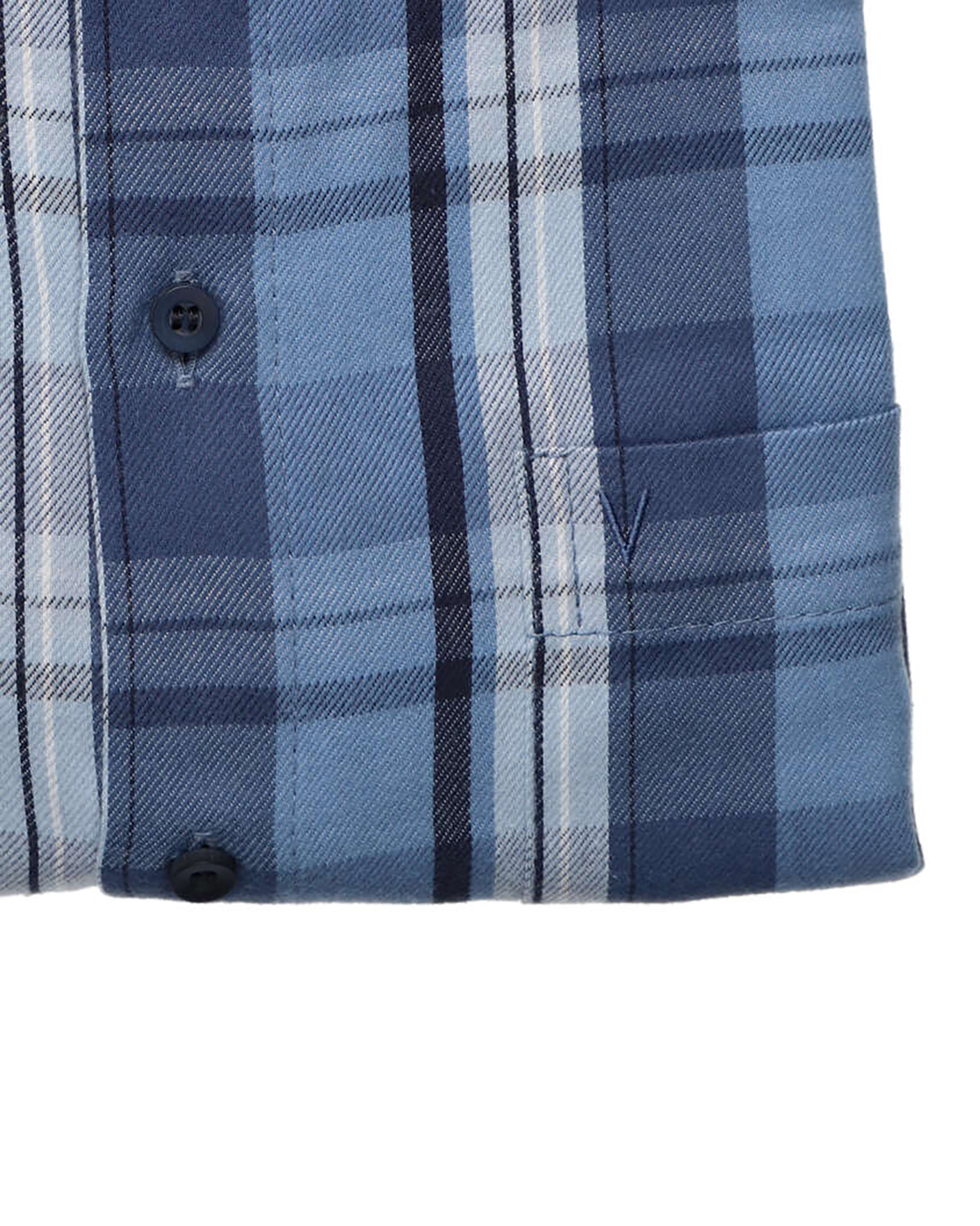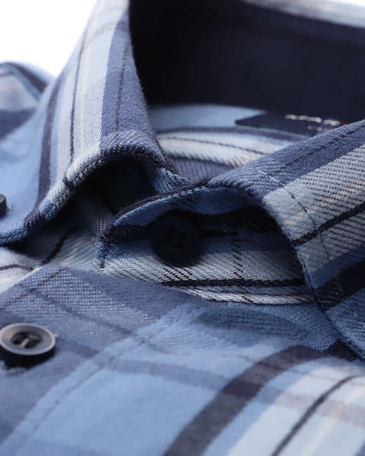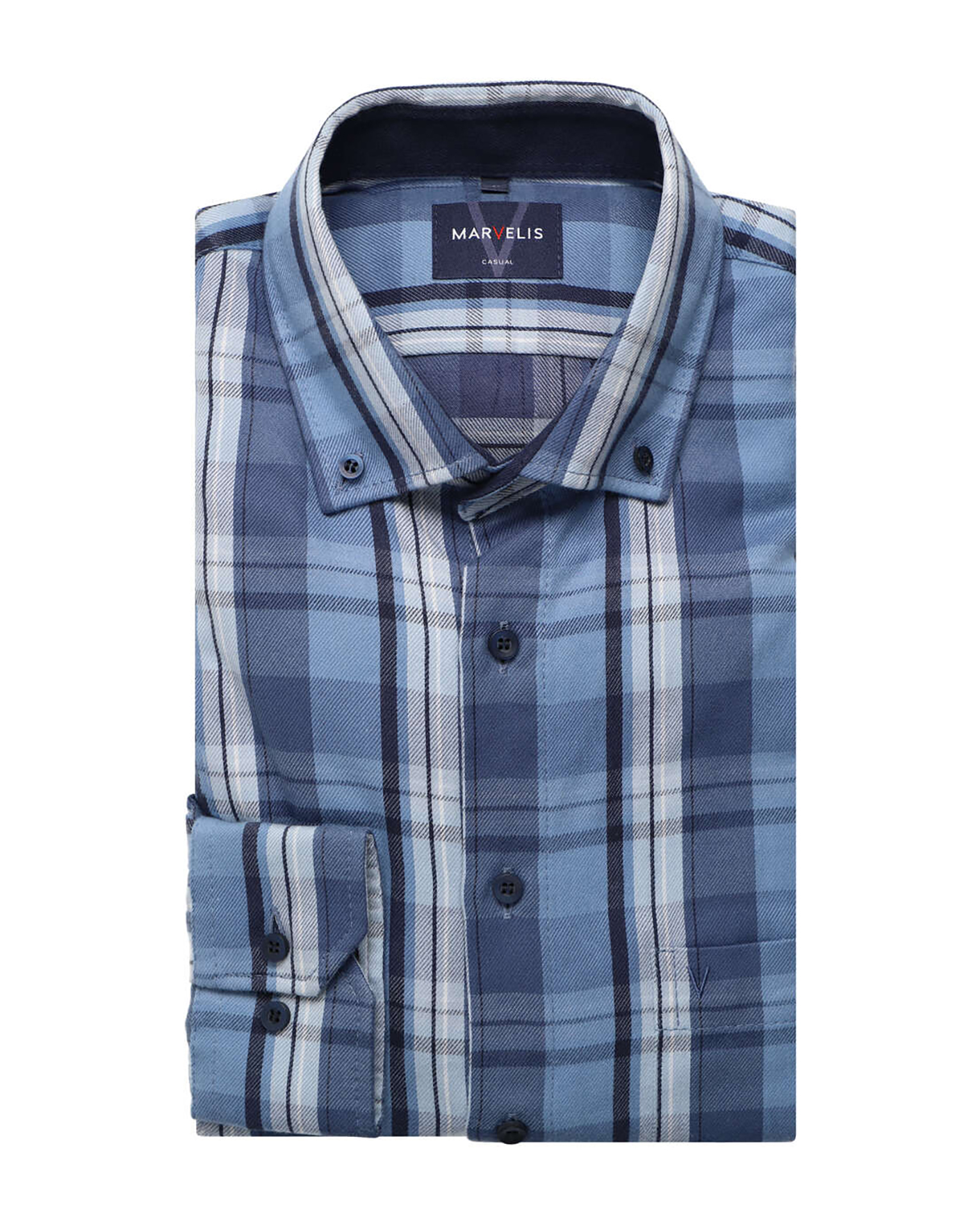 Повседневная рубашка Marvelis Modern Fit сине-голубого цвета в крупную клетку. Модель с воротником Button-Down, с нагрудным накладным карманом. Рубашка идеально сочетается с жилетом, футболкой, тонкой водолазкой и джинсами.