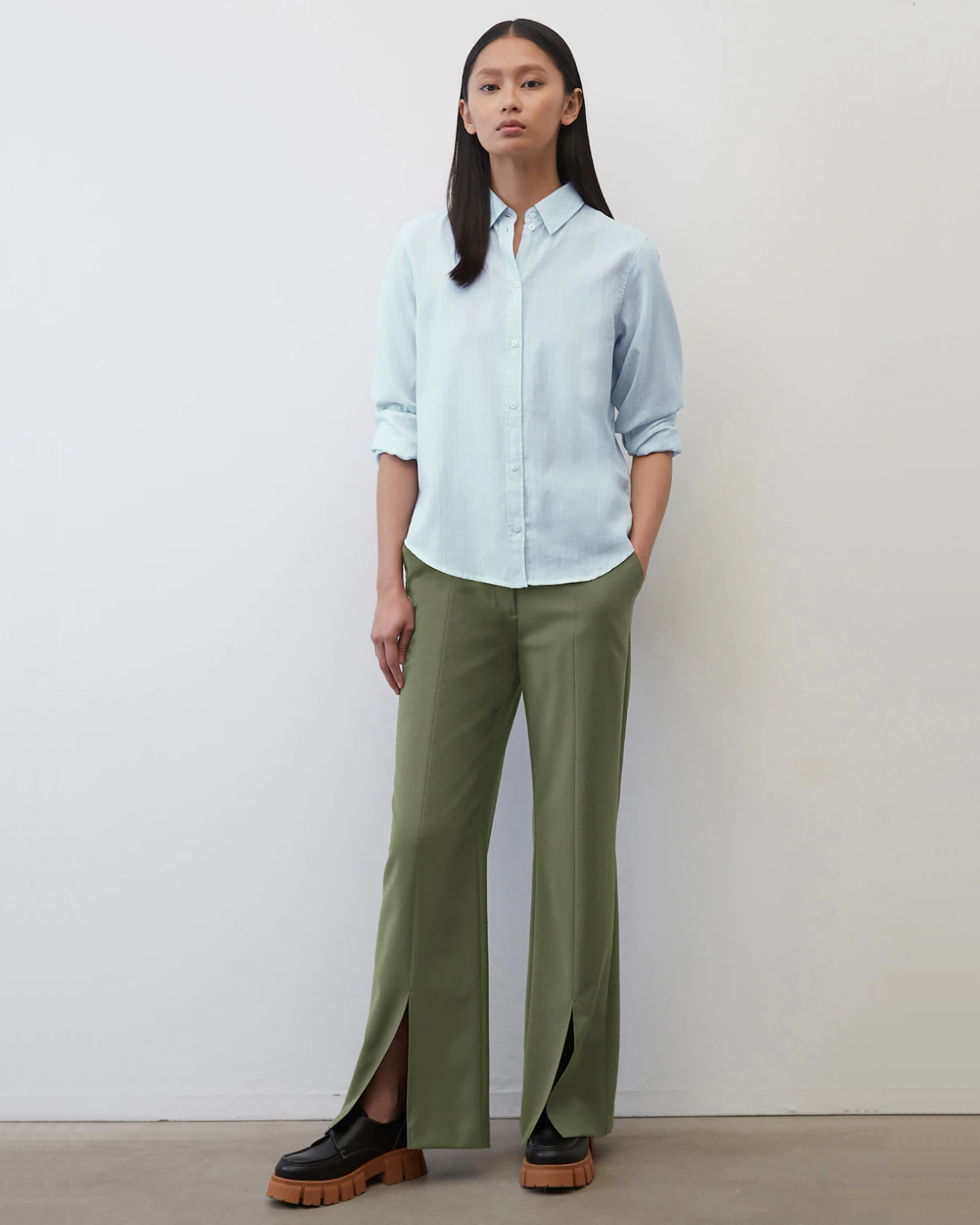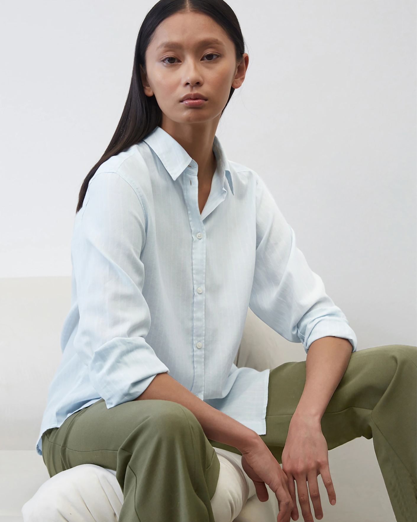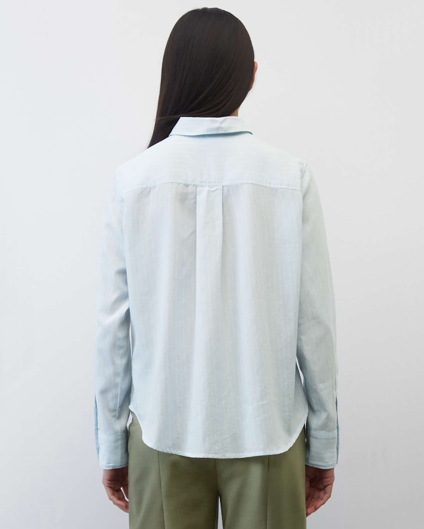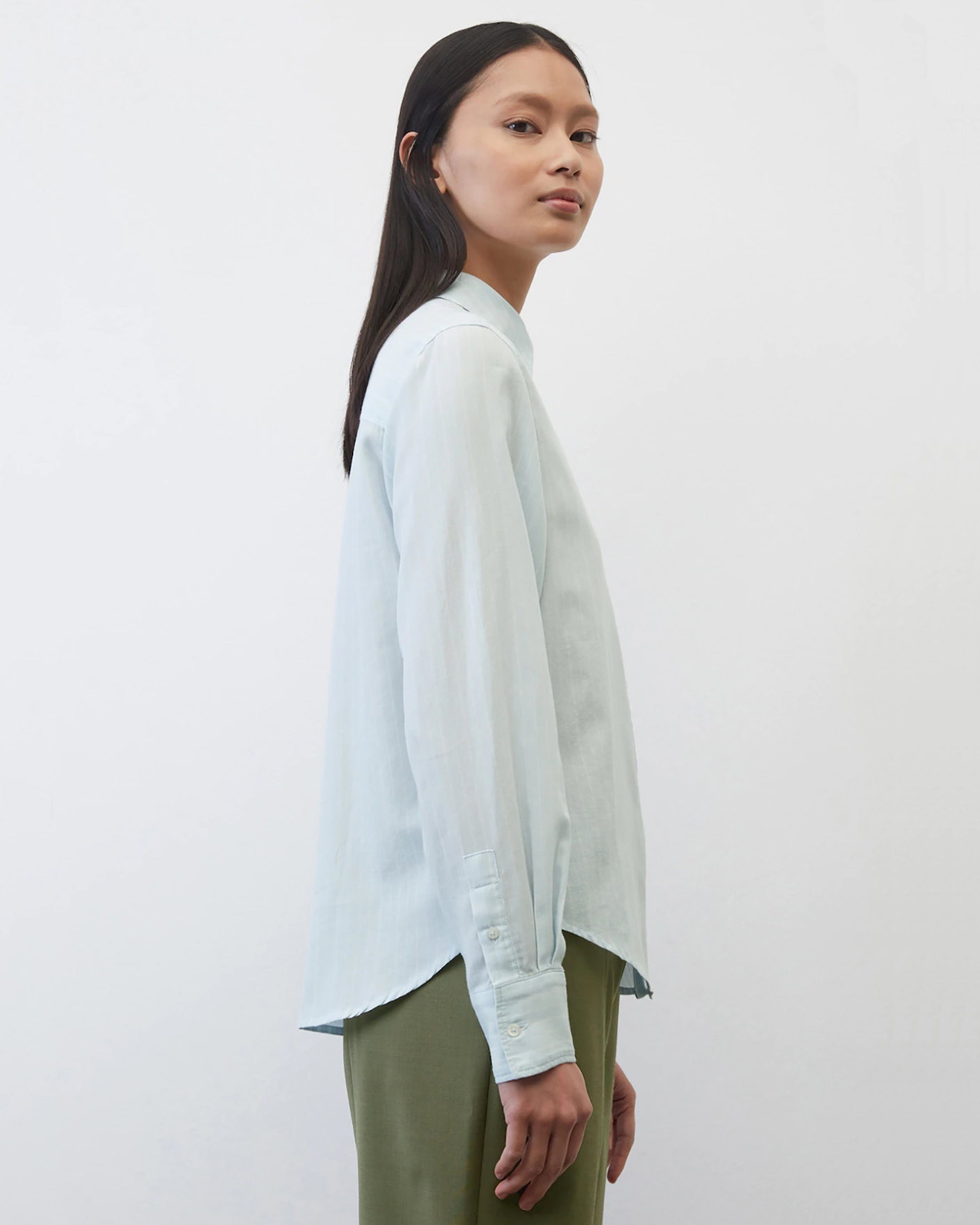 Свободная рубашка Marc O'Polo голубого цвета в узкую вертикальную полосу. Модель из 100% хлопка с отложным воротником и планкой на пуговицы. Закругленный низ со слегка удлиненной спинкой. Рубашку можно сочетать с жилетом, жакетом, кардиганом и джемпером.