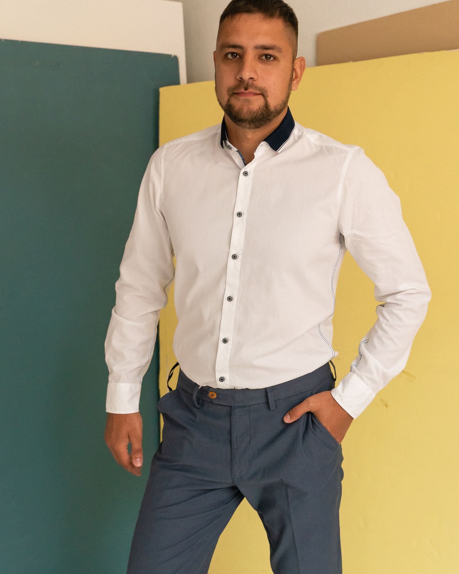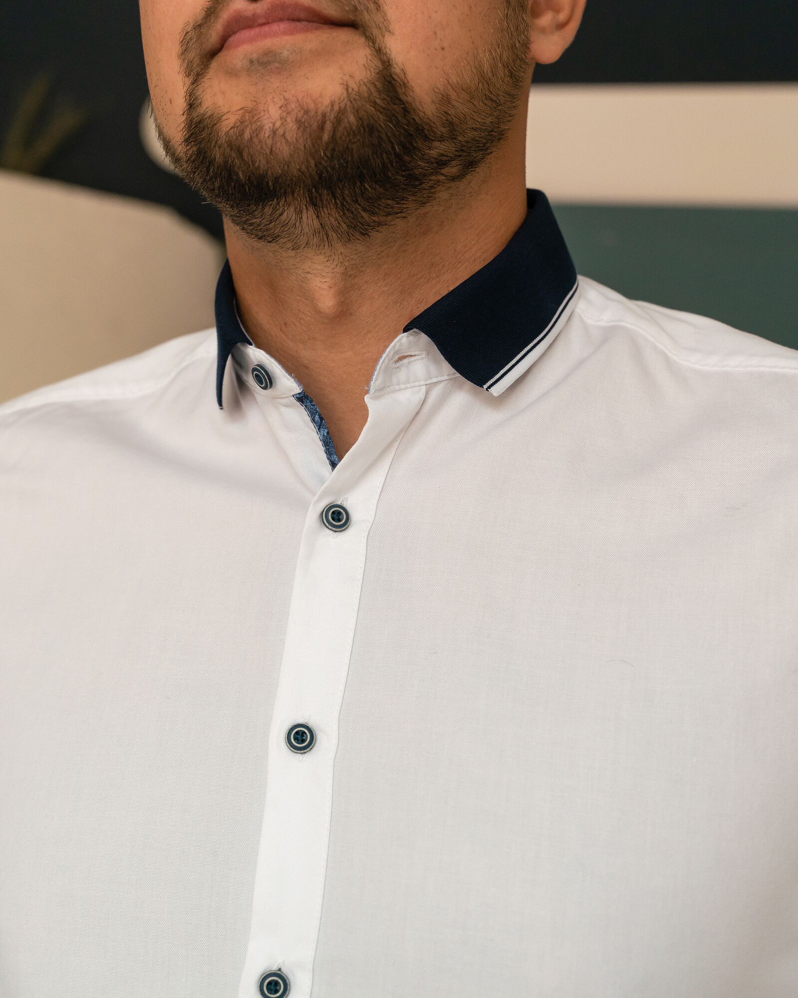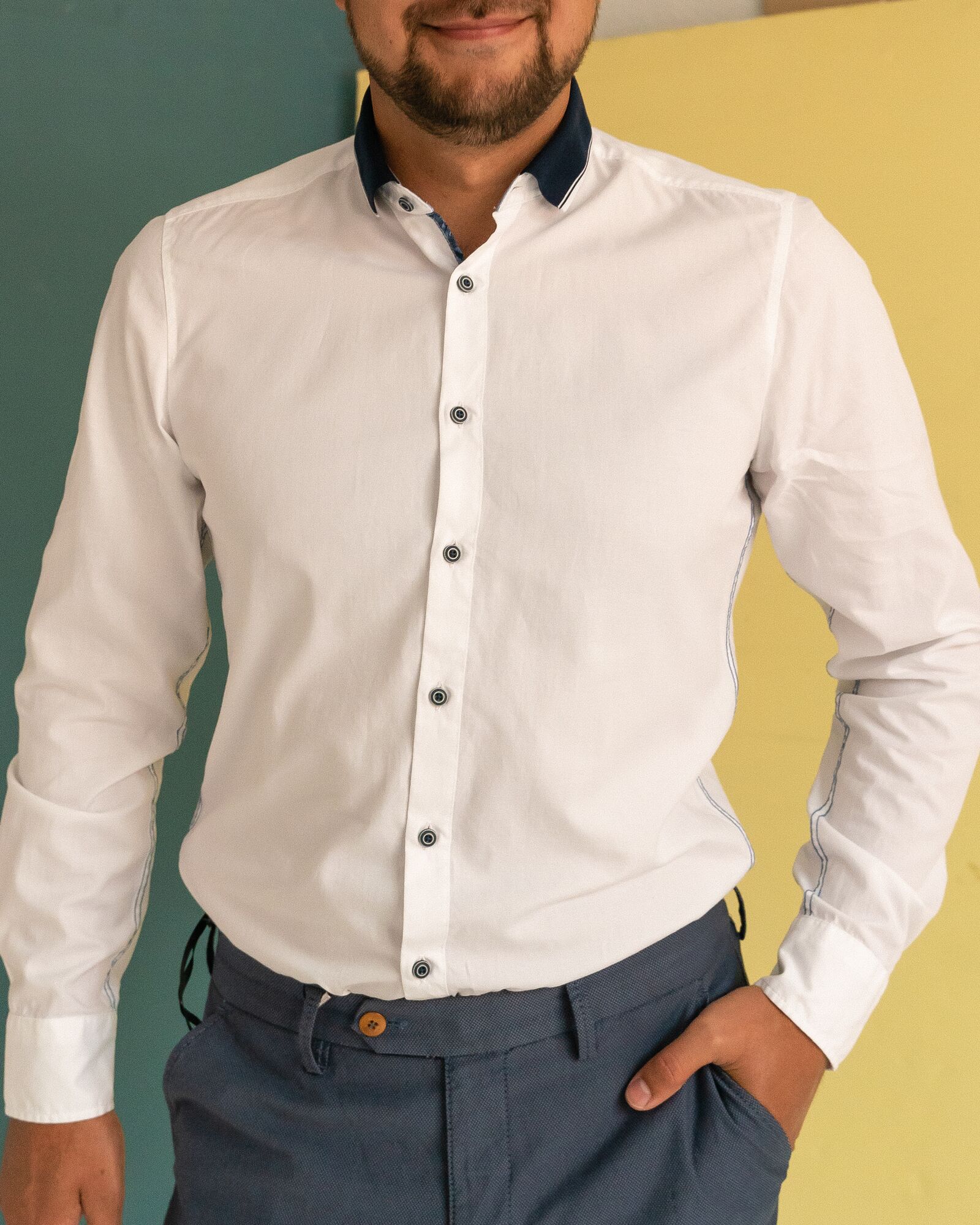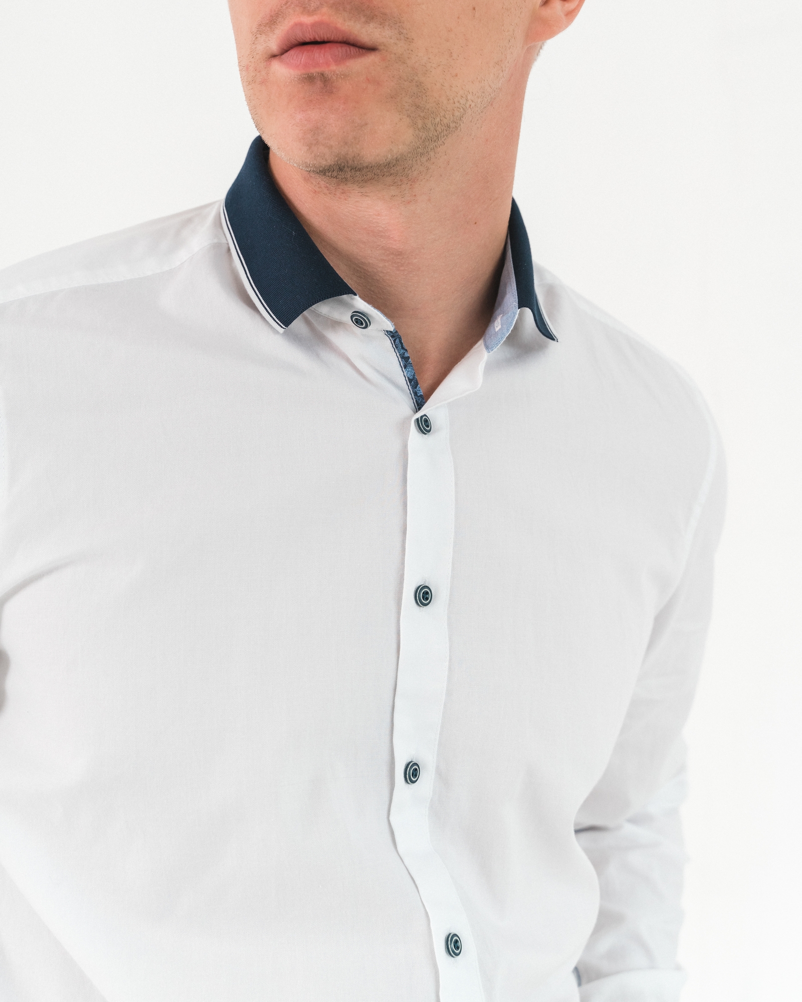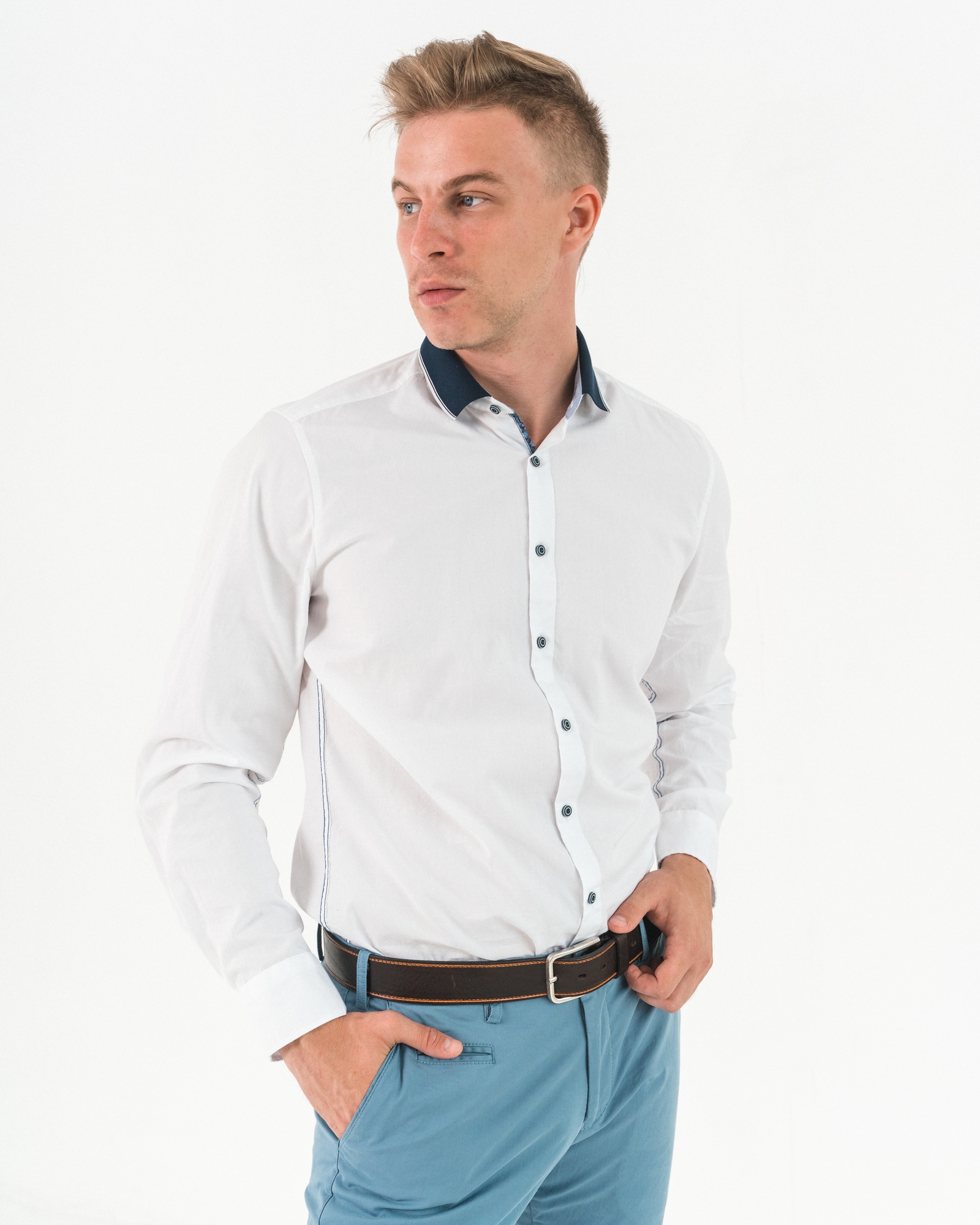Классическая белая рубашка из 100% хлопка. Контрастные пуговицы, отложной воротник синего цвета и боковая синяя строчка делают рубашку стильной и деловой.