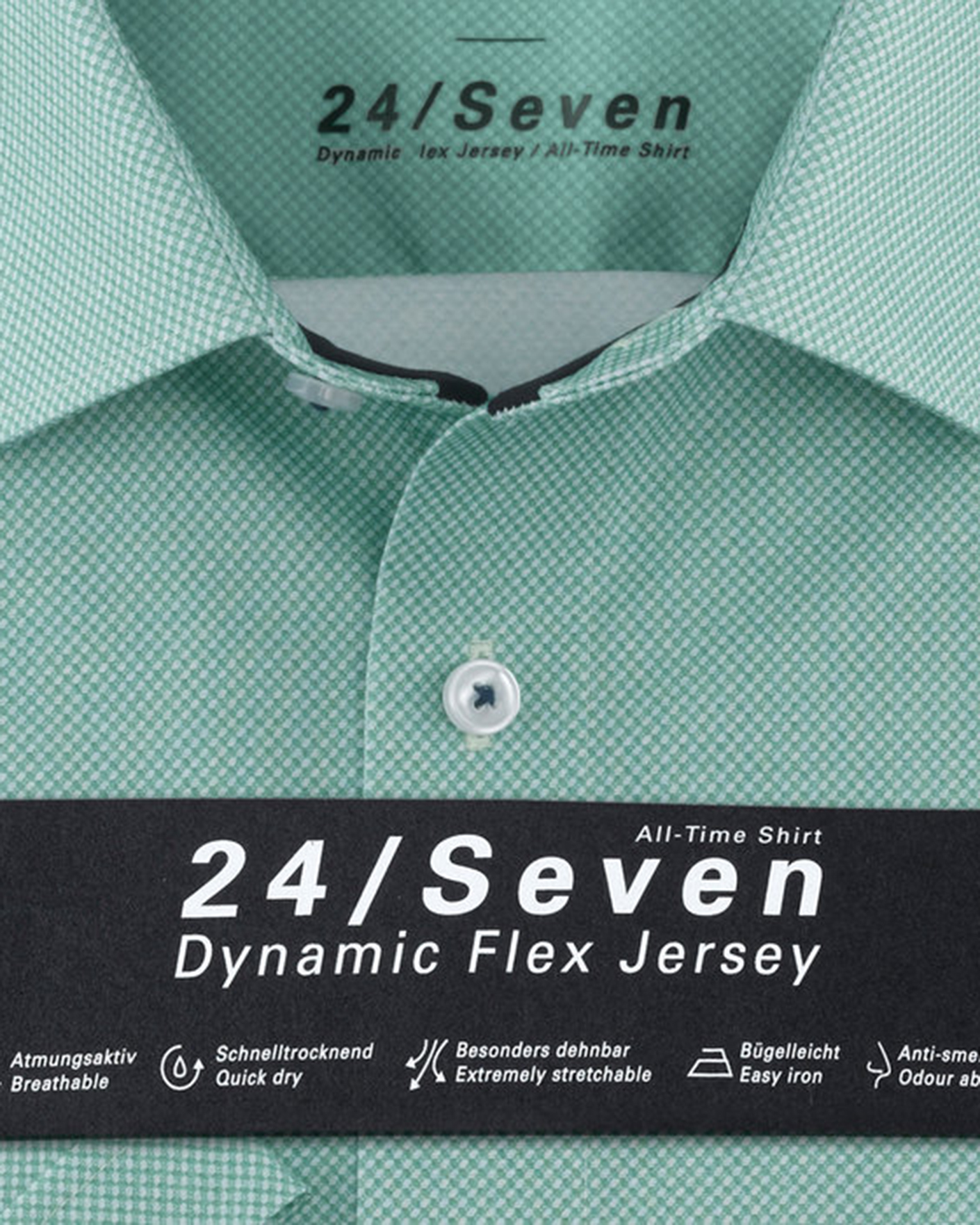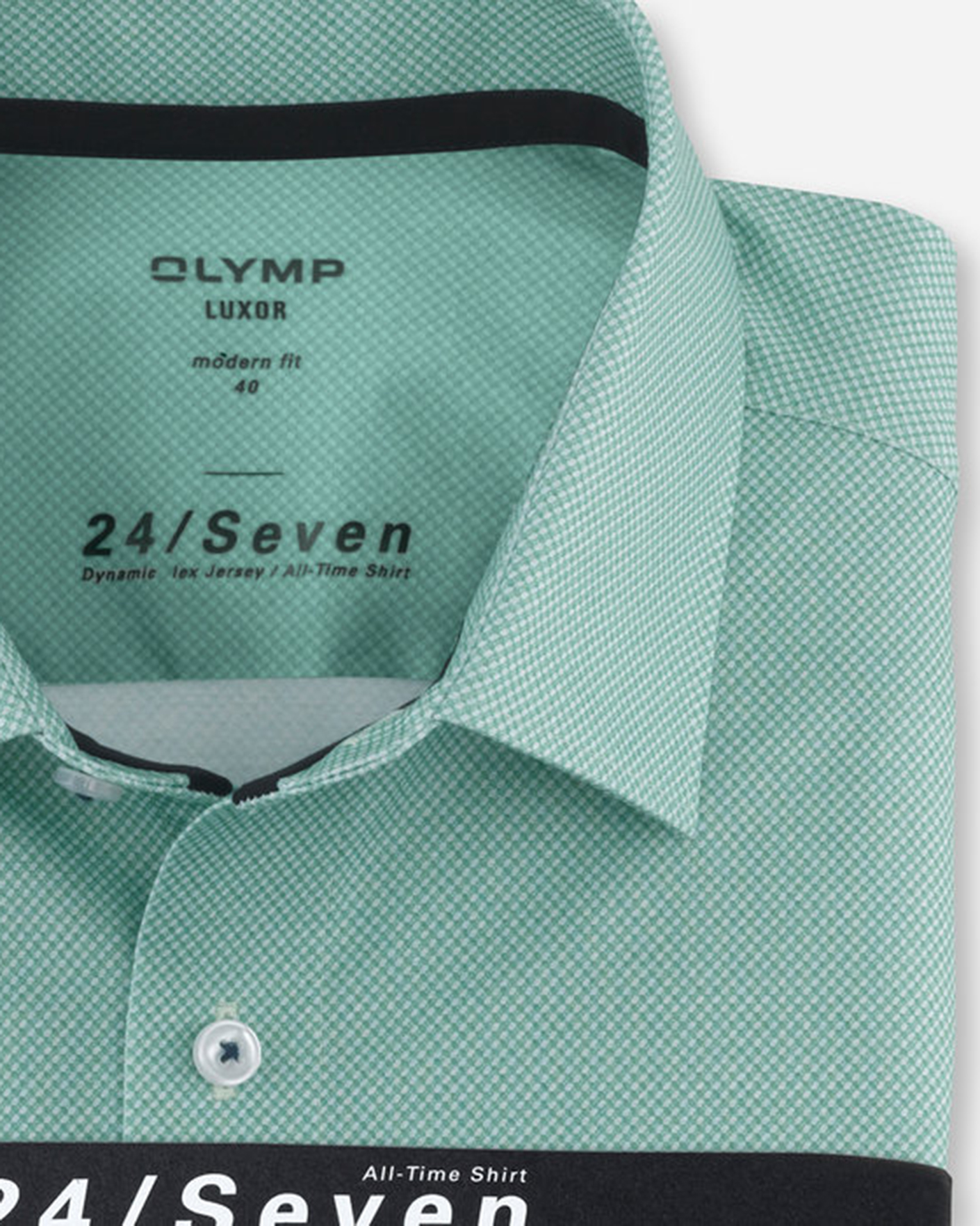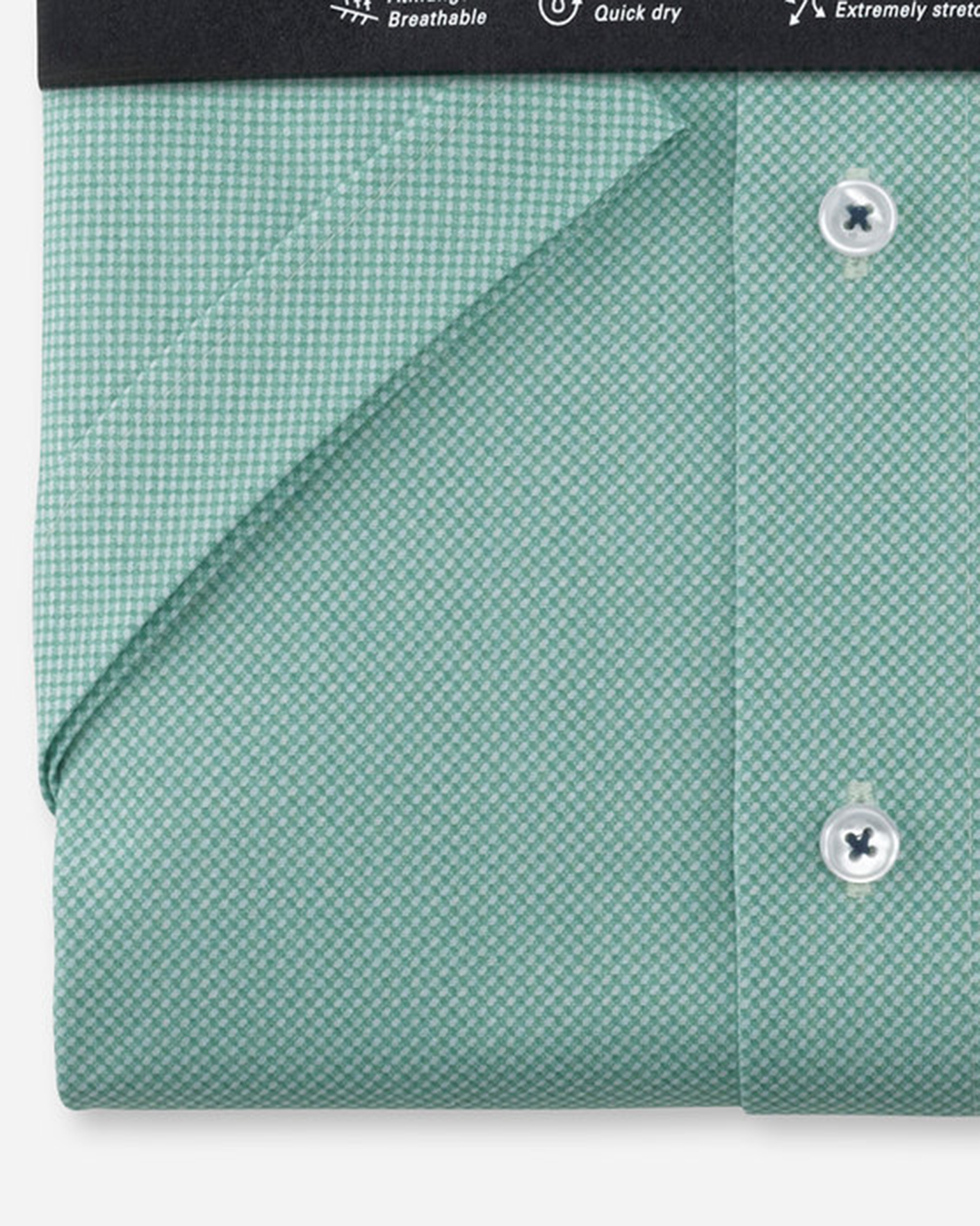 Рубашка с короткими рукавами OLYMP Luxor светло-зеленого цвета в мелкий диагональный рисунок. Модель с воротником New Kent с внутренней отделкой, планка на пуговицы белого цвета. Универсальная рубашка для вашего делового гардероба.