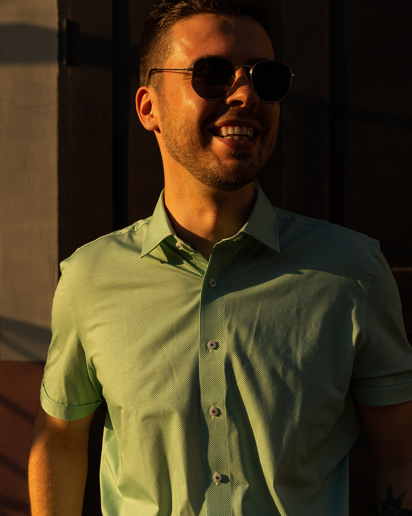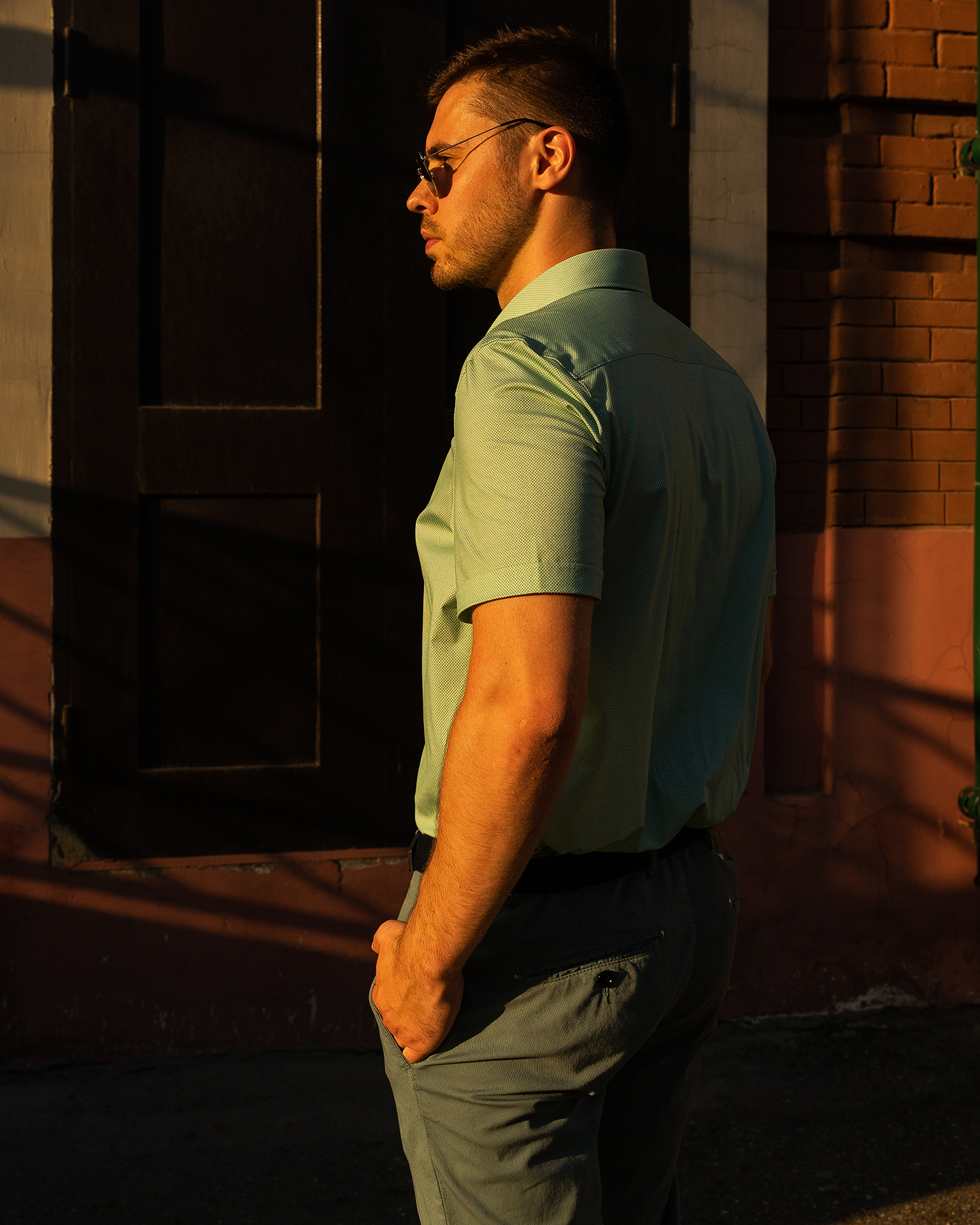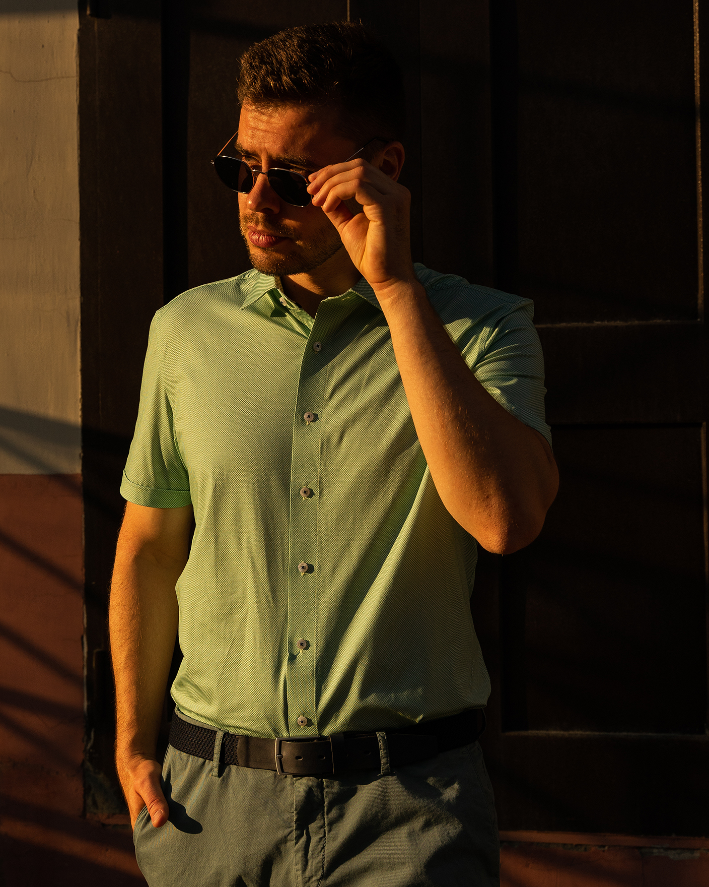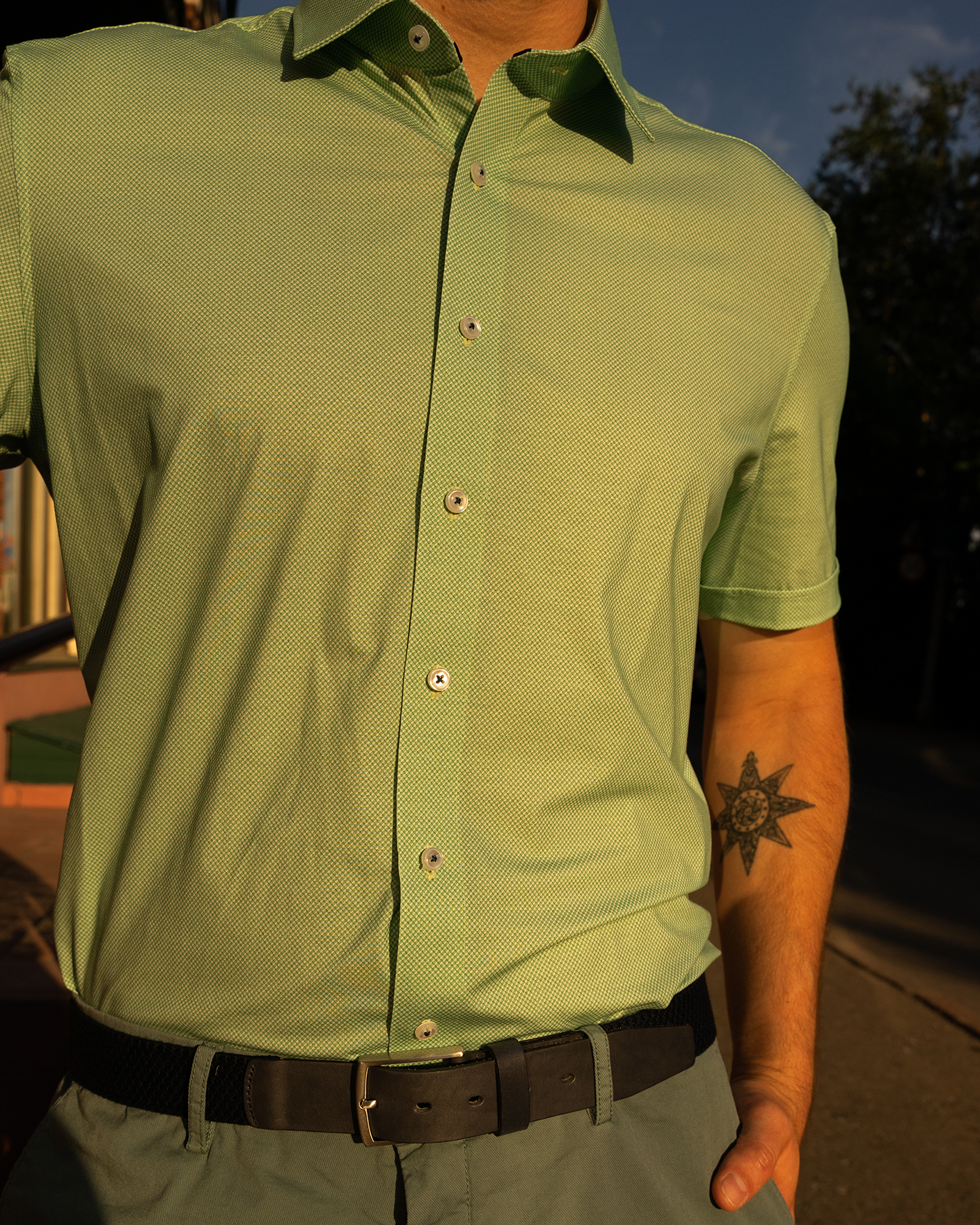 Рубашка с короткими рукавами OLYMP Luxor светло-зеленого цвета в мелкий диагональный рисунок. Модель с воротником New Kent с внутренней отделкой, планка на пуговицы белого цвета. Универсальная рубашка для вашего делового гардероба.