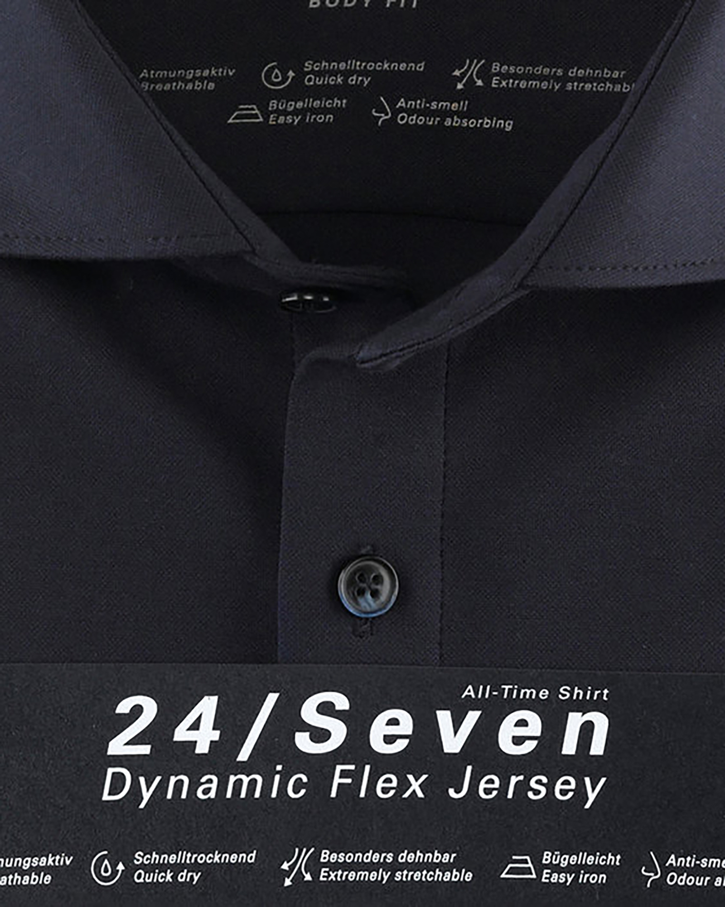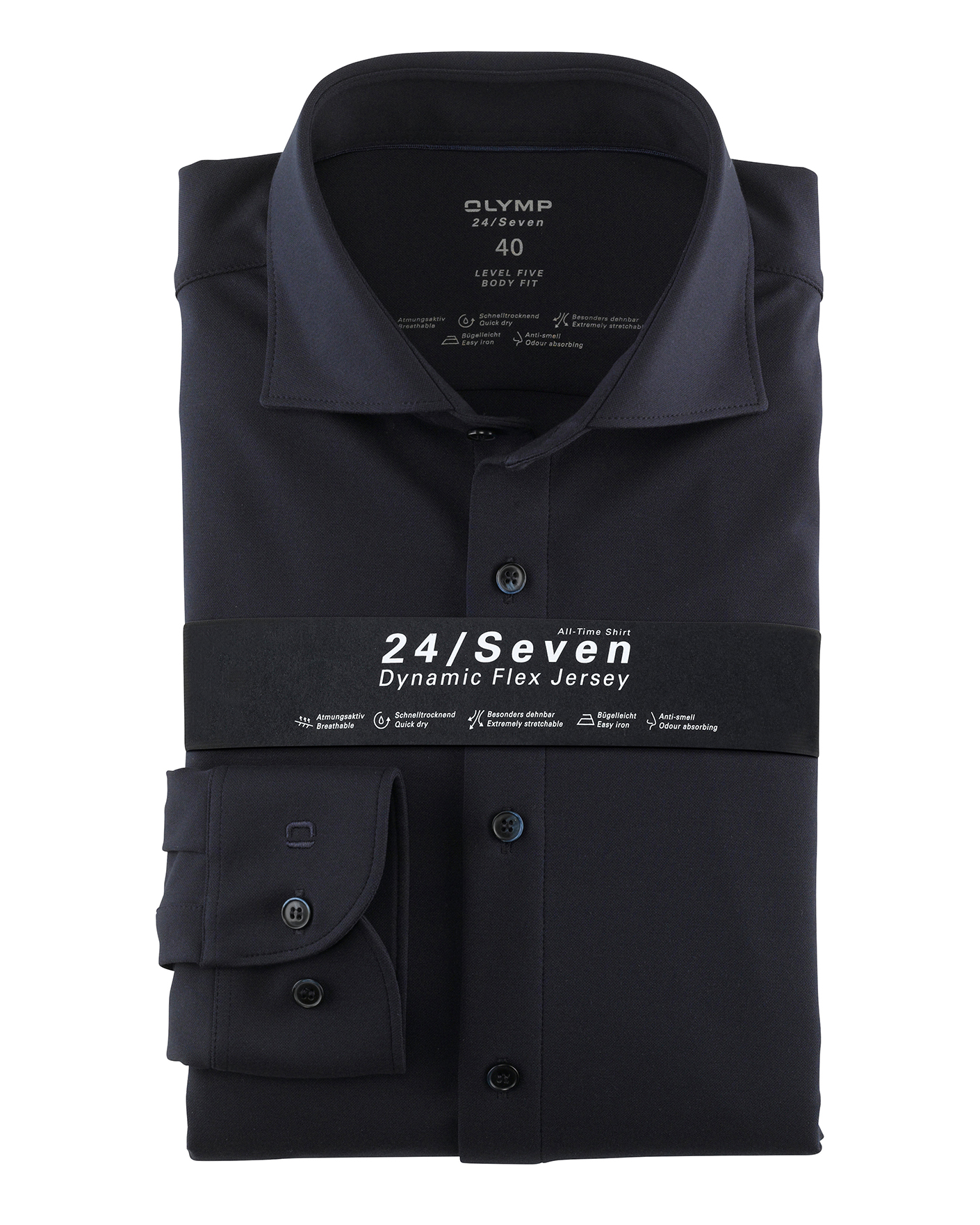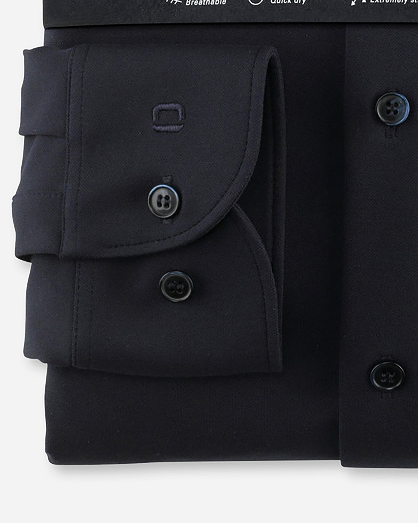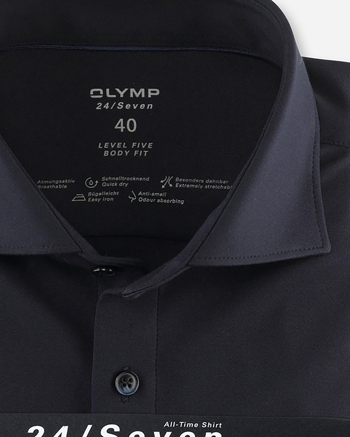 Рубашка Olymp Level Five 24/Seven темно-синего цвета. Модель с воротником Kent. Облегающая посадка разработана для стройной спортивной фигуры, обеспечивающая максимальный комфорт. Рубашка убедительно подходит для деловых встреч и деловых обедов, а затем и для частных вечеринок.