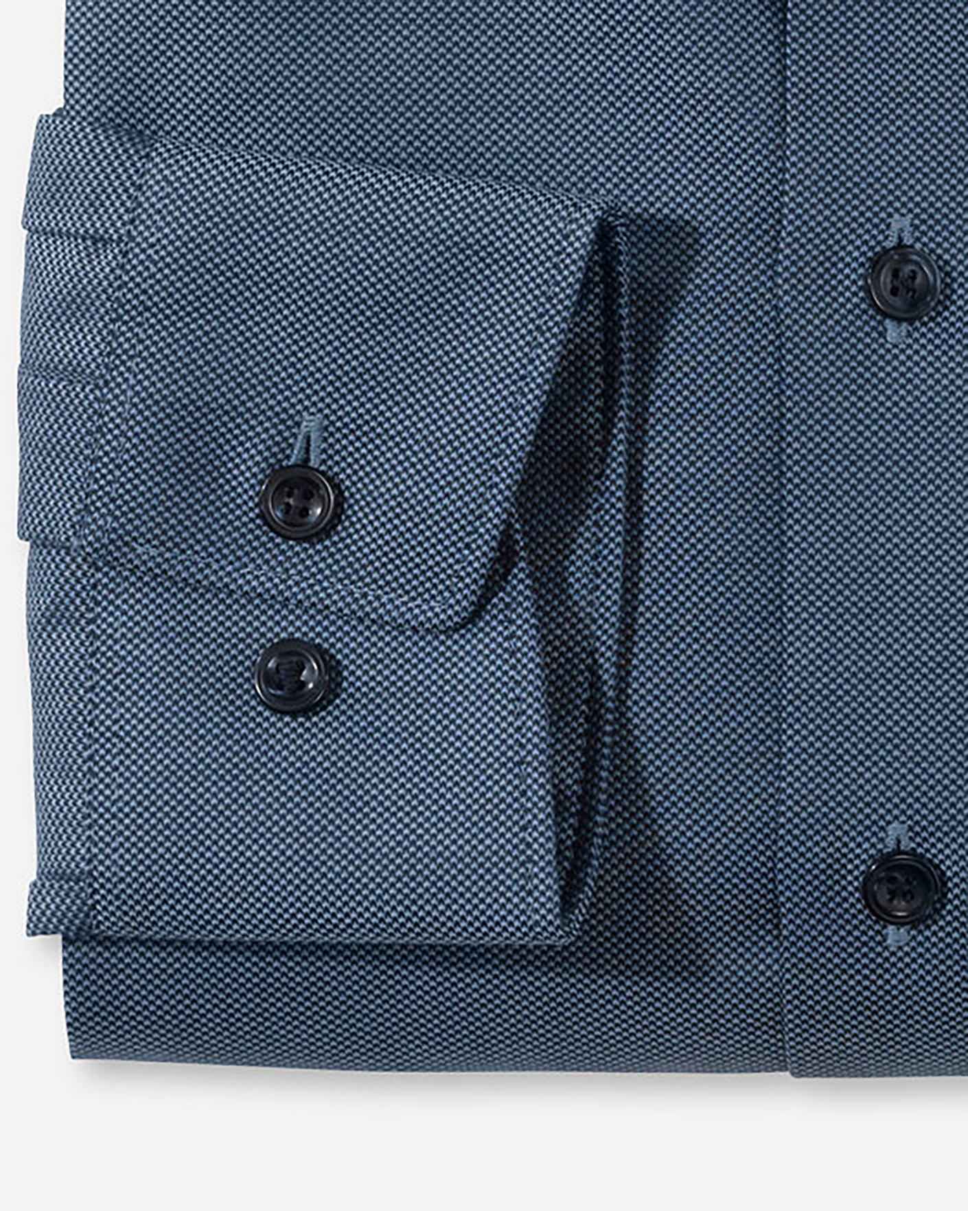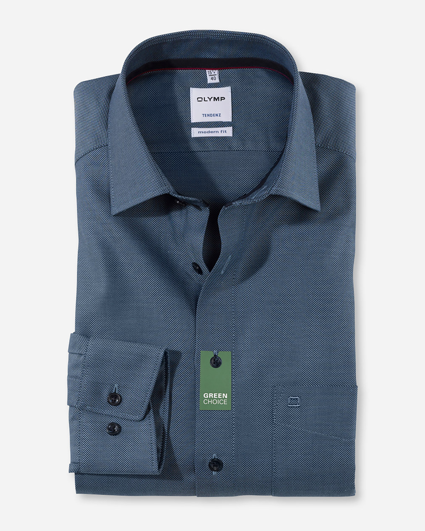 Рубашка OLYMP Tendenz Modern Fit серо-синего цвета в мелкий текстурный рисунок. Модель с нагрудным карманом и элегантный New Kent, который можно носить как с галстуком, так и без него. В данной рубашке присутствует сочетание классического делового дресс-кода и повседневной носки.