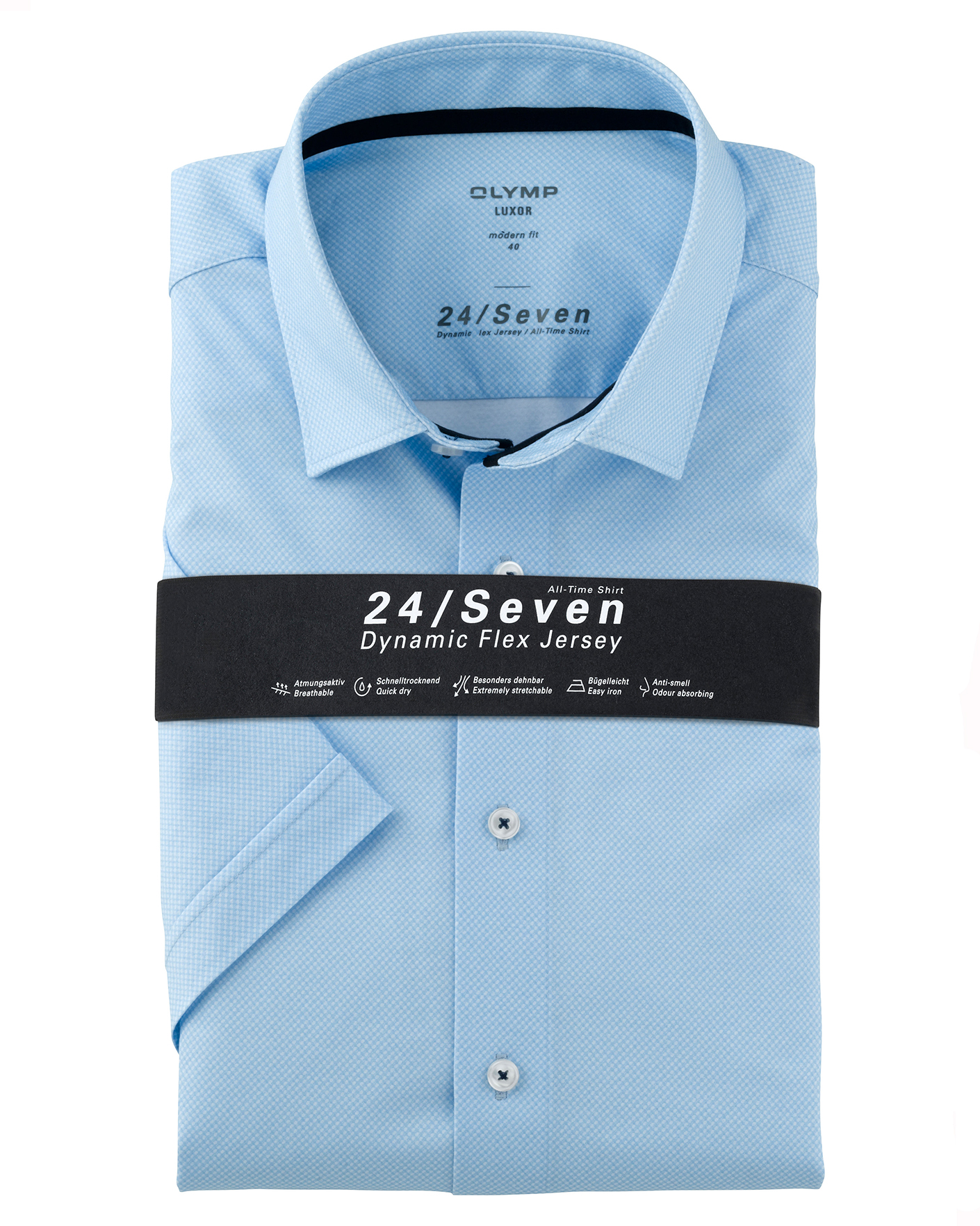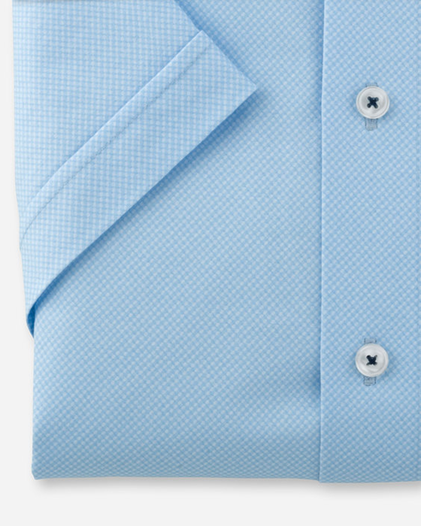 Свежая рубашка OLYMP Luxor Modern Fit светло-голубого цвета в мелкий оптический рисунок. Модель прилегающего кроя, но с максимальной свободой движений. Воротник New Kent и планка на контрастные пуговицы. Данная модель рубашки - это повседневная, качественная одежда современного бизнеса.