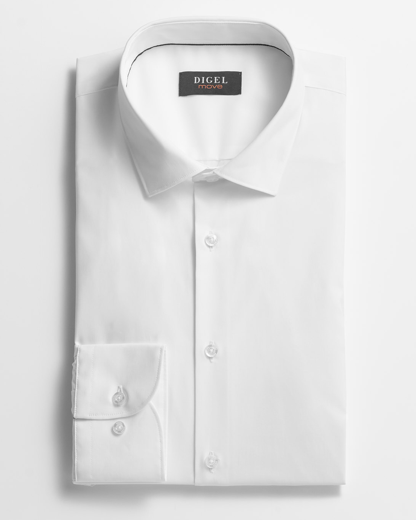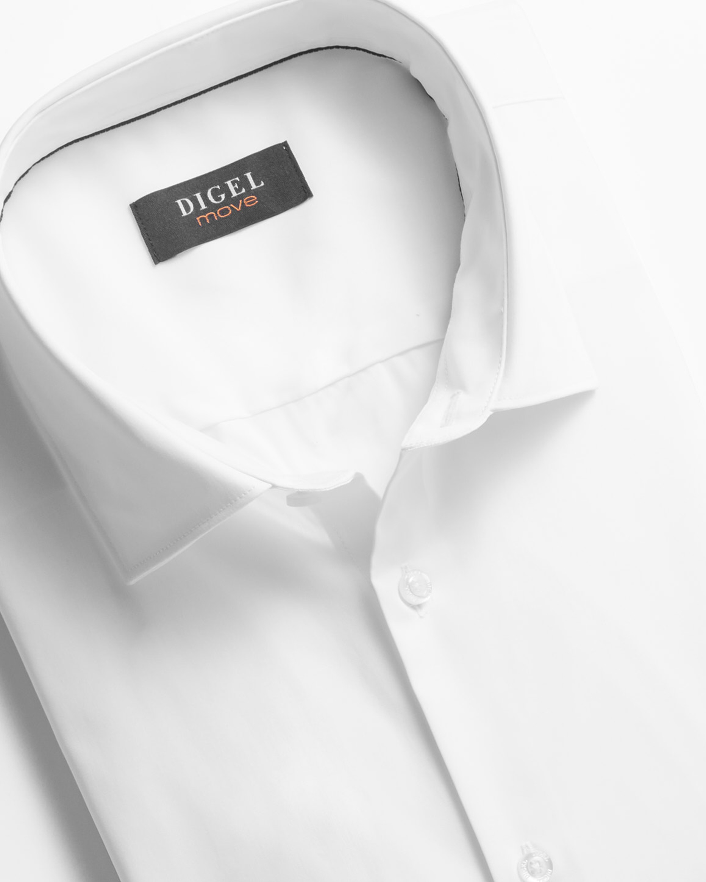 Классическая рубашка Digel белого цвета с длинным рукавом. Универсальная модель с отложным воротником, планкой на пуговицы и манжетами. Рубашка станет идеальным спутником как для праздничного, так и делового образа.
