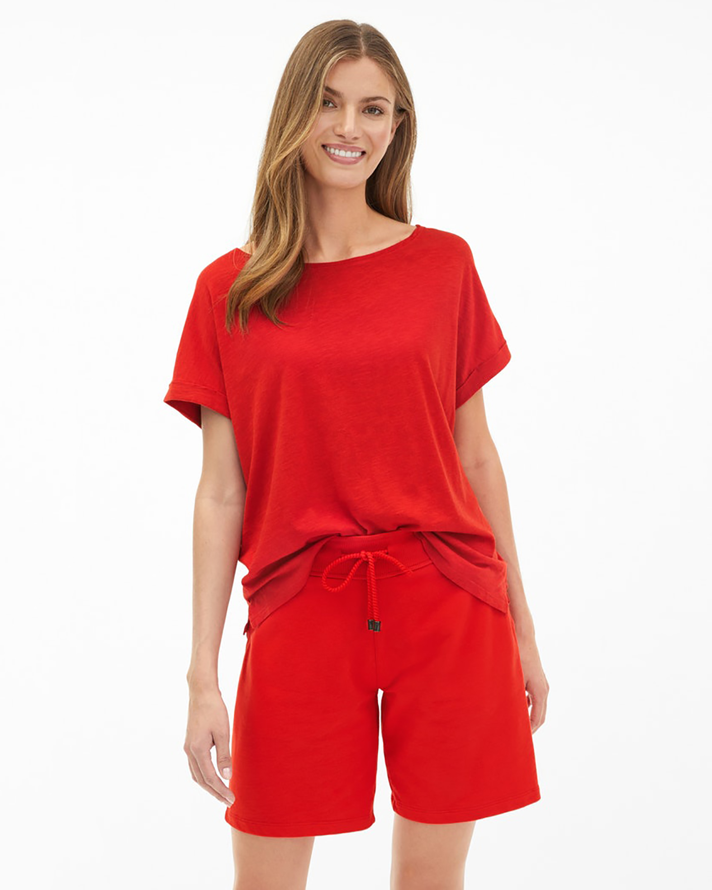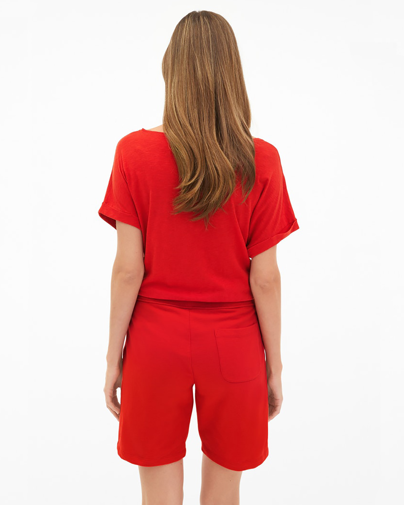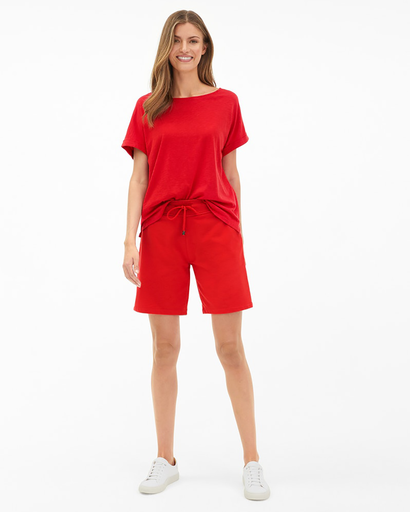 Шорты Juvia ярко-красного цвета. Удлиненная модель с поясом на резинке и вставном шнурке в тон, имеются врезные карманы по бокам и накладные сзади. Шорты станут ярким дополнением вашего гардероба.