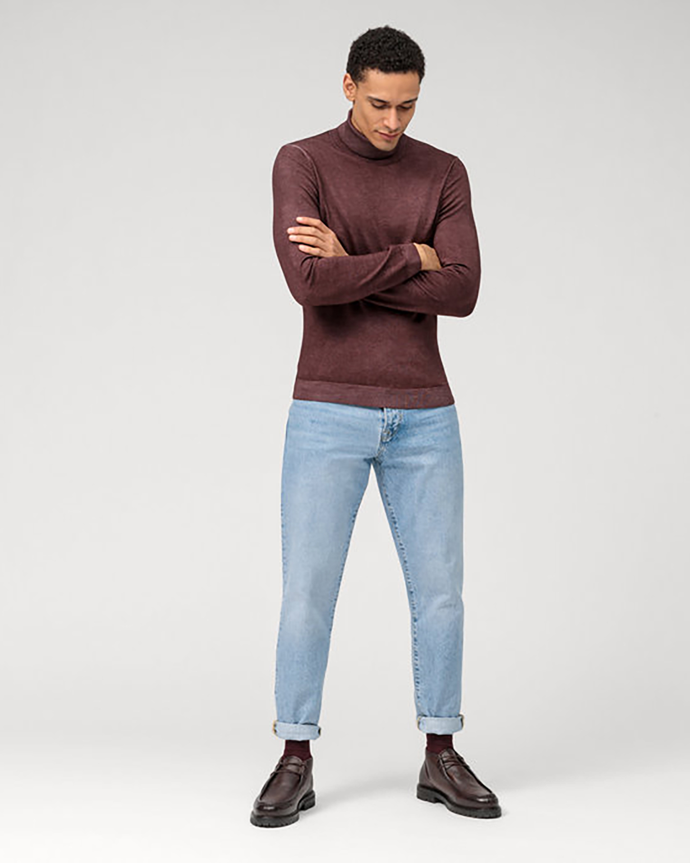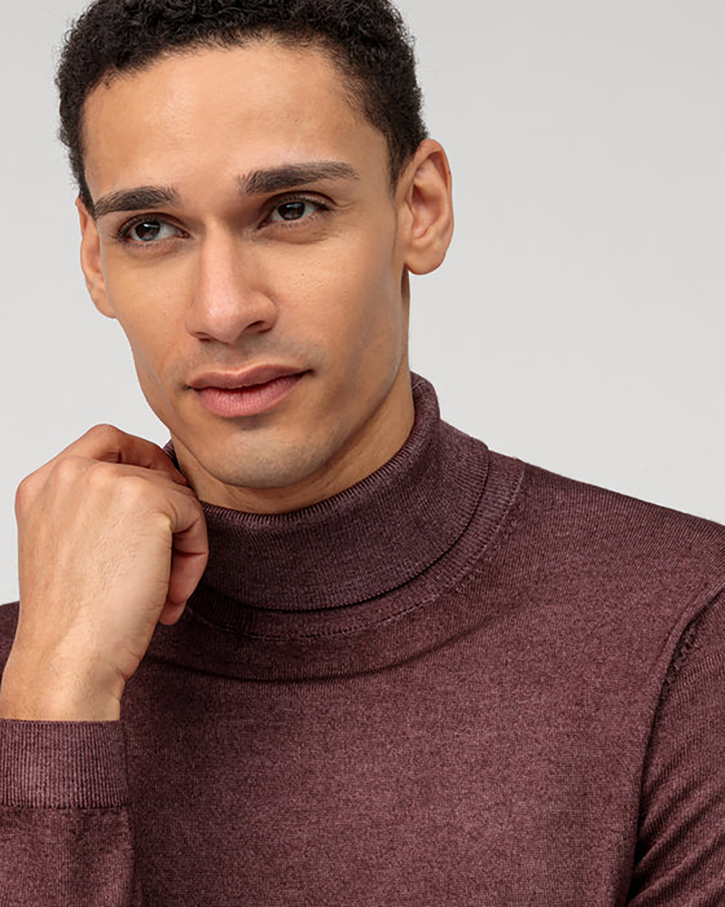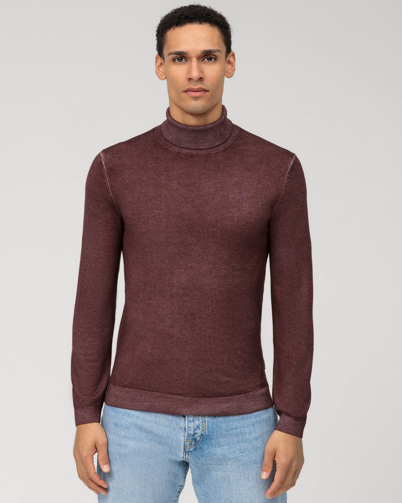Свитер Olymp Casual баклажанового цвета в мелкий строчный рисунок. Модель из 100% шерсти, двойной воротник-стойка, манжеты и низ на тонкой ребристой резинке. Свитер отлично впишется в ваш гардероб.