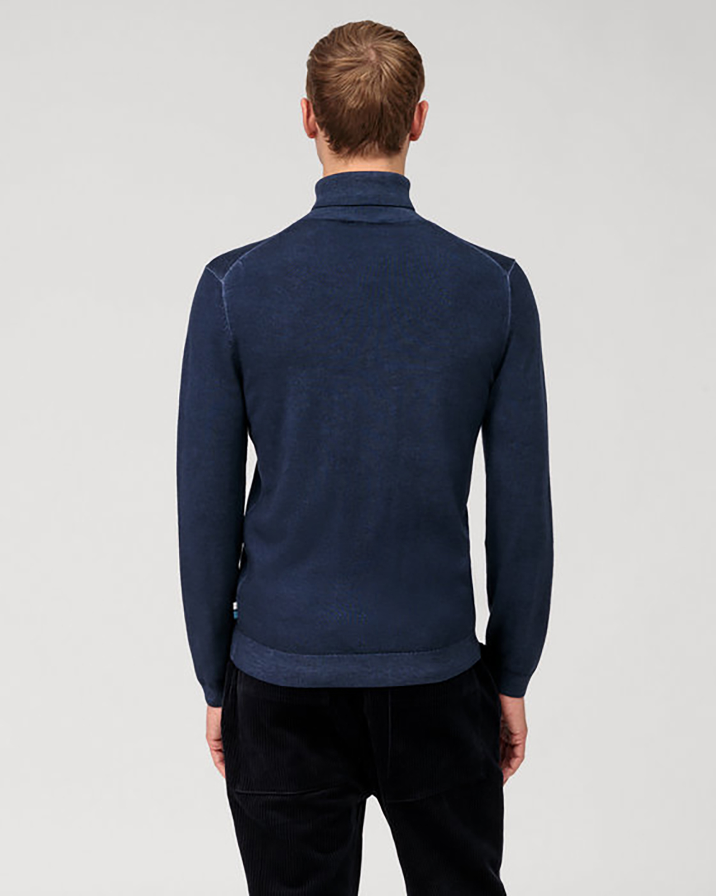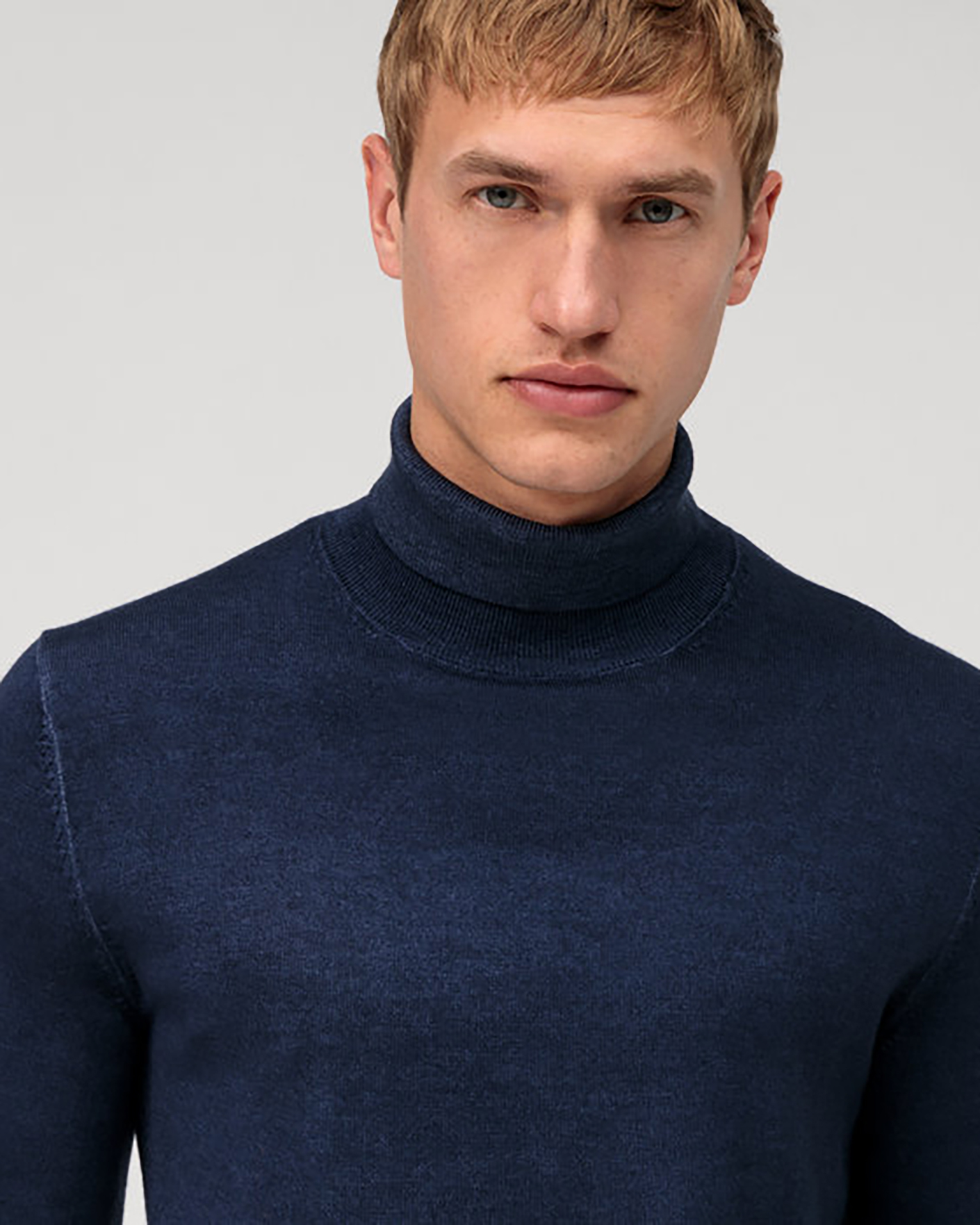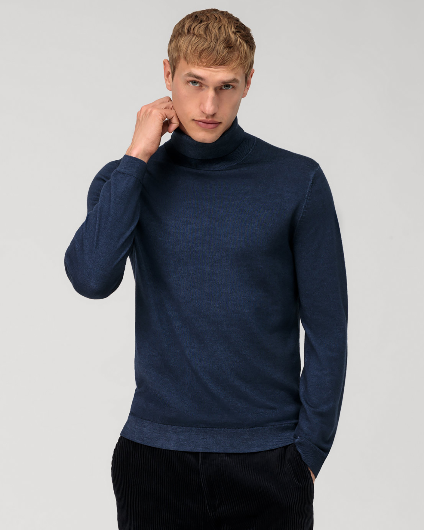 Свитер Olymp Casual темно-синего цвета в мелкий строчный рисунок. Модель из 100% шерсти, двойной воротник-стойка, манжеты и низ на тонкой ребристой резинке. Свитер отлично впишется в ваш гардероб.