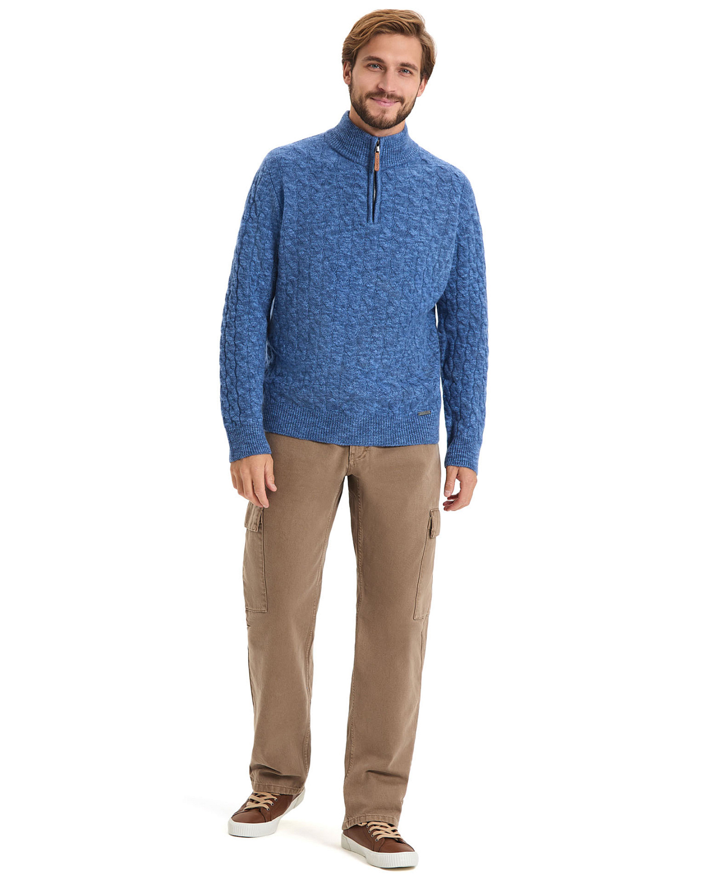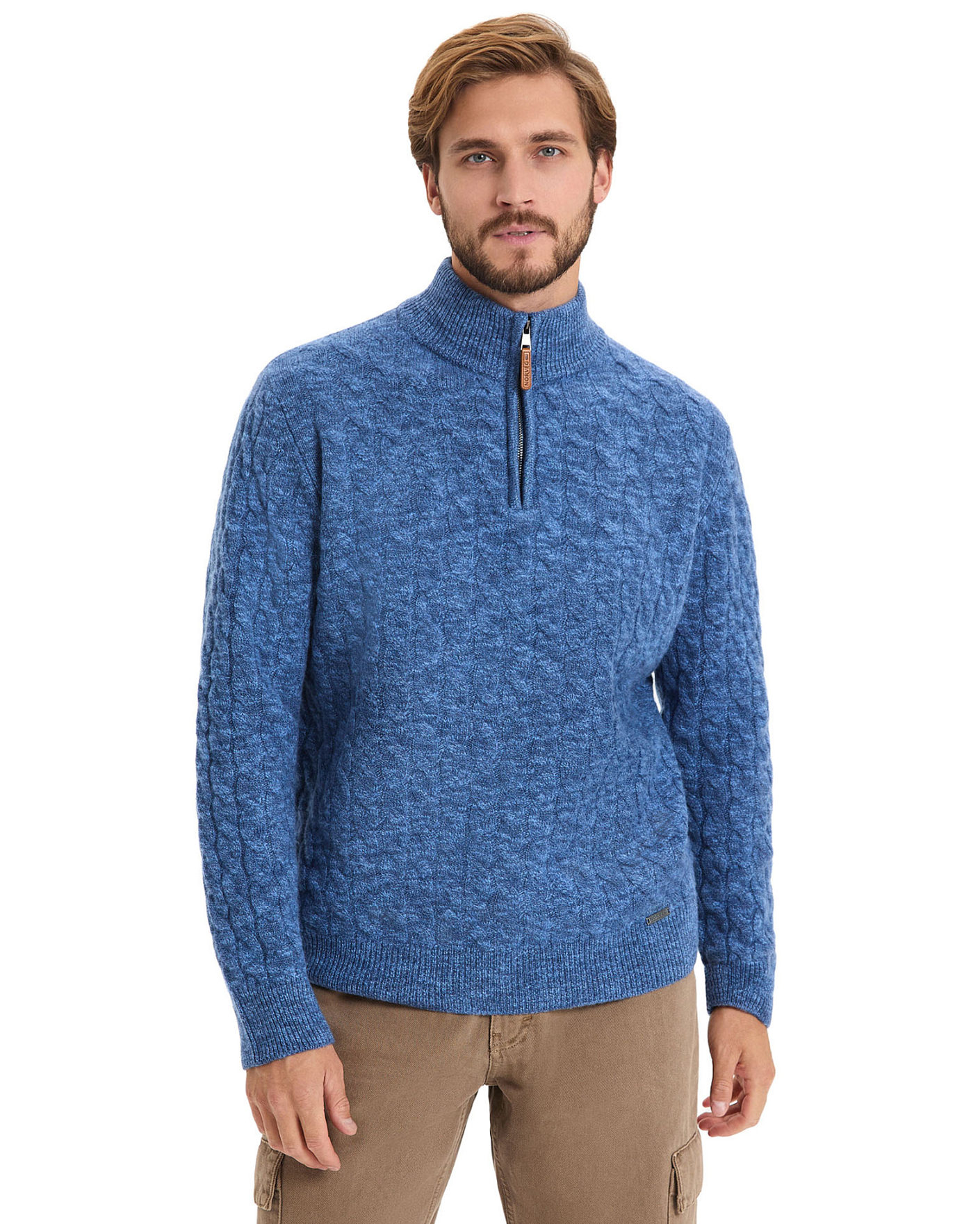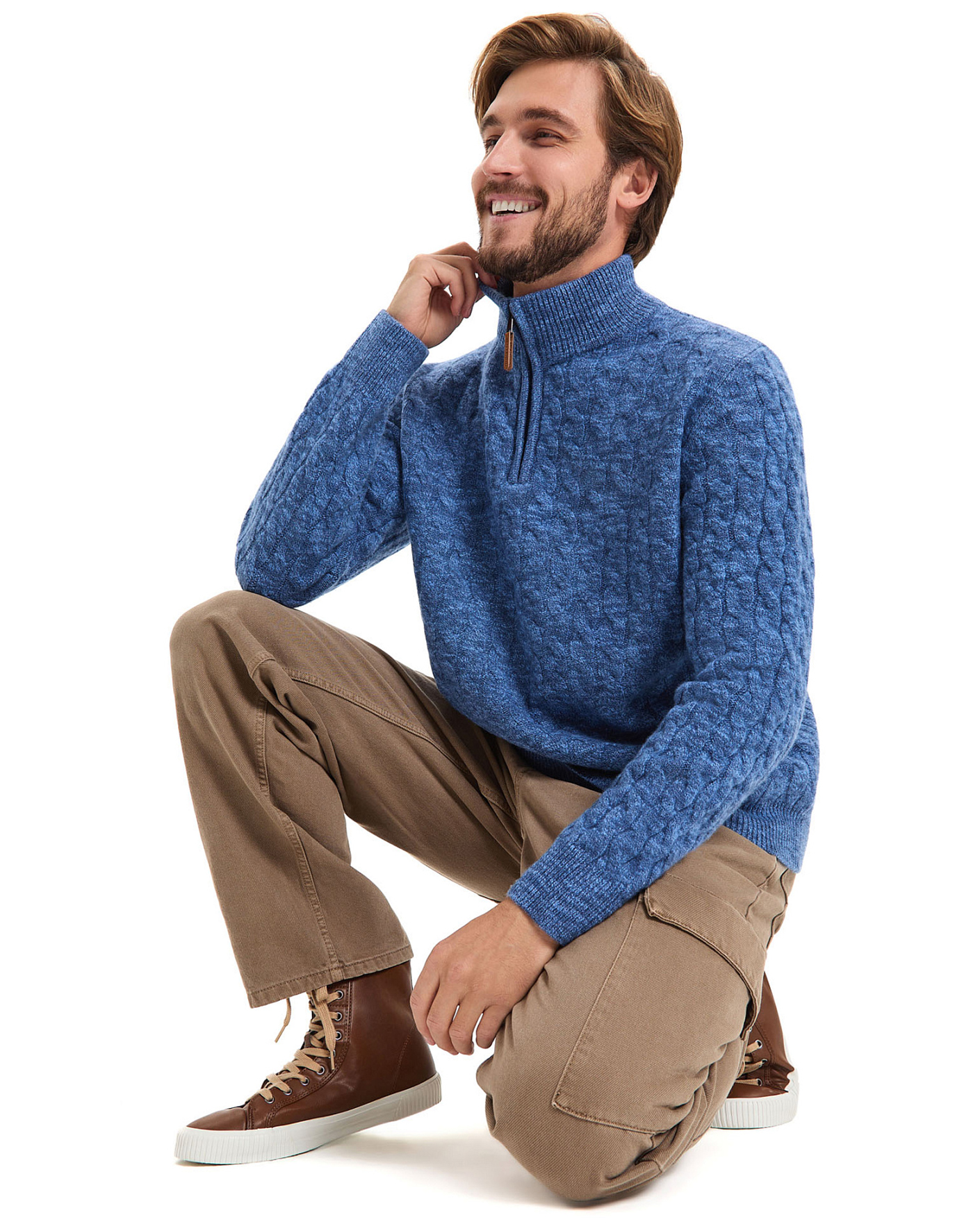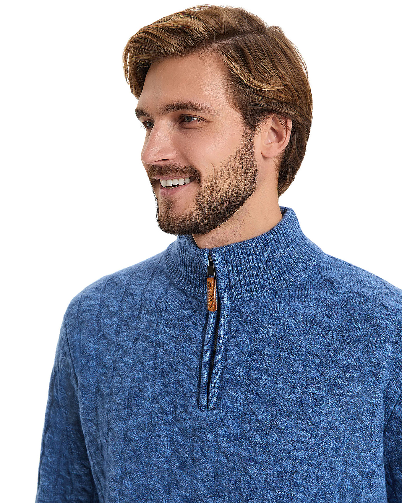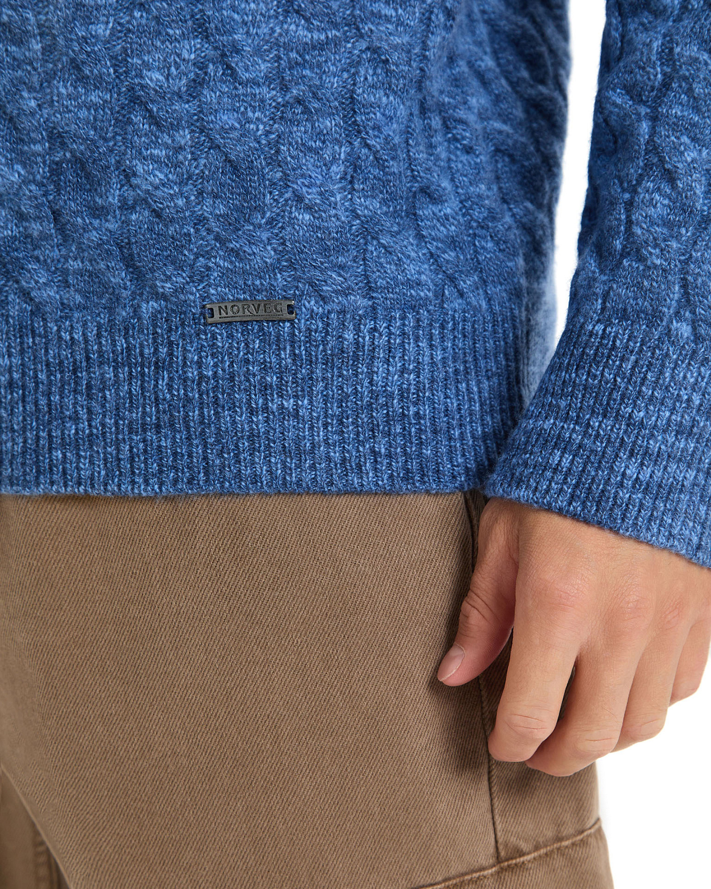 Теплый свитер Norveg серо-голубого цвета выполнена из 100% шерсти. Модель в вертикальую вязку-косы, воротник-стойка на молнии. Стильный свитер станет фаворитом вашего гардероба.