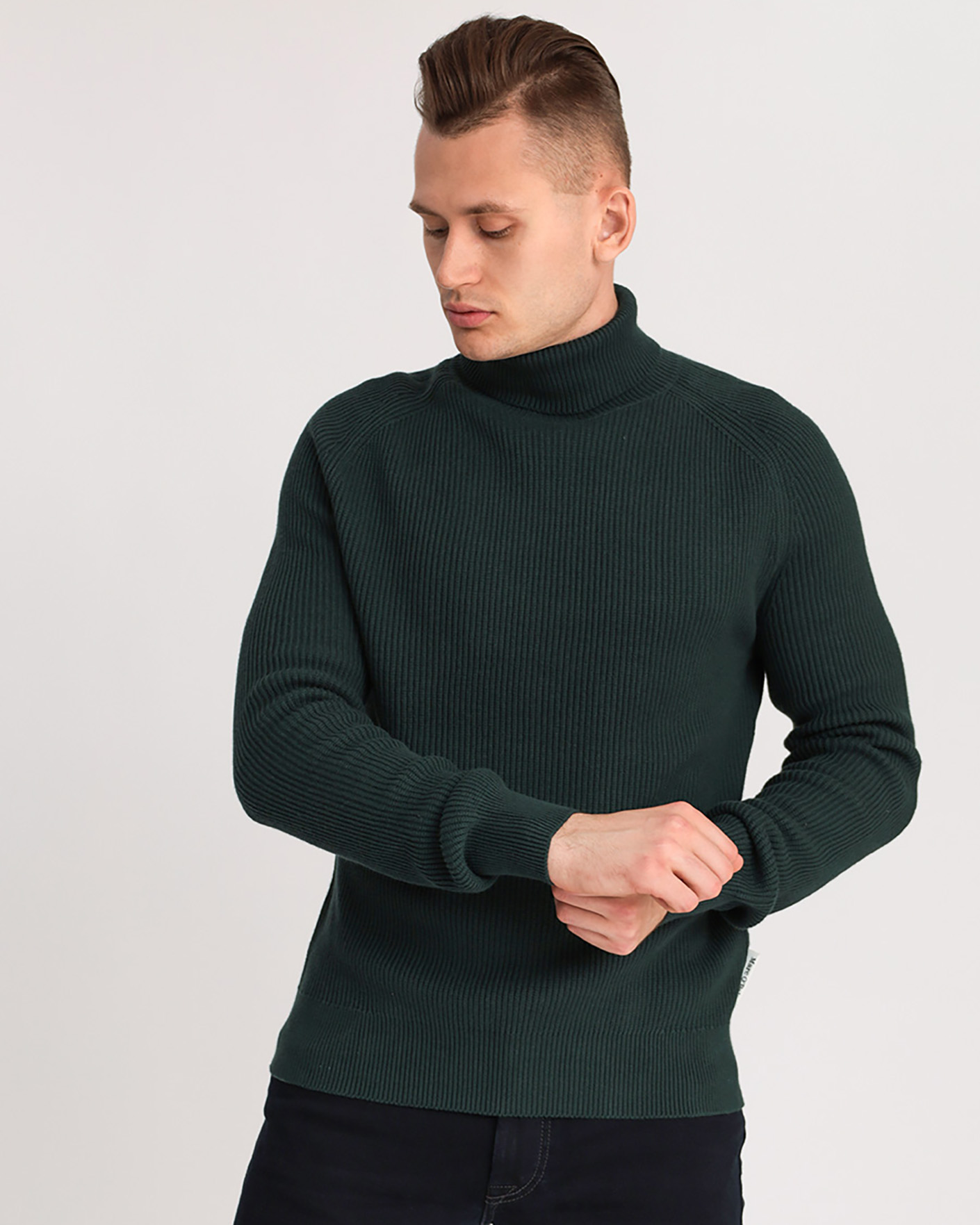 Свитер Marc O'Polo темно-зеленого цвета в вертикальную вязку. Модель выполнена из высококачественного сочетания хлопка и шерсти. Двойной воротник-стойка и длинные рукава. Свитер отлично впишется в ваш гардероб.