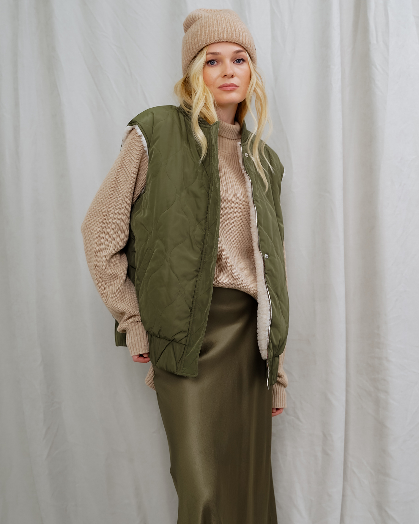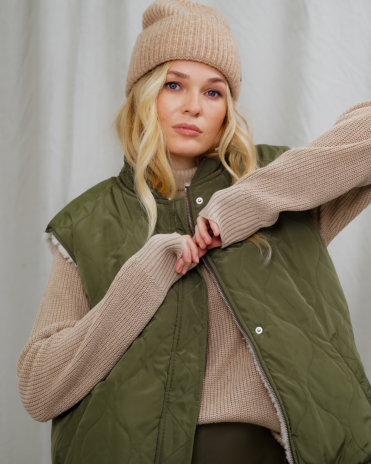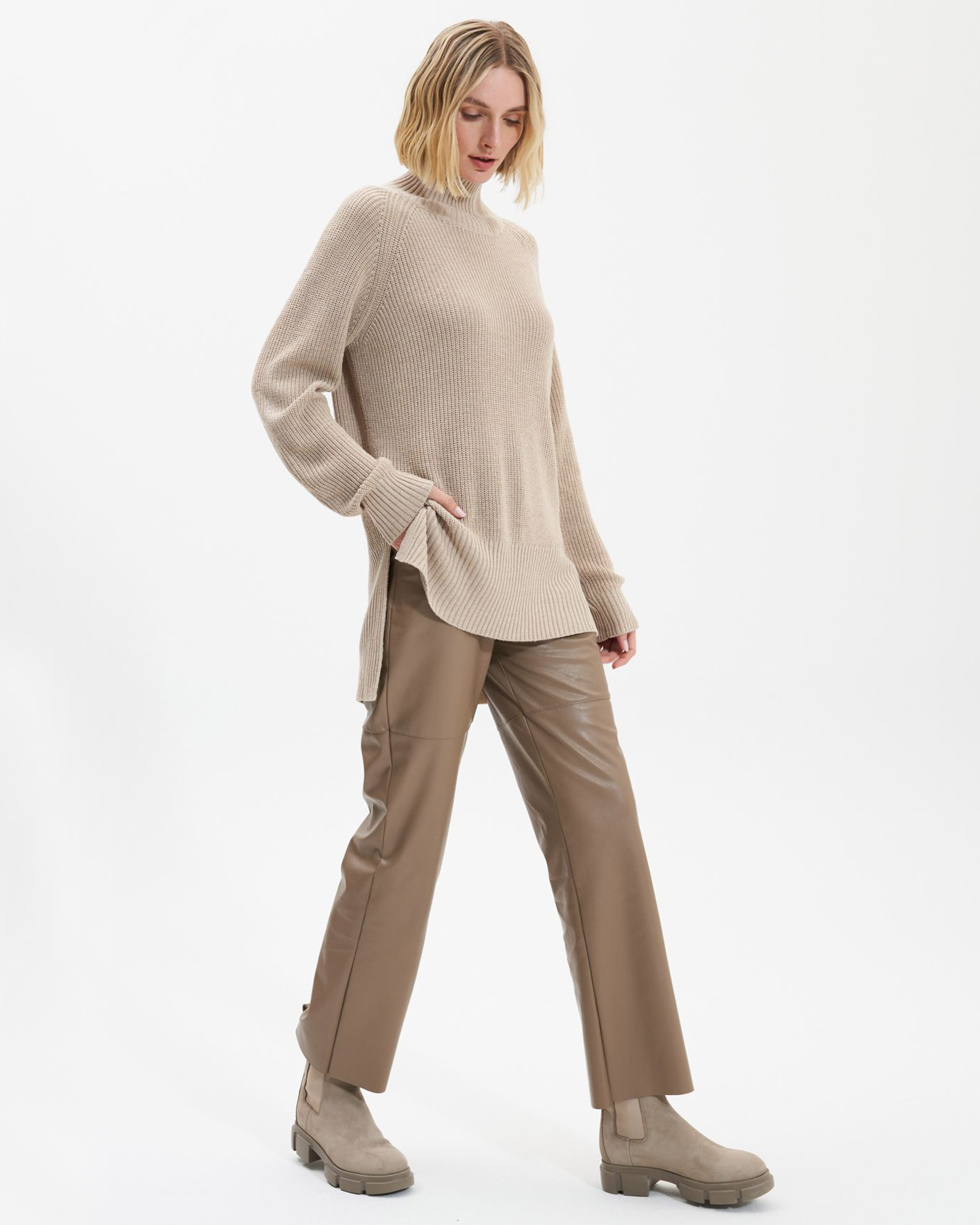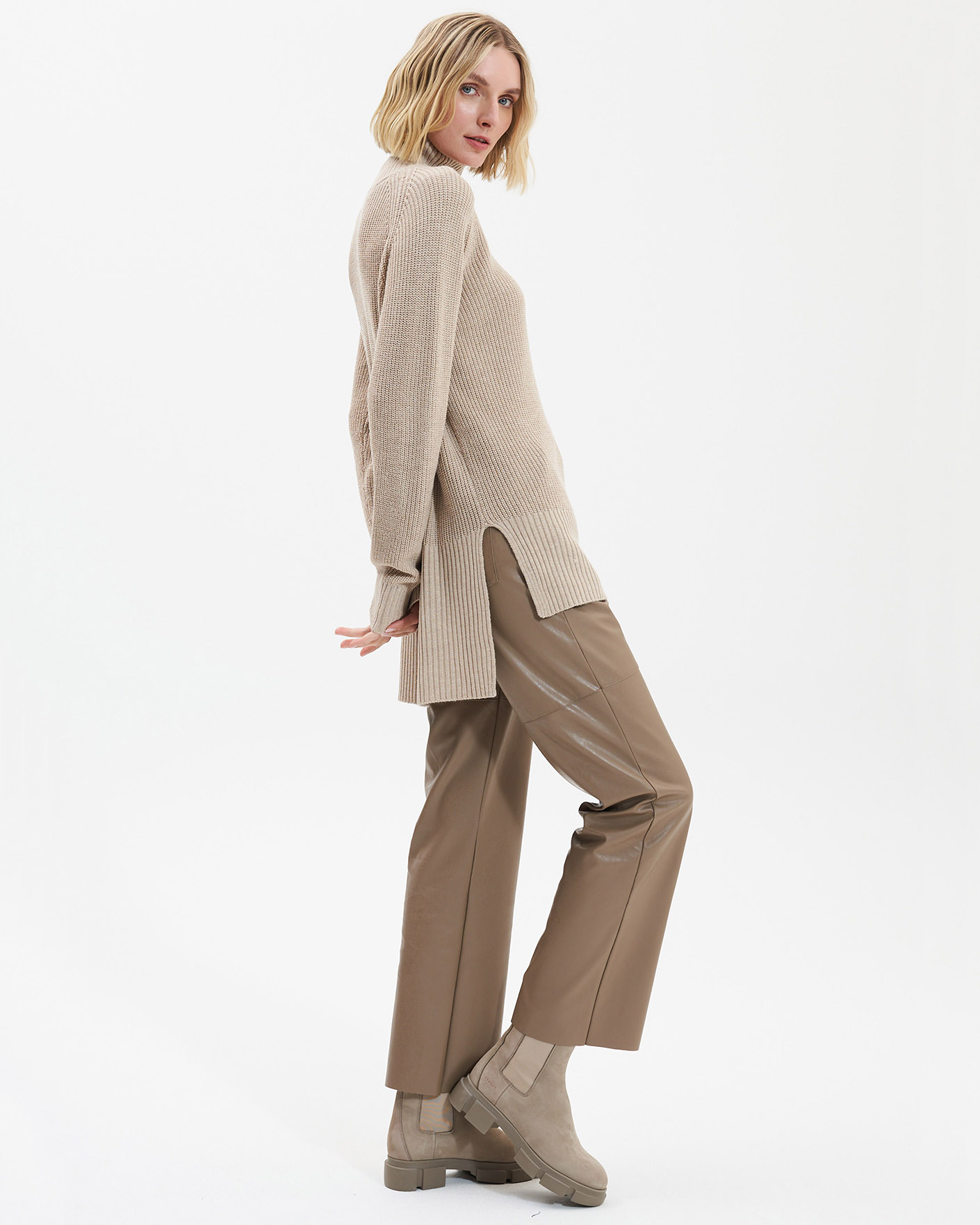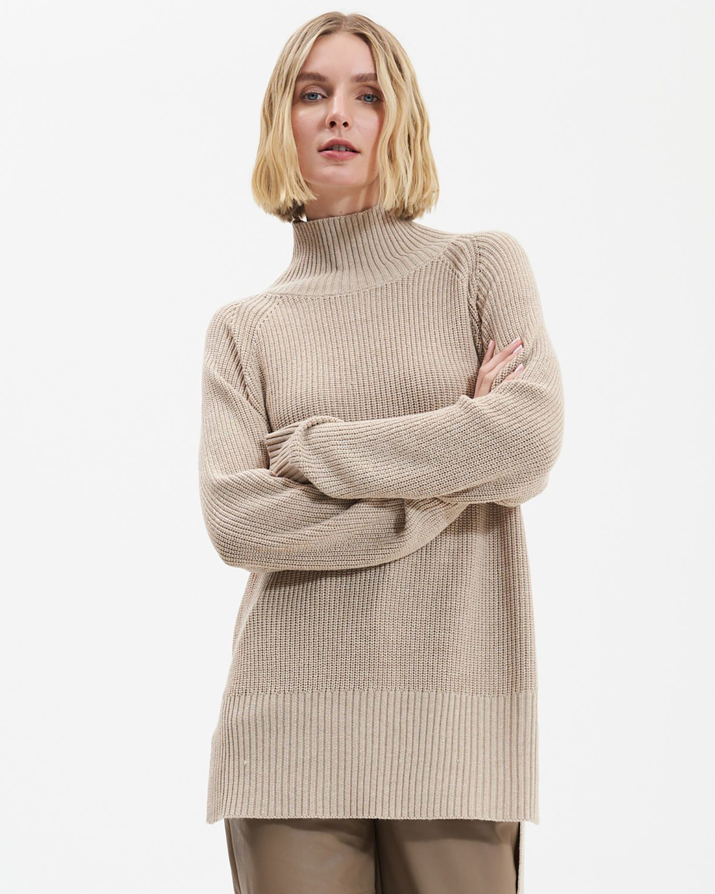 Вязаный свитер UNQ серо-бежевого цвета. Удлиненная модель с широким воротником-стойка, манжетами и низом на вывязаннйо резинке. Имеются боковые разрезы с удлиненной спинкой. Свитер отлично випшется в повседневный гардероб.