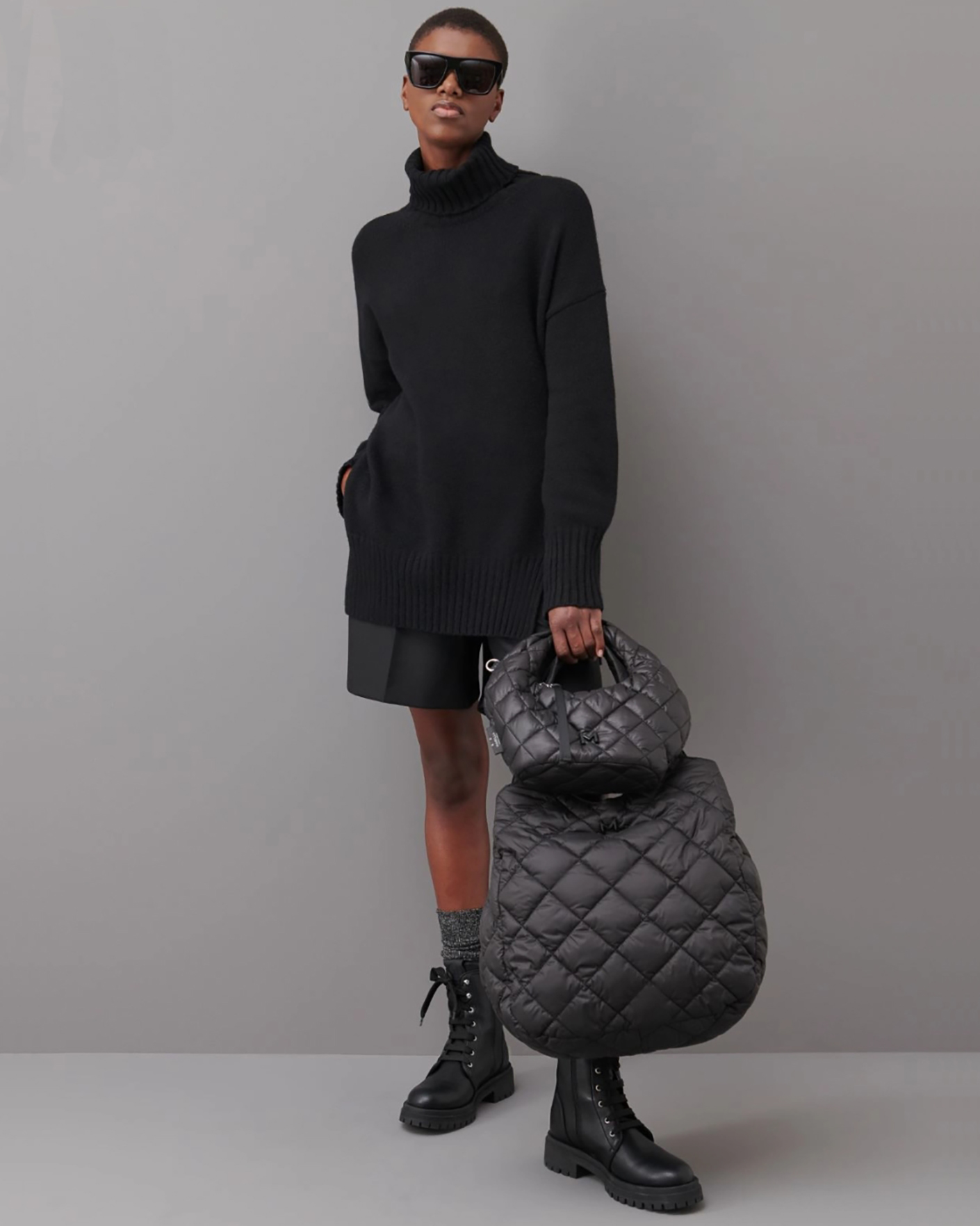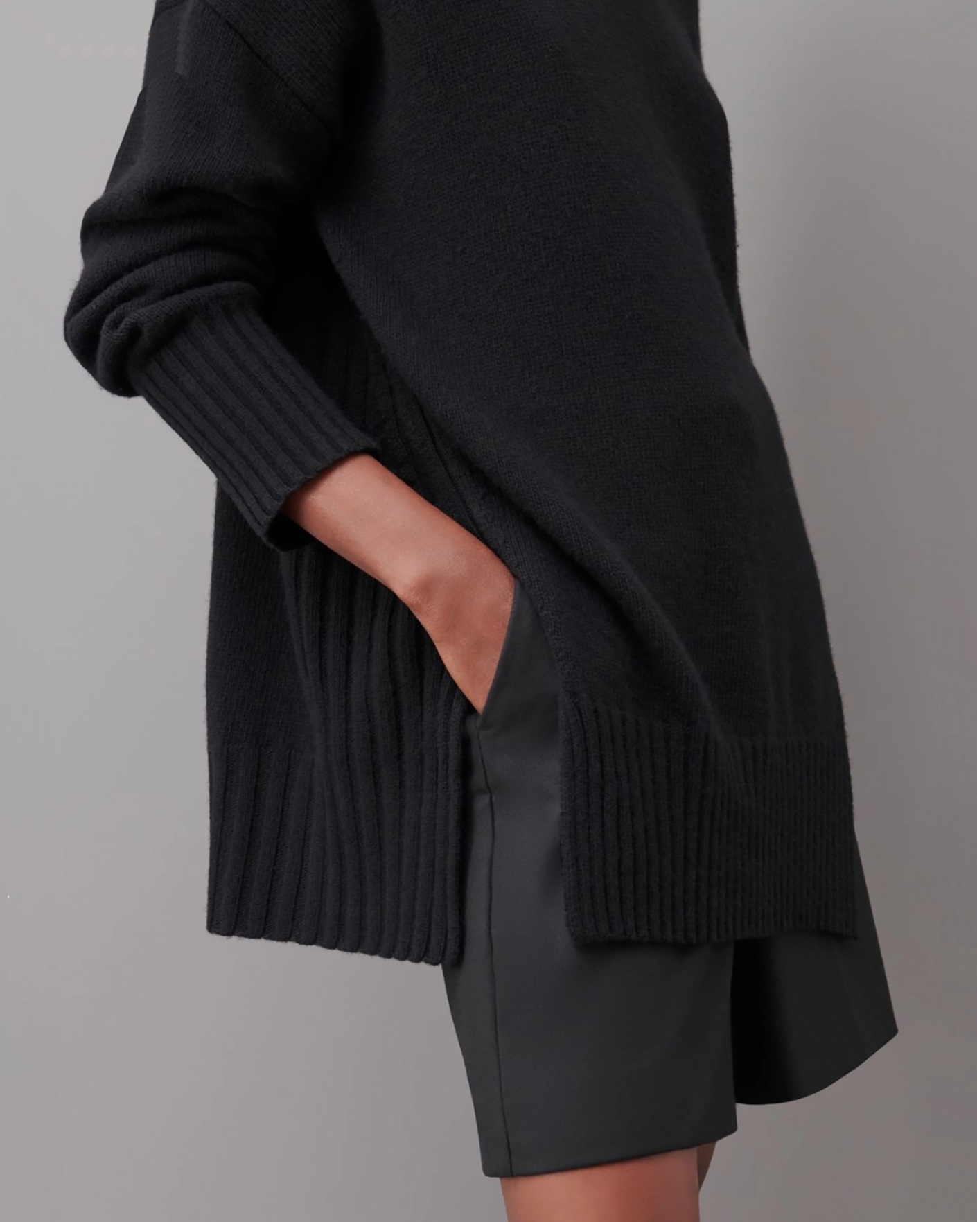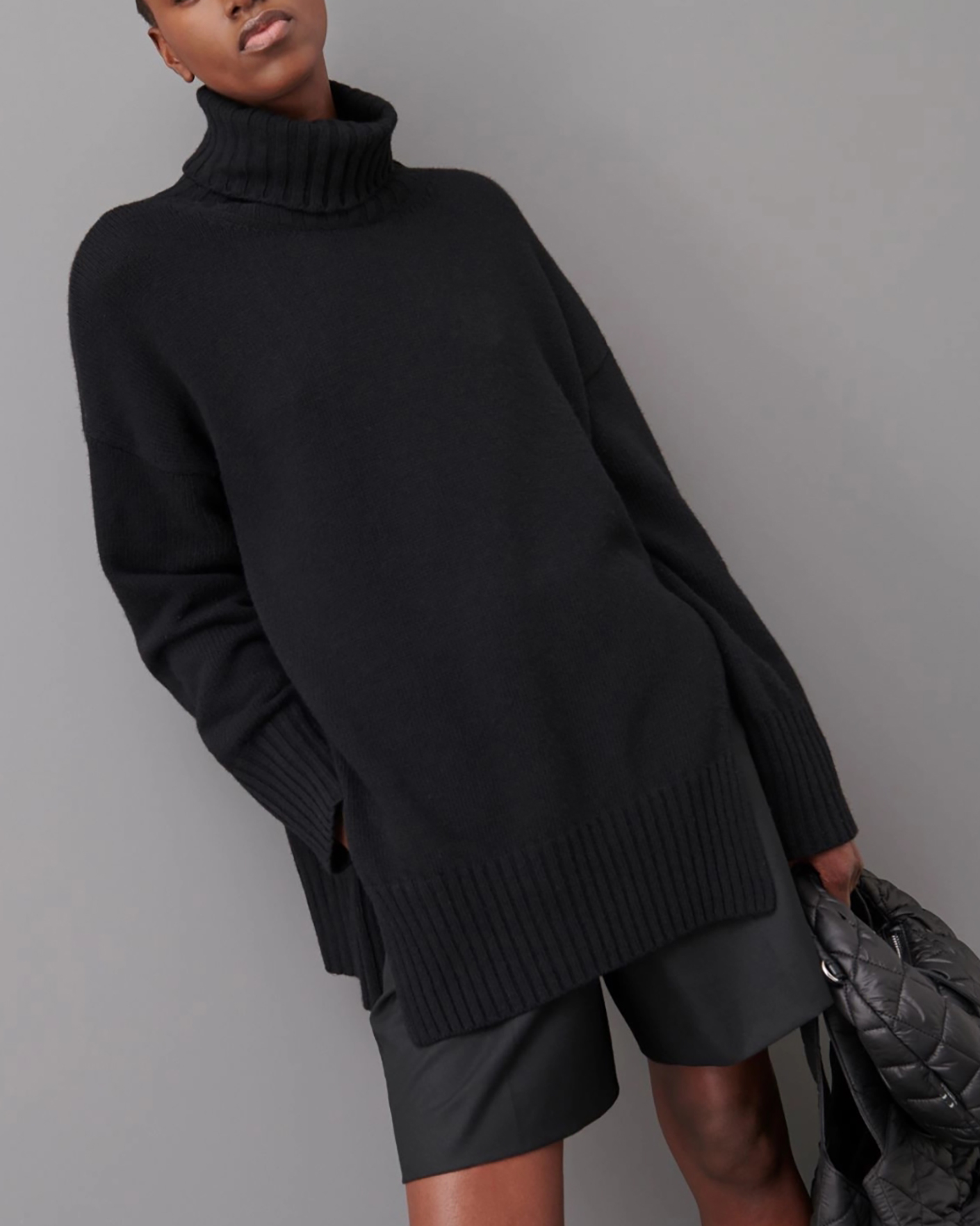 Свободный свитер Marella черного цвета в строчный рисунок. Удлиненная модель с воротником-стойка, манжетами и низом на широкой вывязанной резинке. Спущенная линия плеча, небольшие разрезы по бокам. Свитер станет фаовритом повседневного гаредроба.