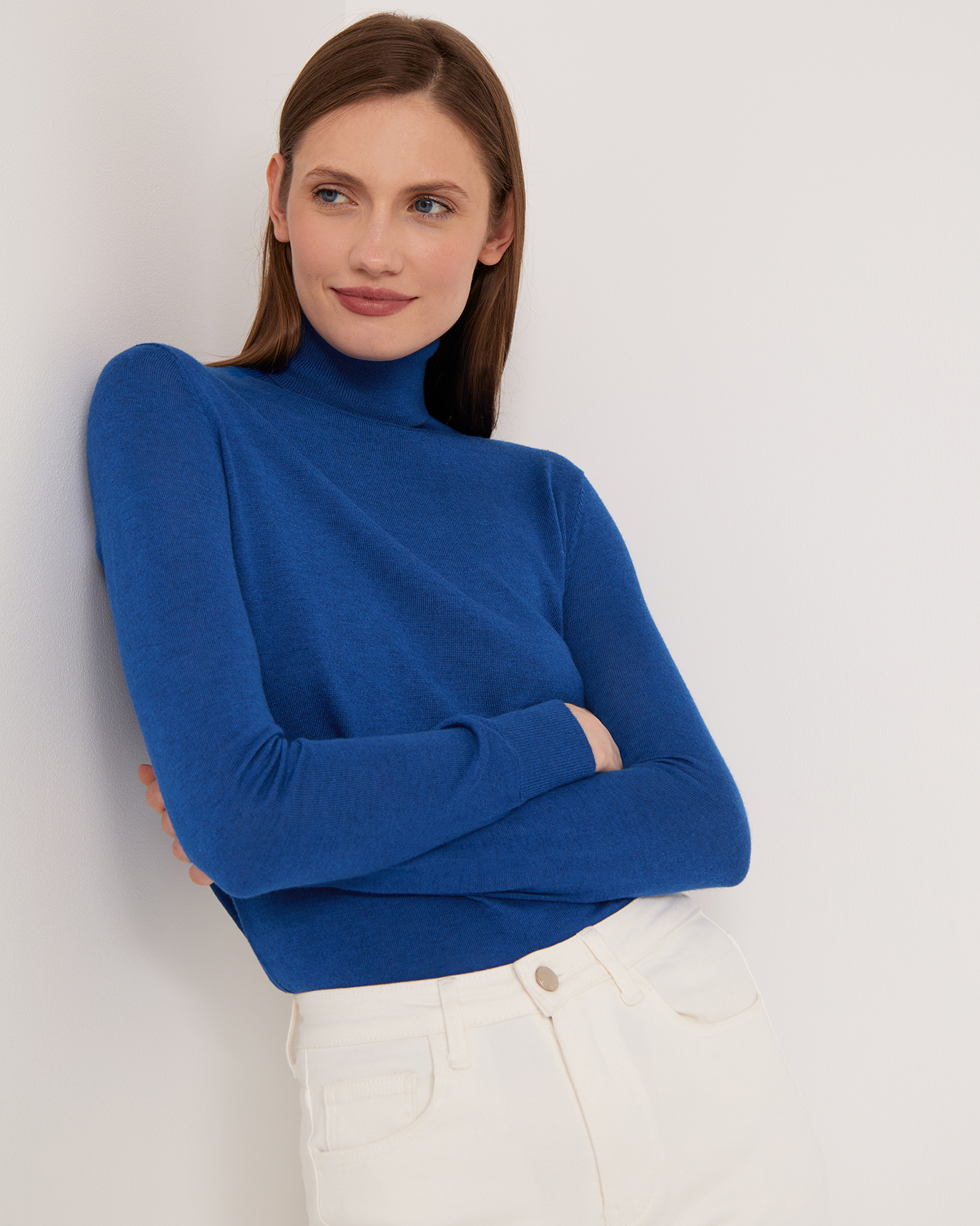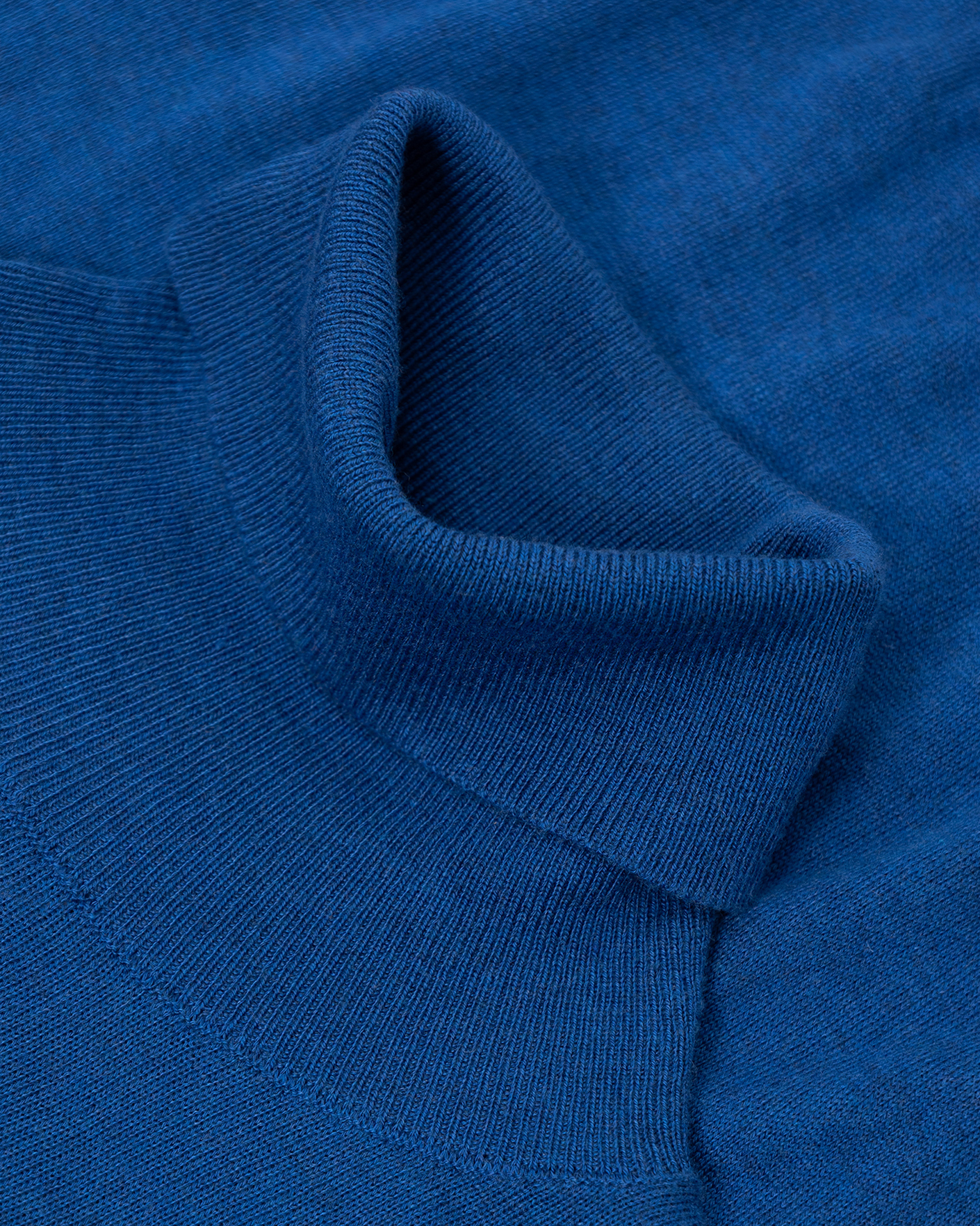 Свитер Emka синего цвета в строчный рисунок. Модель с двойным воротником-стойка, манжетами и низом на тонкой резинке. Свитер можно сочетать с жилетом, жакетом, кардиганом, юбкой и брюками.