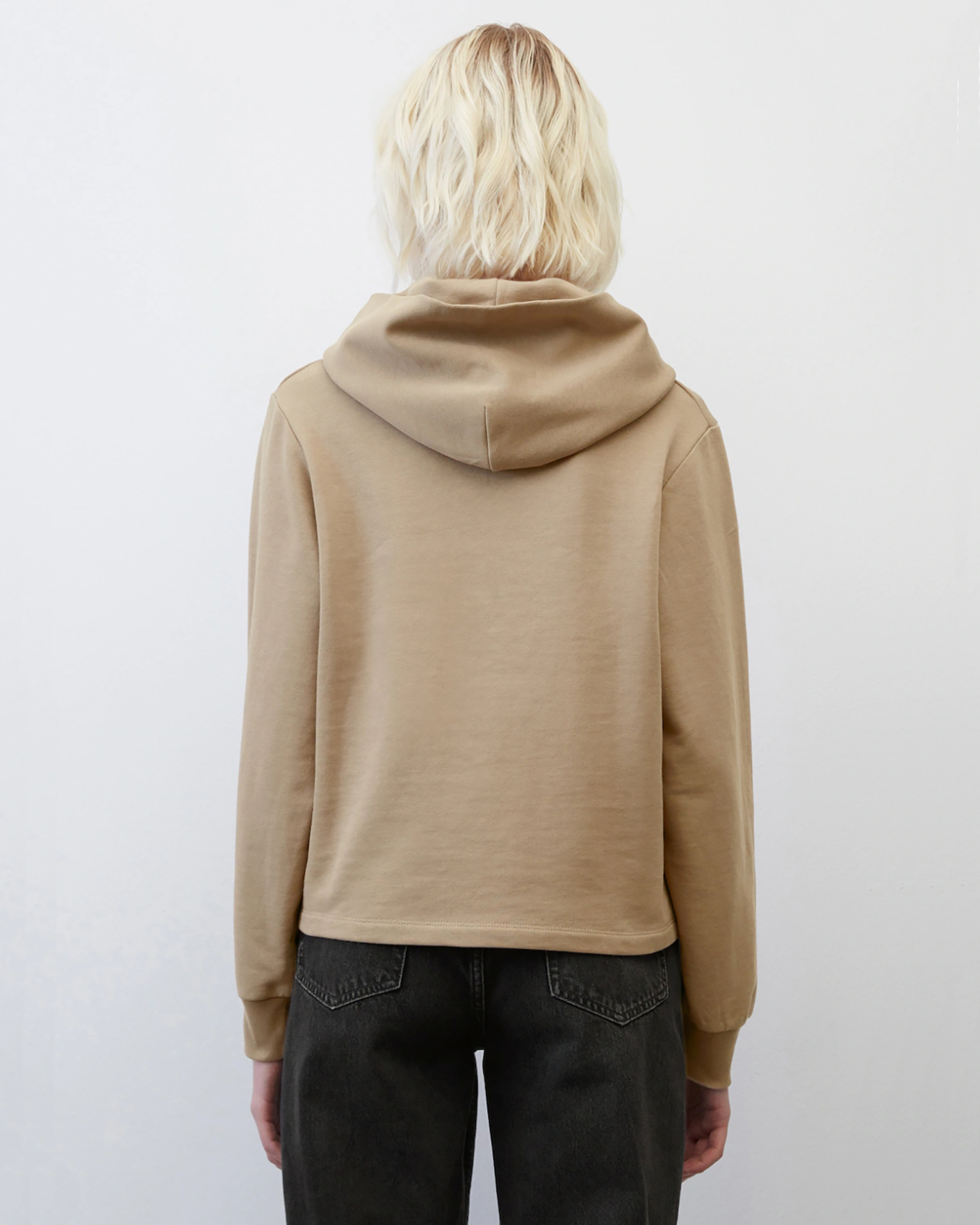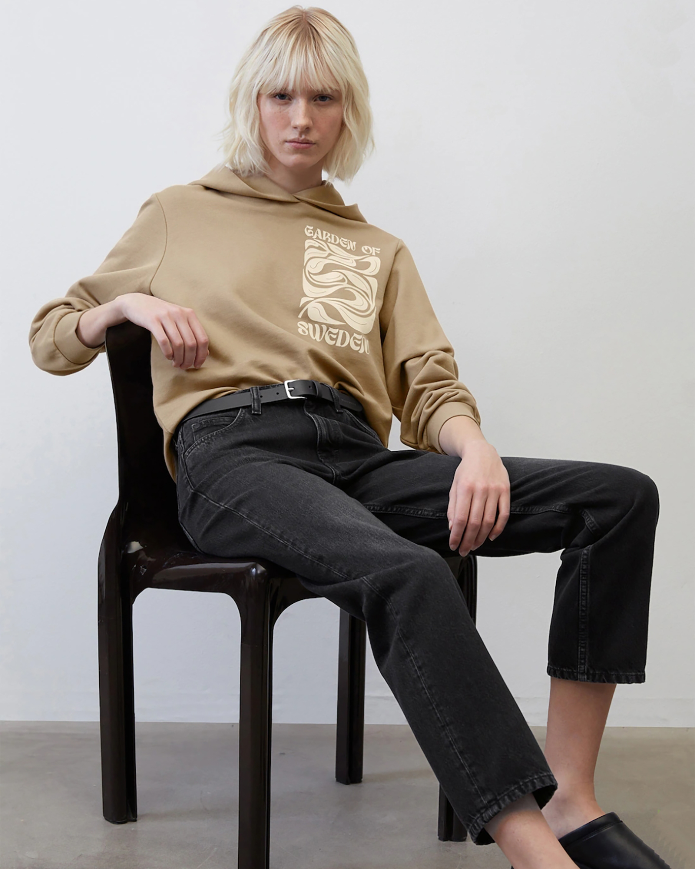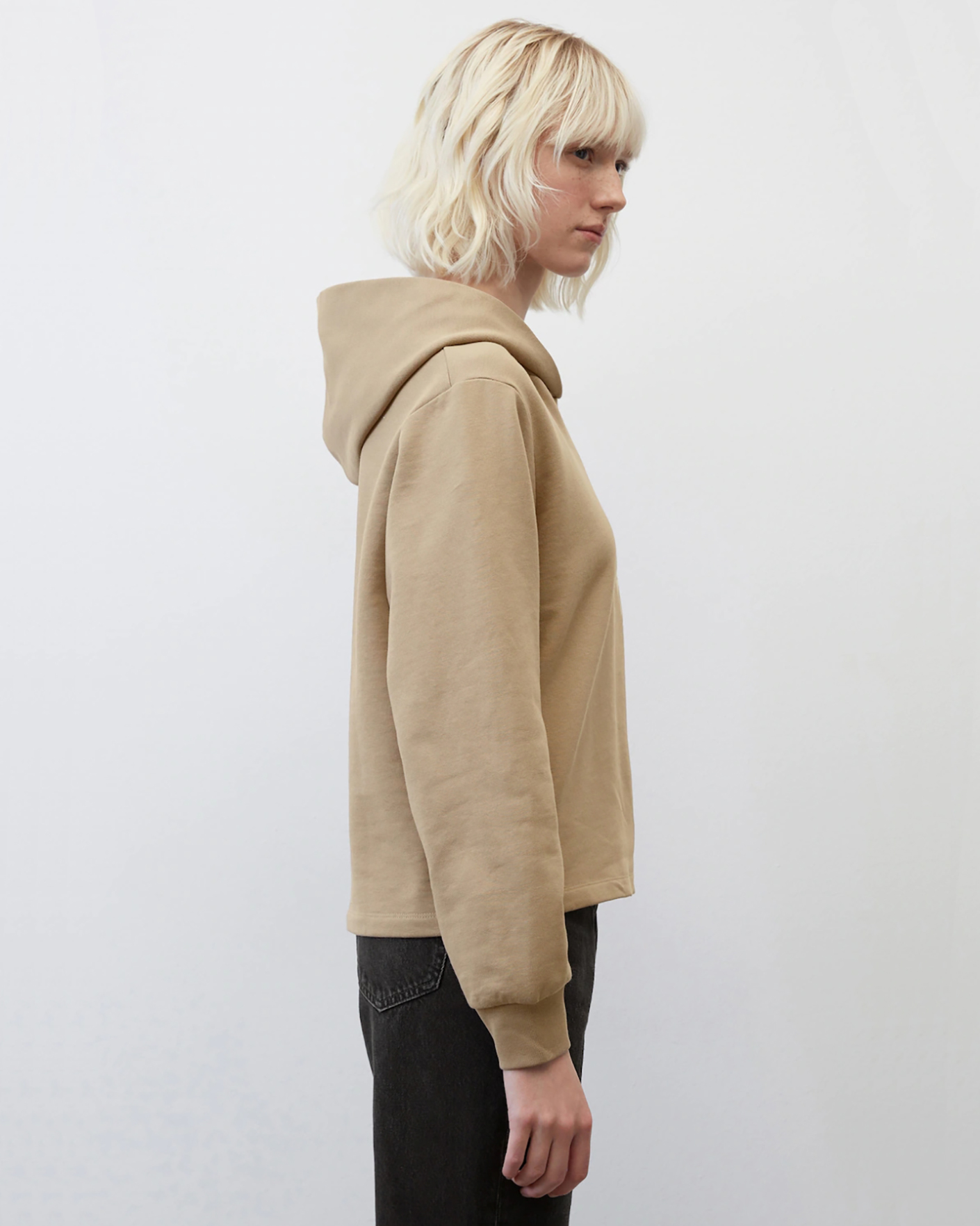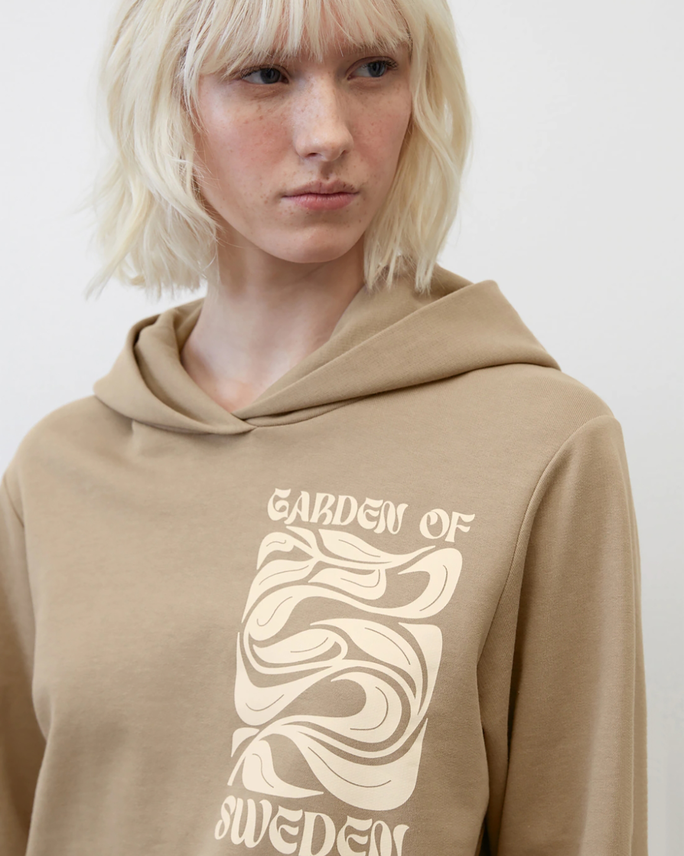 Свободный свитшот Marc O'Polo бежевого цвета с нагрудным принтом и слоганом. Модель из 100% хлопка с фиксированным капюшоном и длинными рукавами. Свитшот отлчино впишется в ваш гардероб.