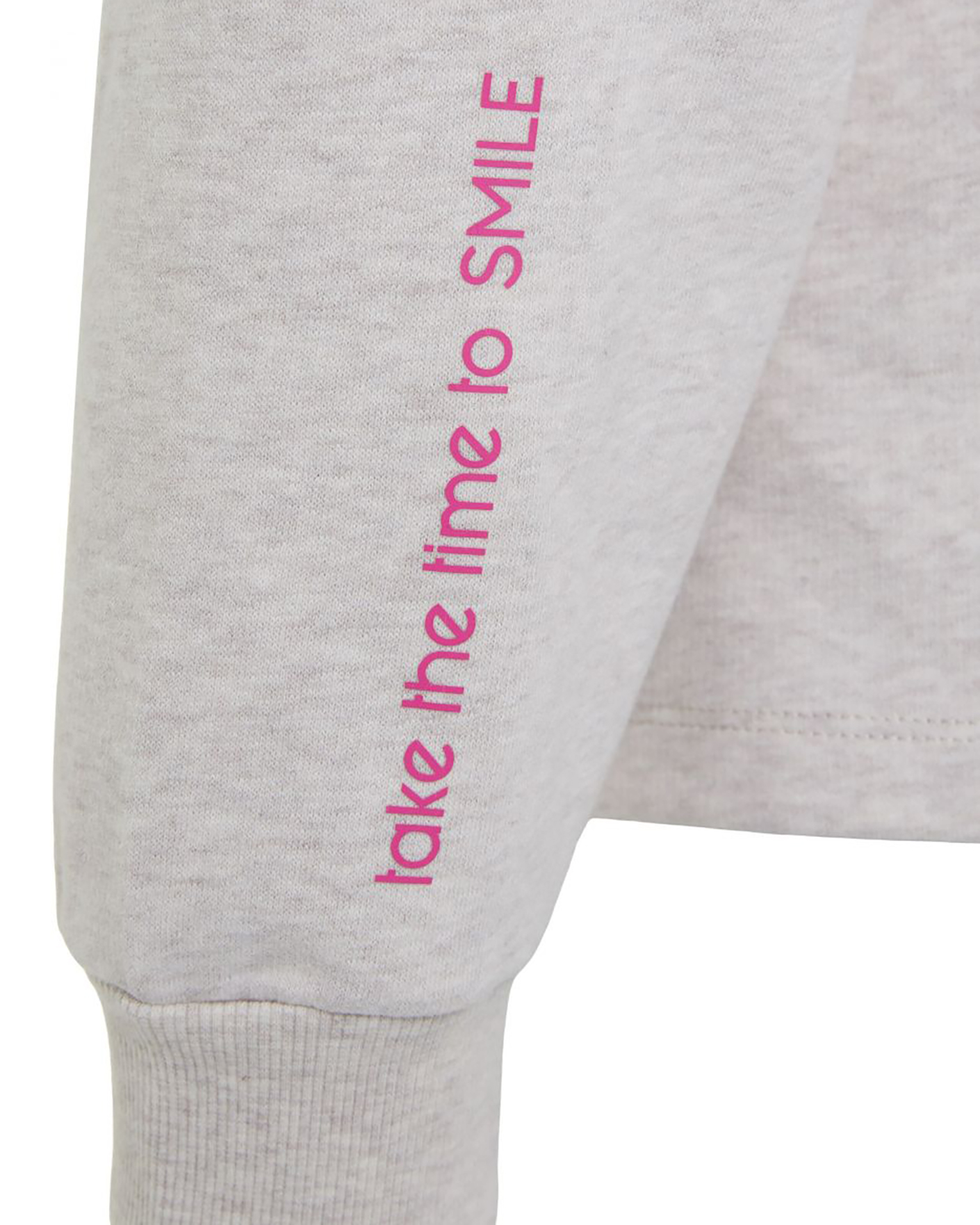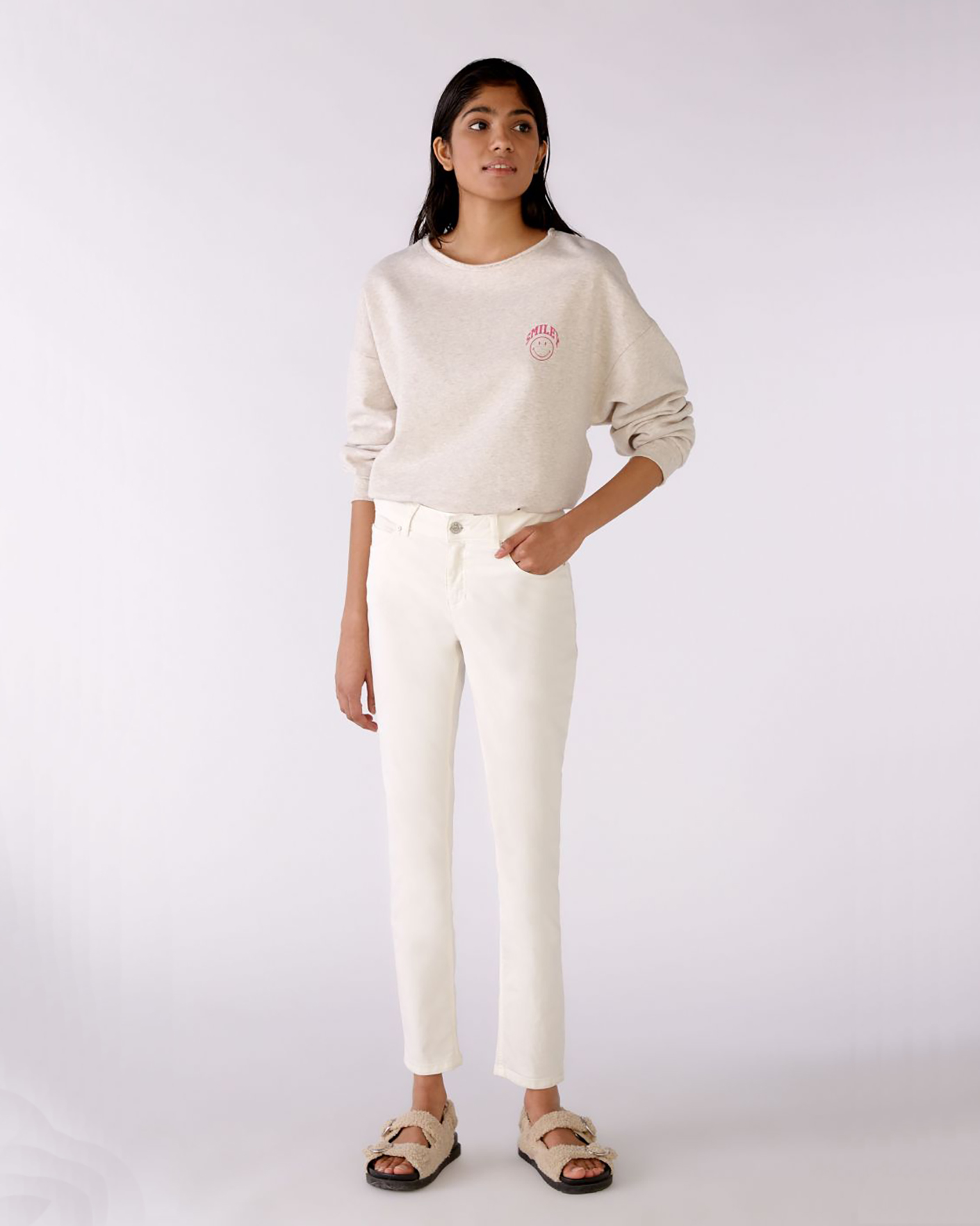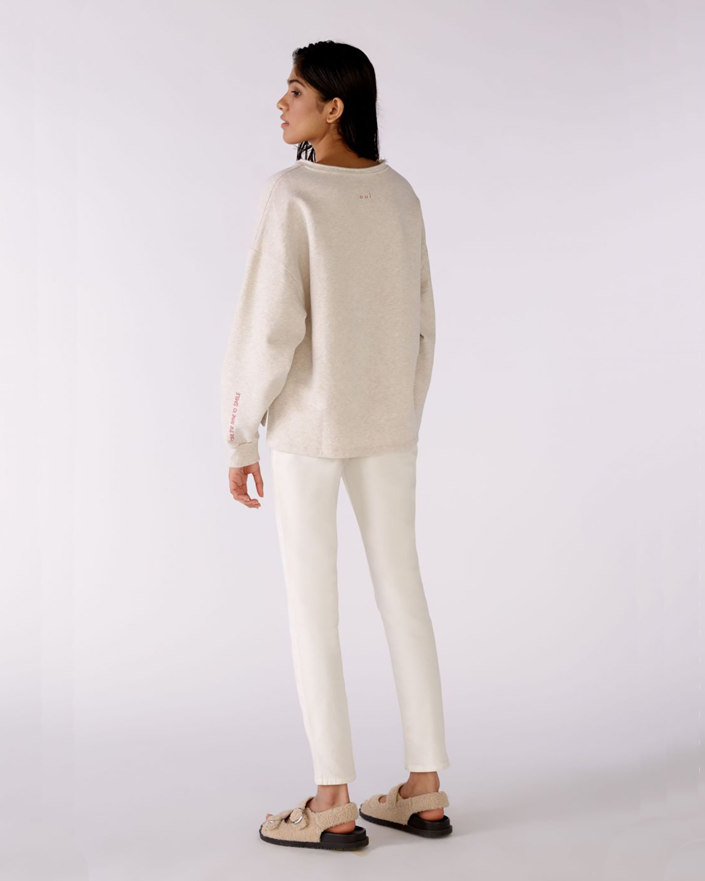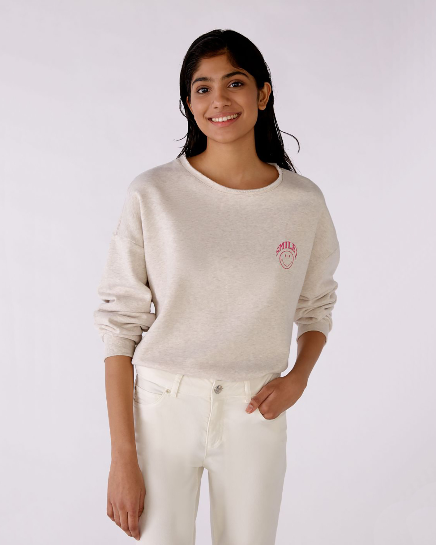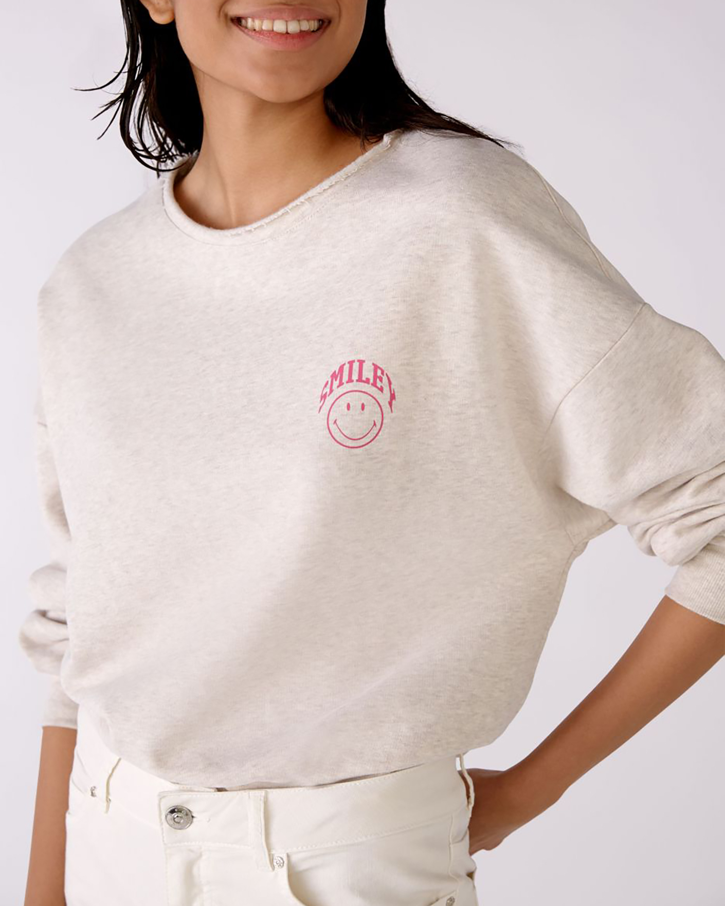 Свободный свитшот OUI серо-бежевого цвета с небольшим нагрудным принтом в виде смайла. Хлопковая модель с круглым вырезом, спущенной линией плеча и широкими рукавами с манжетой на тонкой резинке. Свитшот отлично впишется в ваш гардероб для комфортных прогулок.
