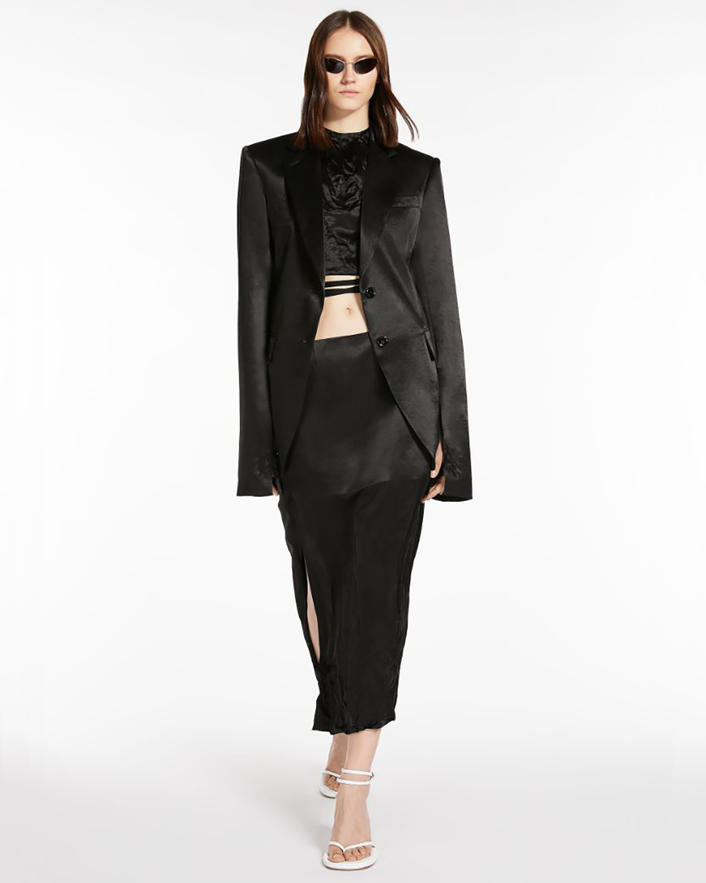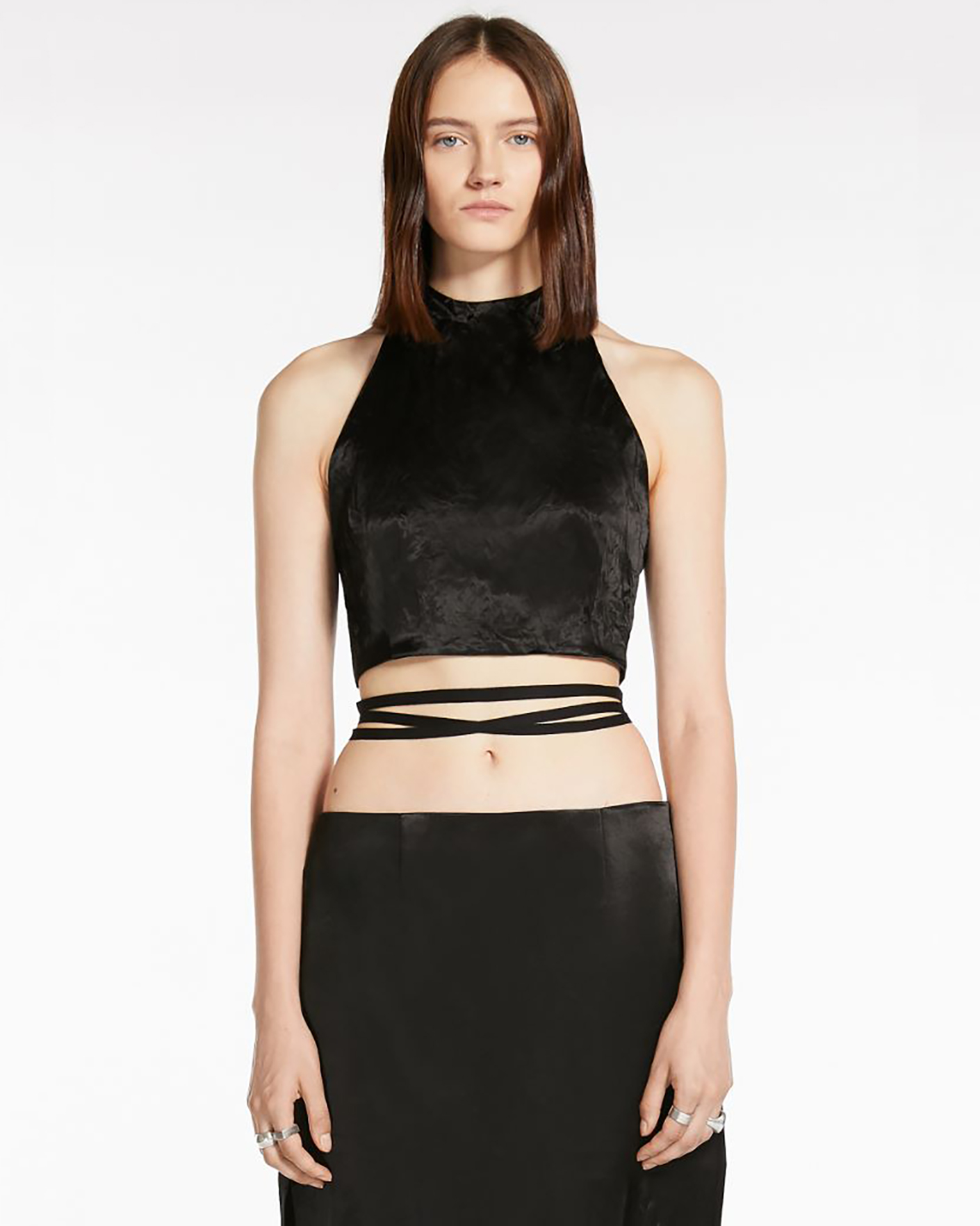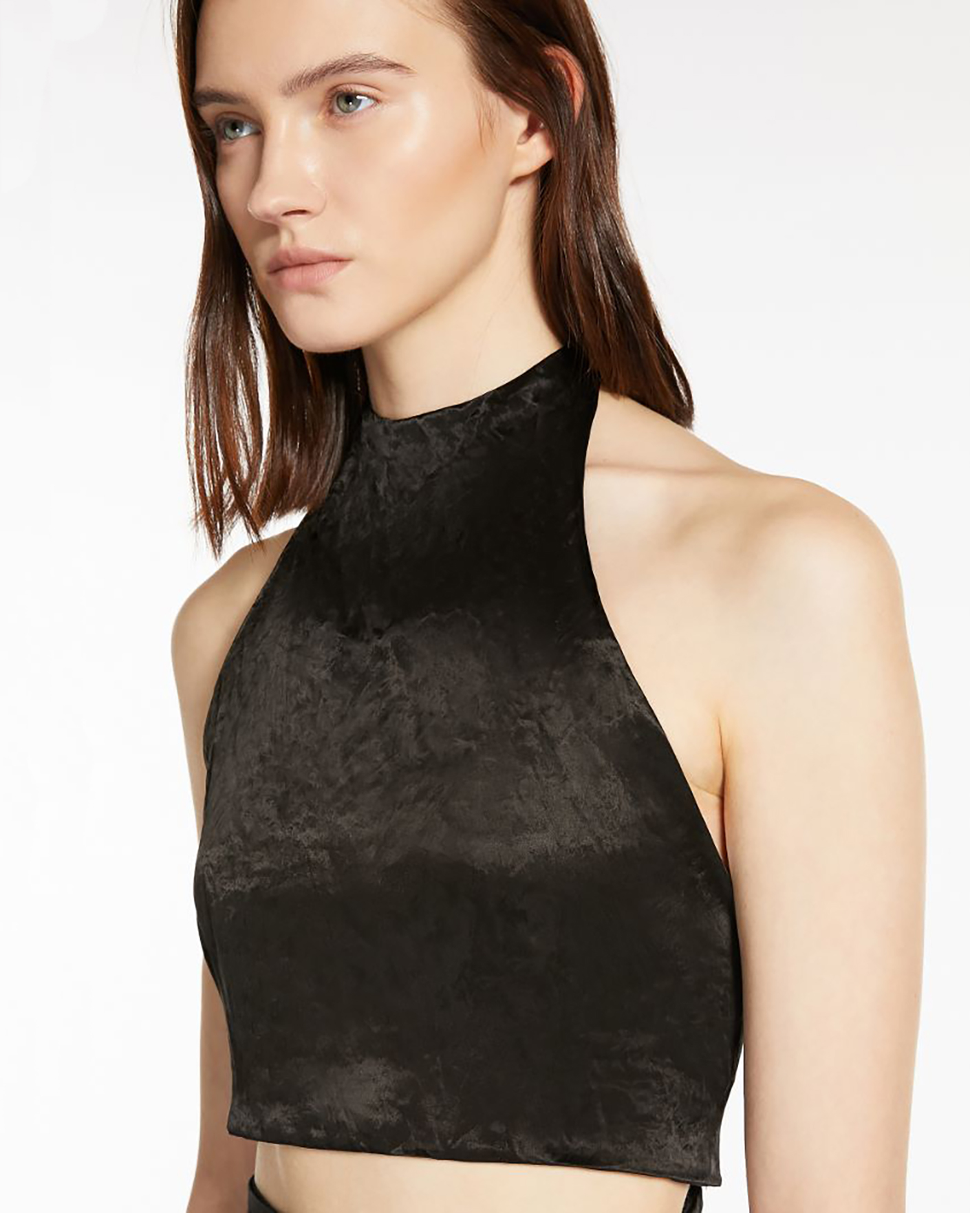 Кроп-топ Sportmax черного цвета с эффектом мятости. Завязывающийся сзади воротник обеспечивает полностью открытую спину, а также застежка на талии с помощью длинной ленты, что позволяет обмотать вокруг корпуса. Кроп-топ станет изюминкой вашего гардероба.