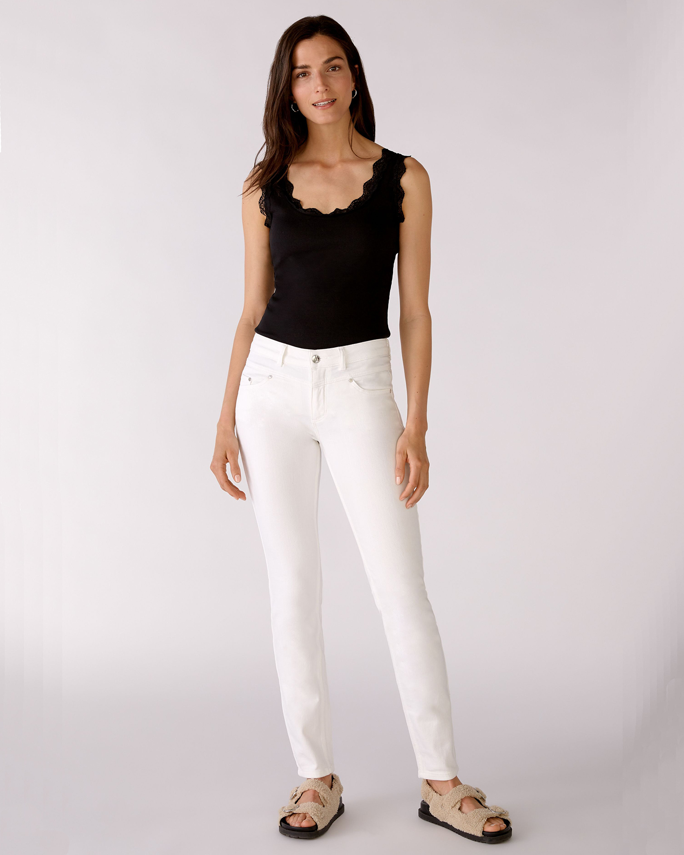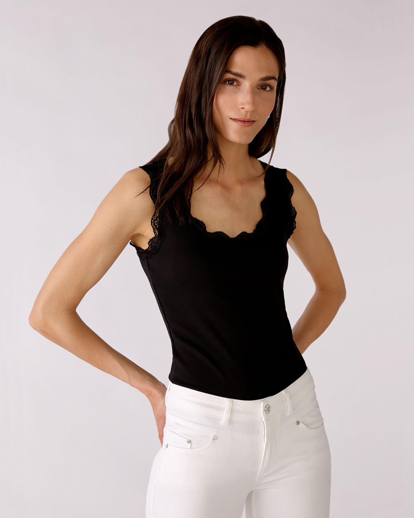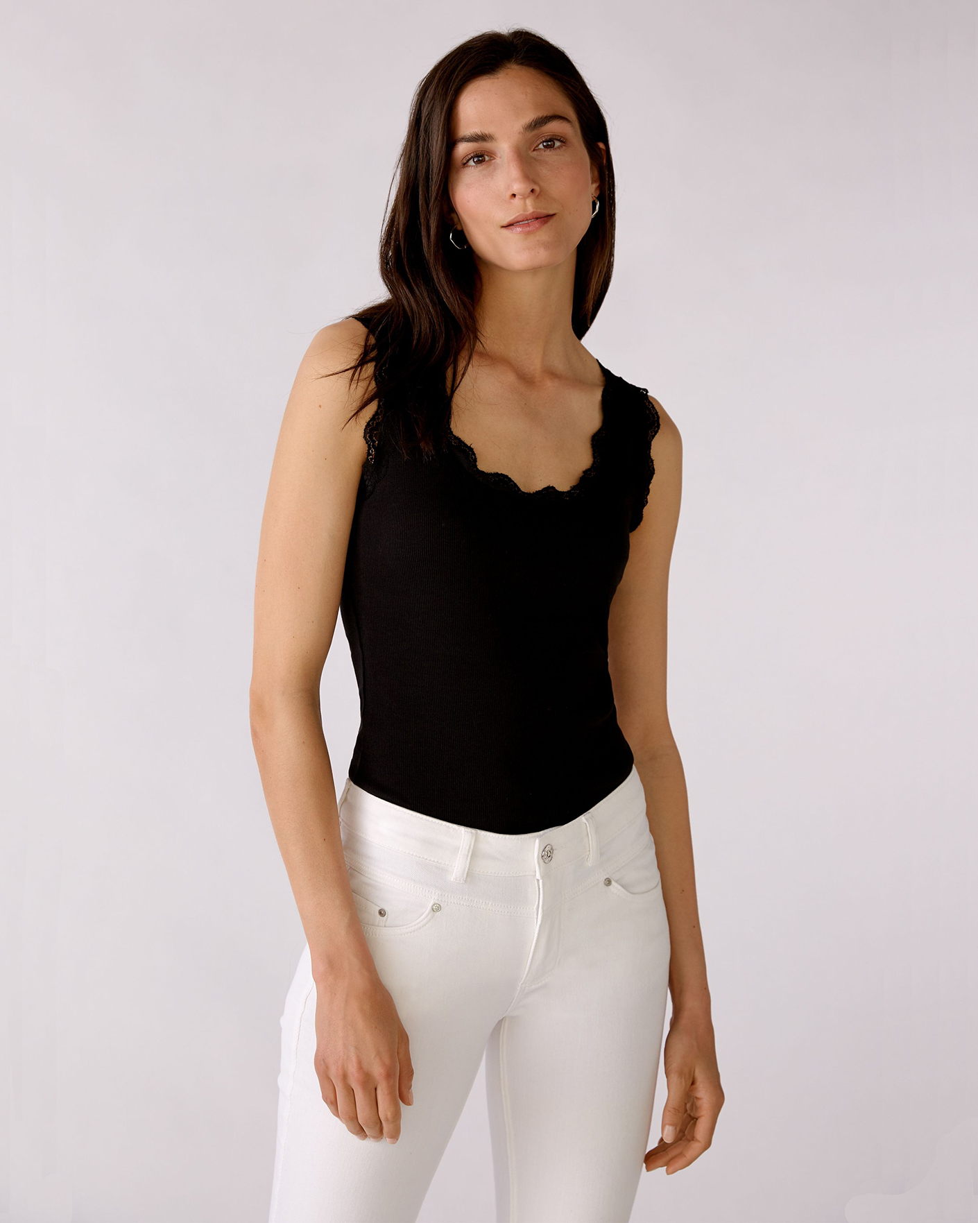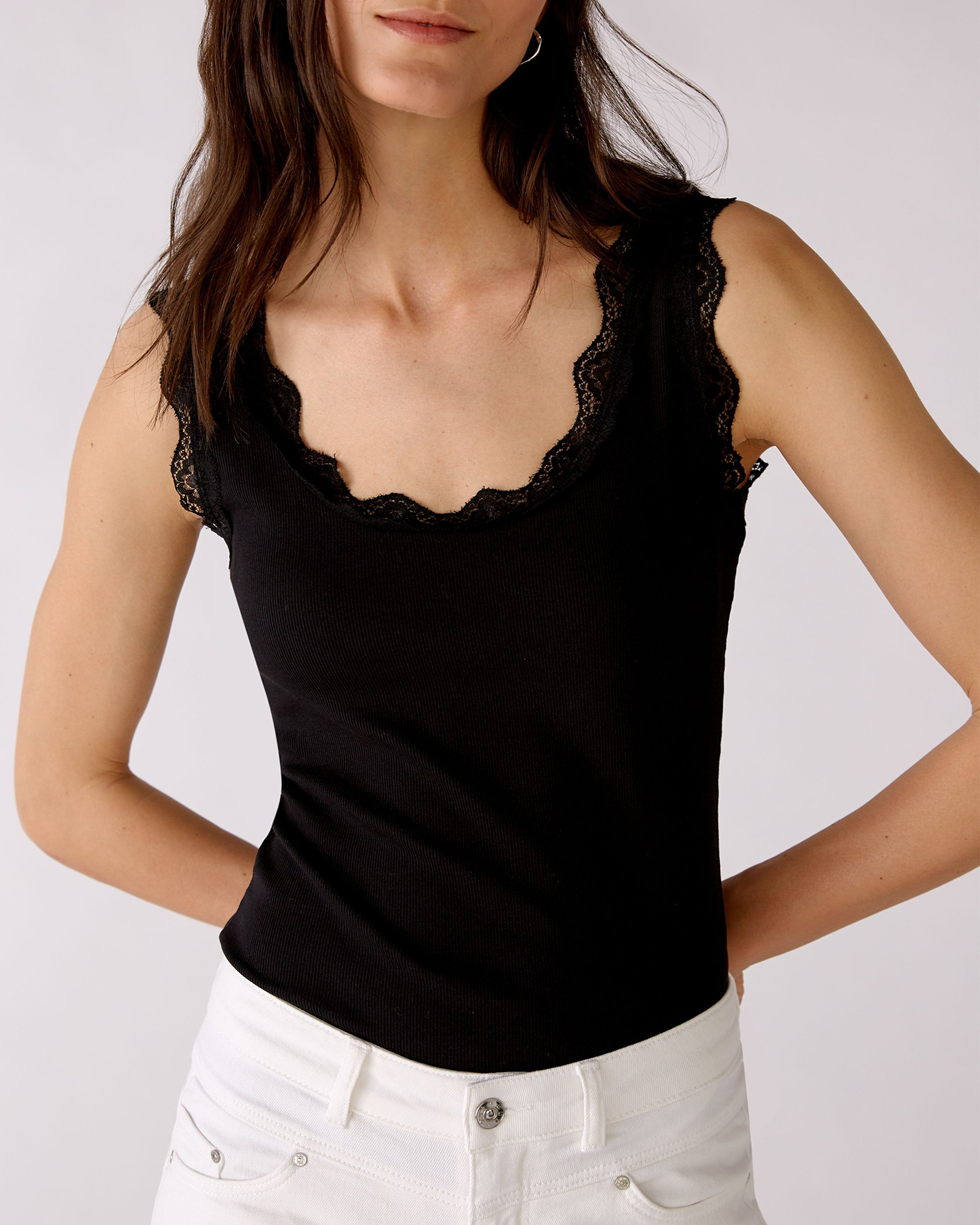 Приталенная майка OUI черного цвета в вертикальную структуру. Хлопковая модель на широких лямках. Круглый вырез с аккуратной отделкой кружева. Майку можно сочетать с кардиганом, жакетом, жилетом, юбкой и брюками.