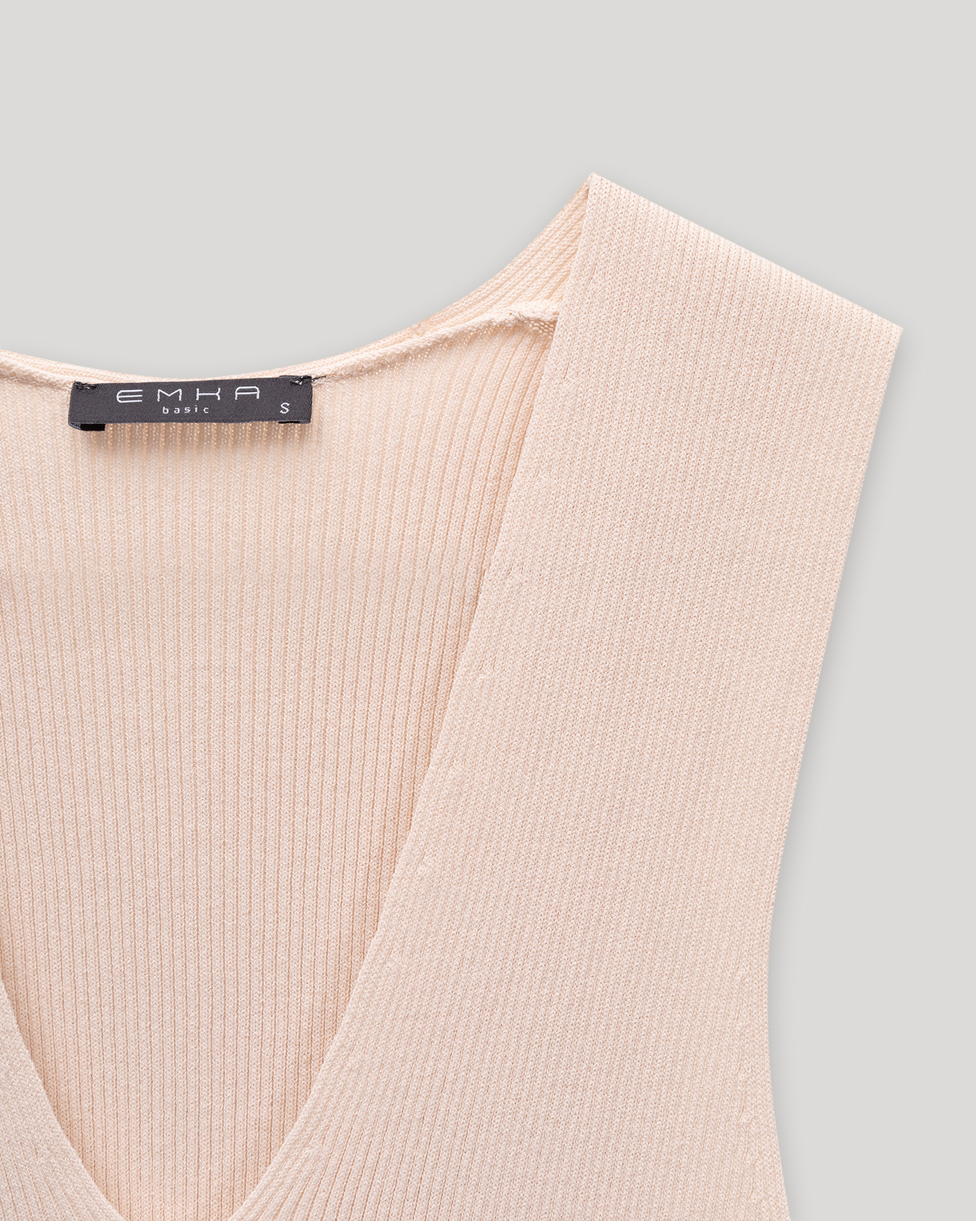 Приталенная майка Emka молочного цвета в вертикальную строчную полосу. Модель с глубоким V-образным вырезом, красиво открывающим линию ключиц. Майка отлично дополнит любой образ.