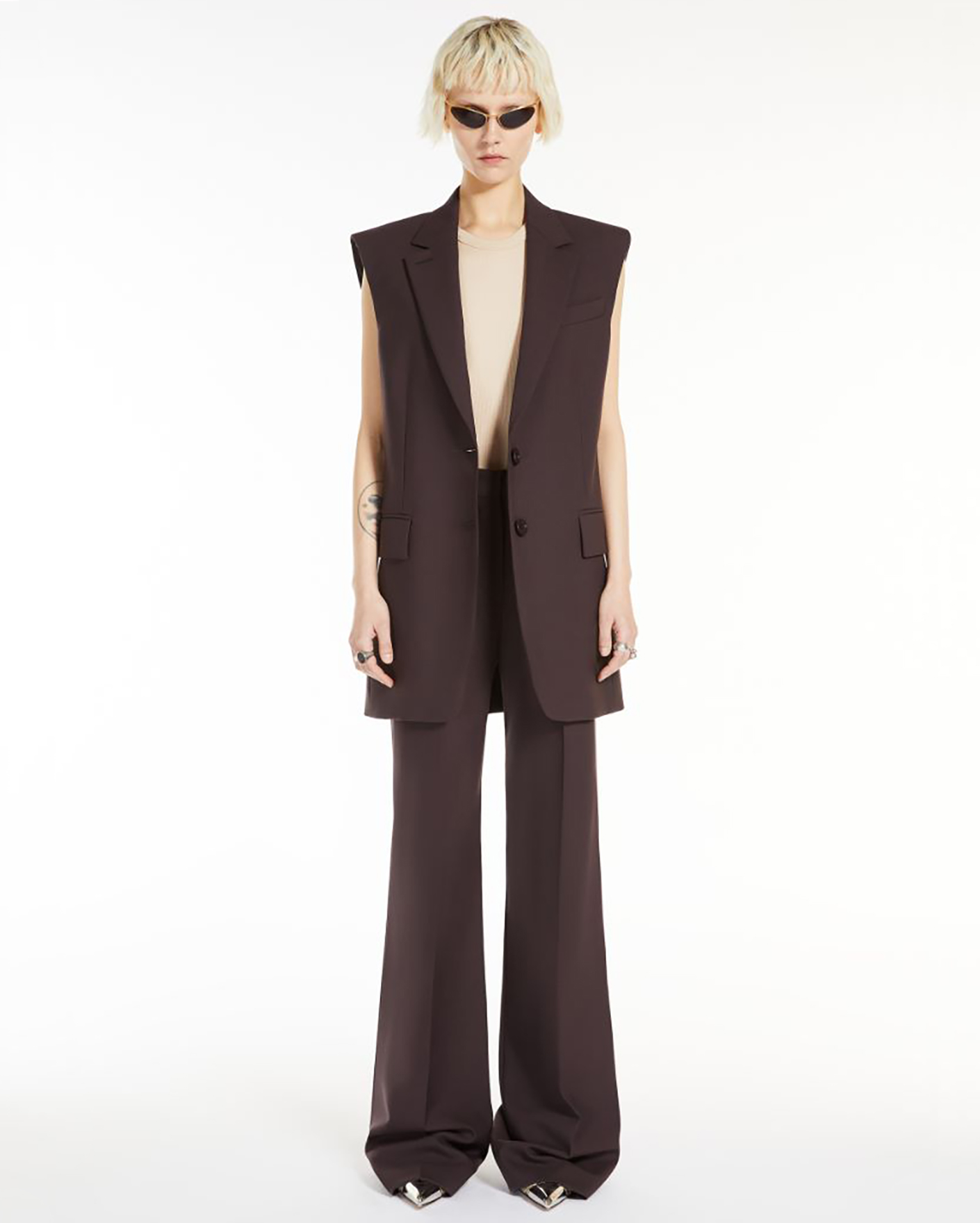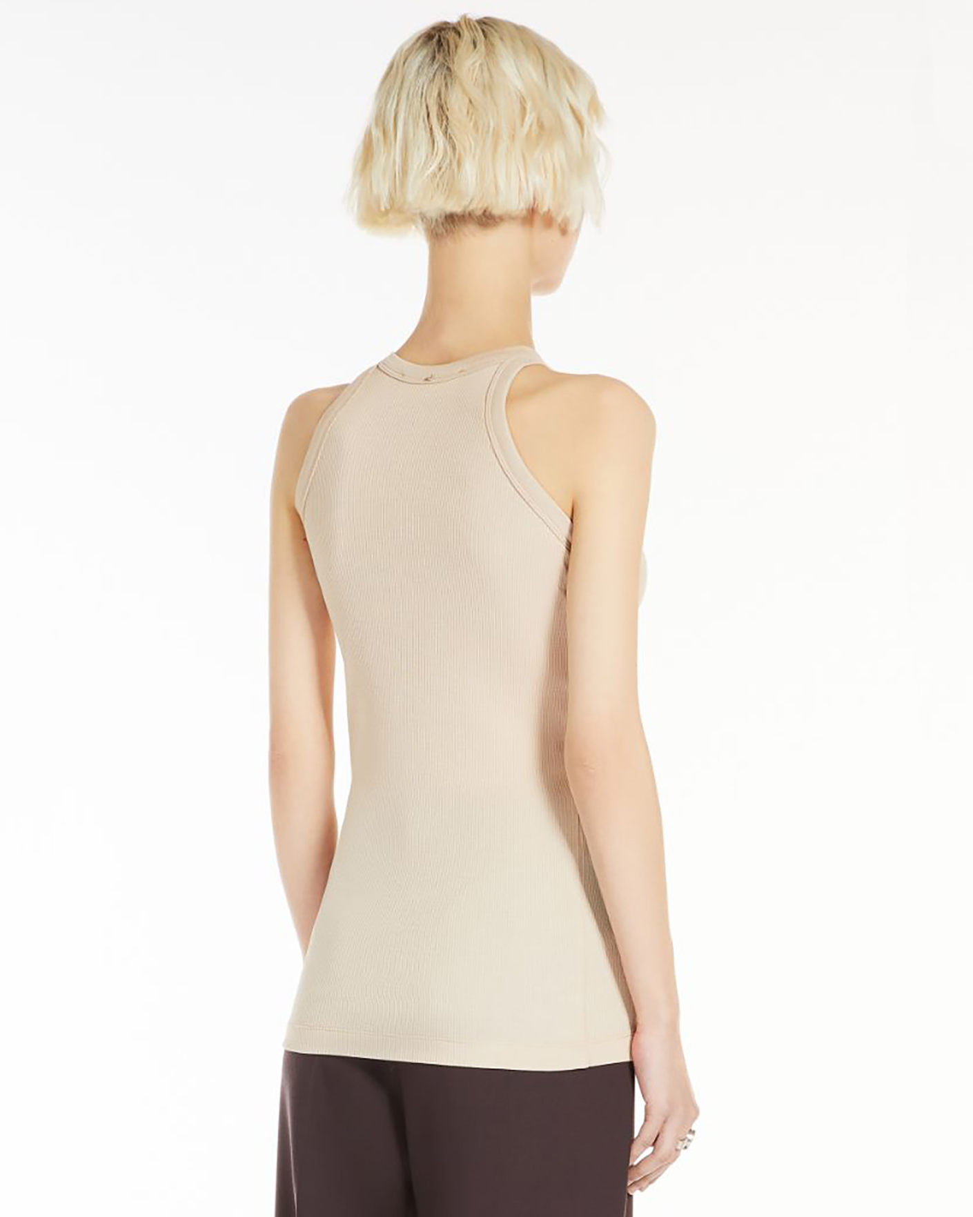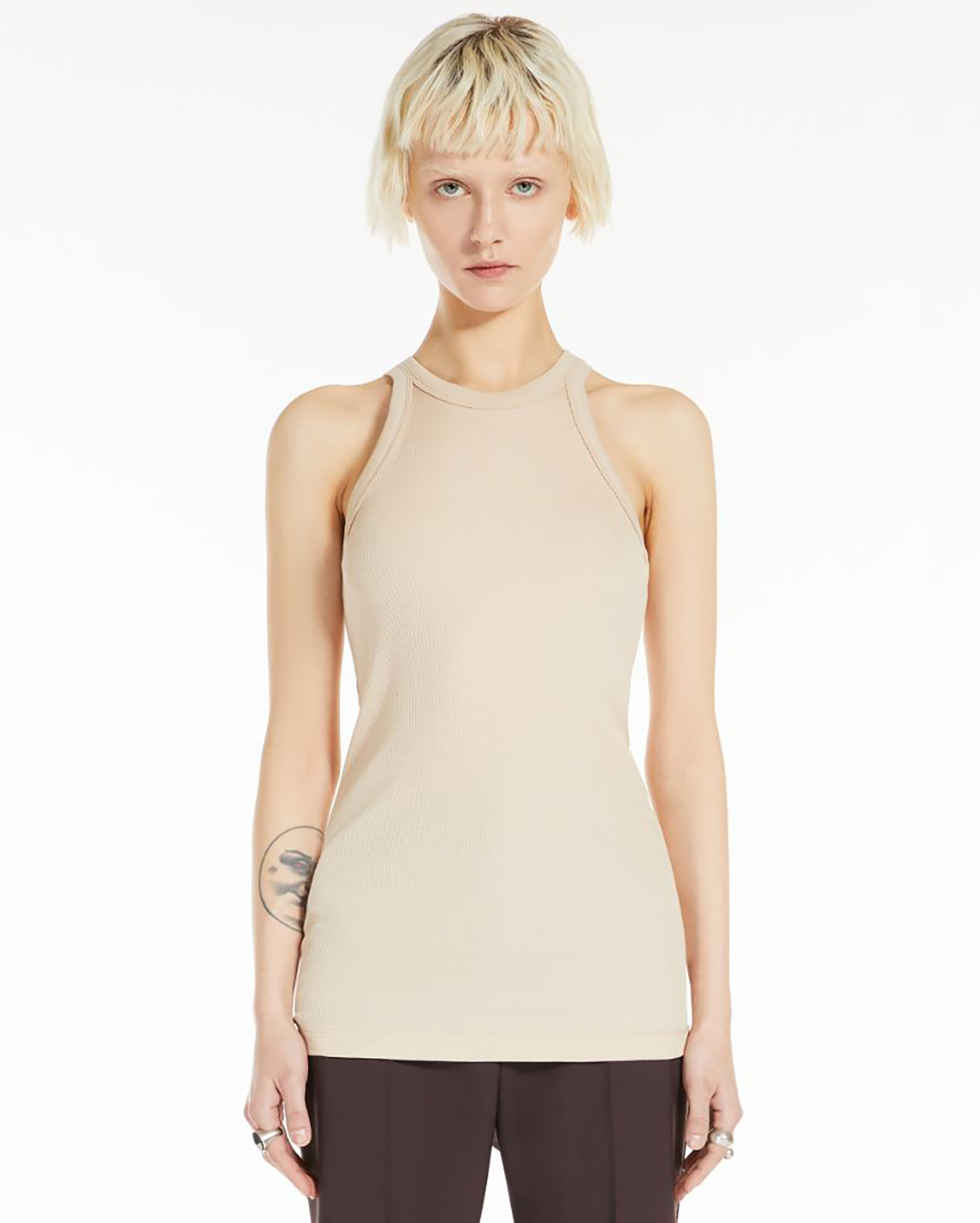 Приталенная майка Sportmax светло-бежевого цвета в мелкий рубчик. Модель с овальным вырезом на широких лямках. Изделие выполнено из высококачественно сочетания хлопка и шелка, с добавлением эластана. Майку можно сочетать с жакетом, жилетом, кардиганом, рубашкой, юбкой и брюками.