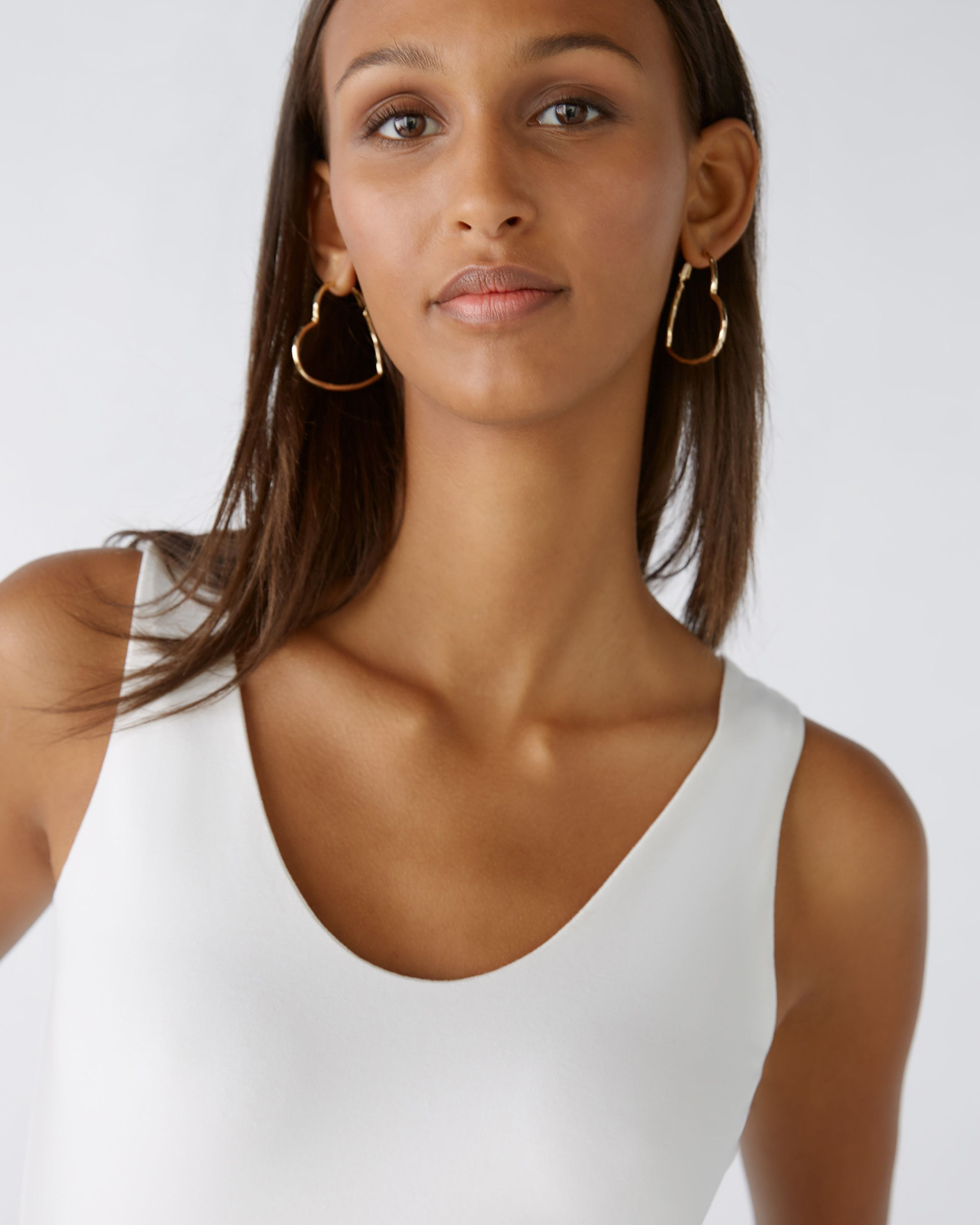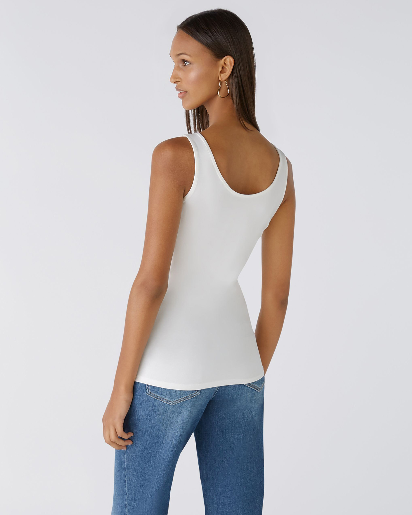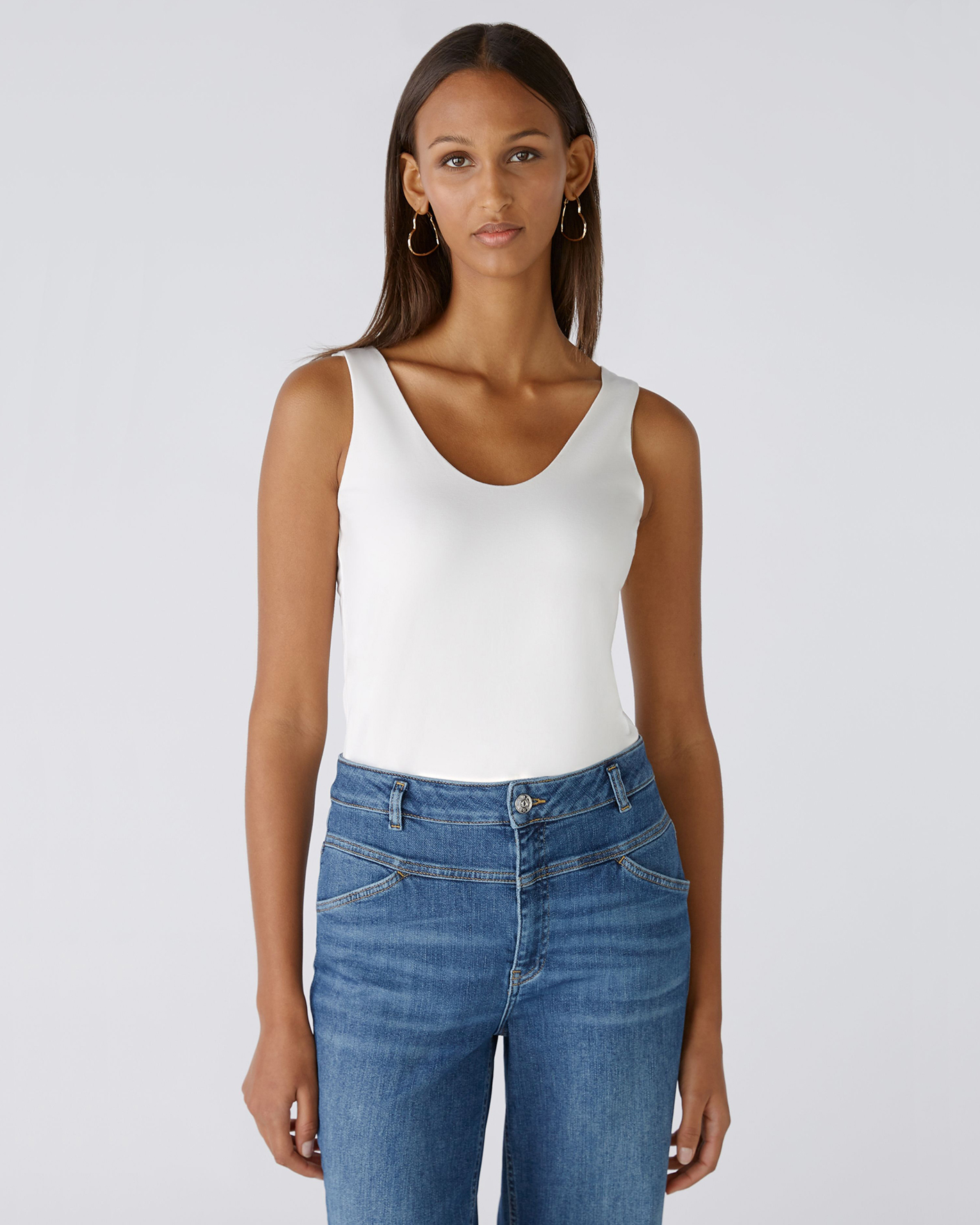 Приталенная майка OUI белого цвета. Модель с женственным V-образным вырезом спереди и круглым сзади, широкие бретели. Майка отлично впишется в повседневный гардероб.