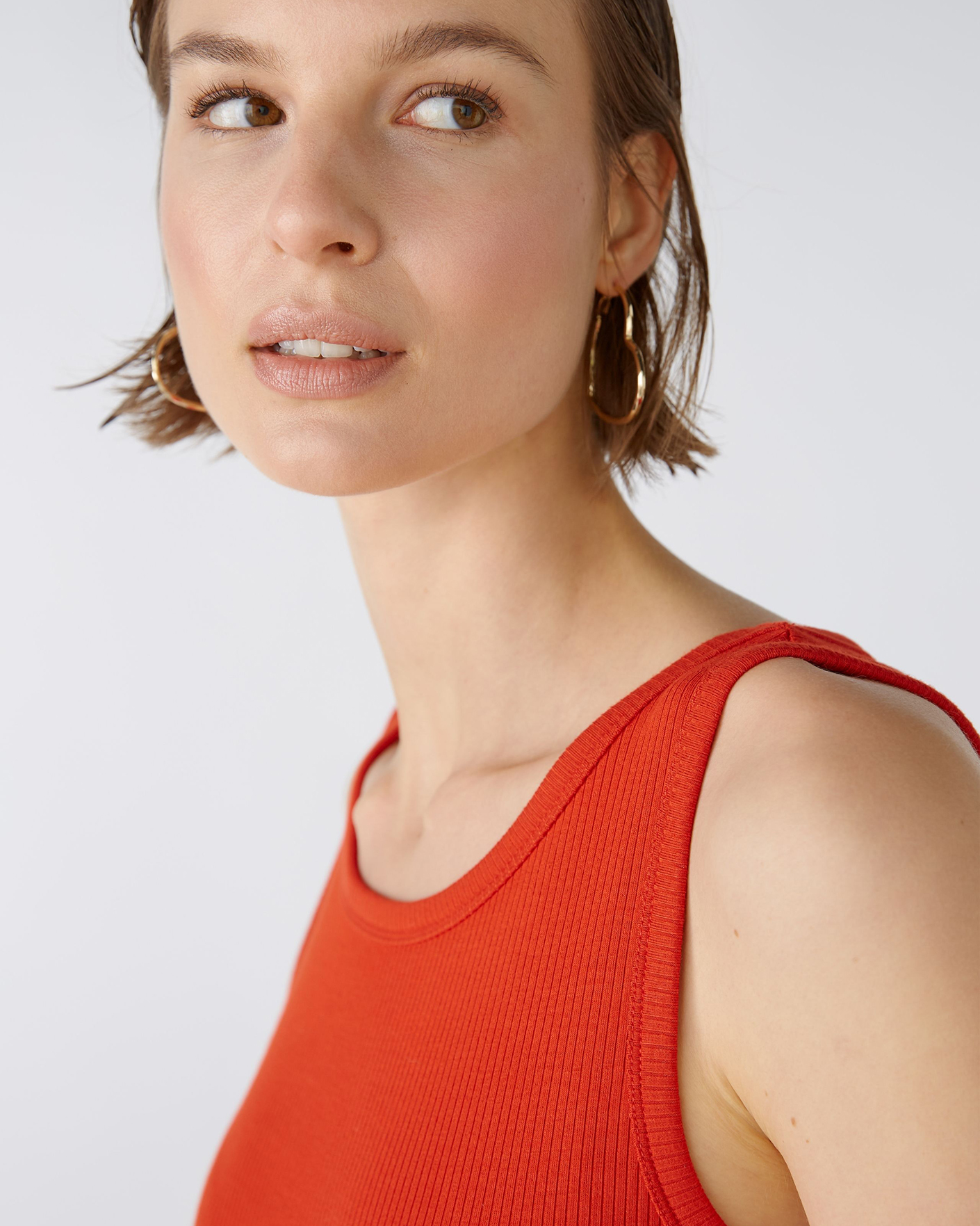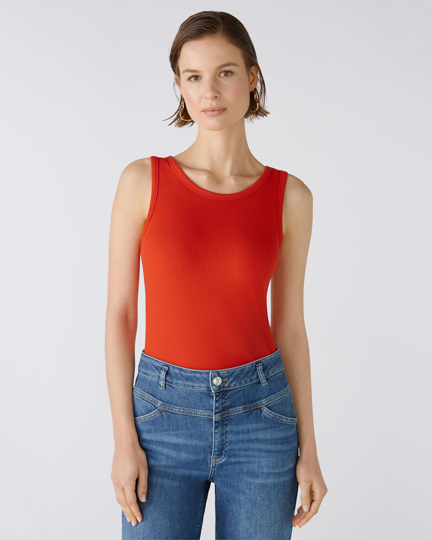 Приталенная майка OUI красного цвета в строчный рисунок. Модель с круглым вырезом. Майку можно сочетать с рубашкой, кардиганом, джемпермо и жакетом.