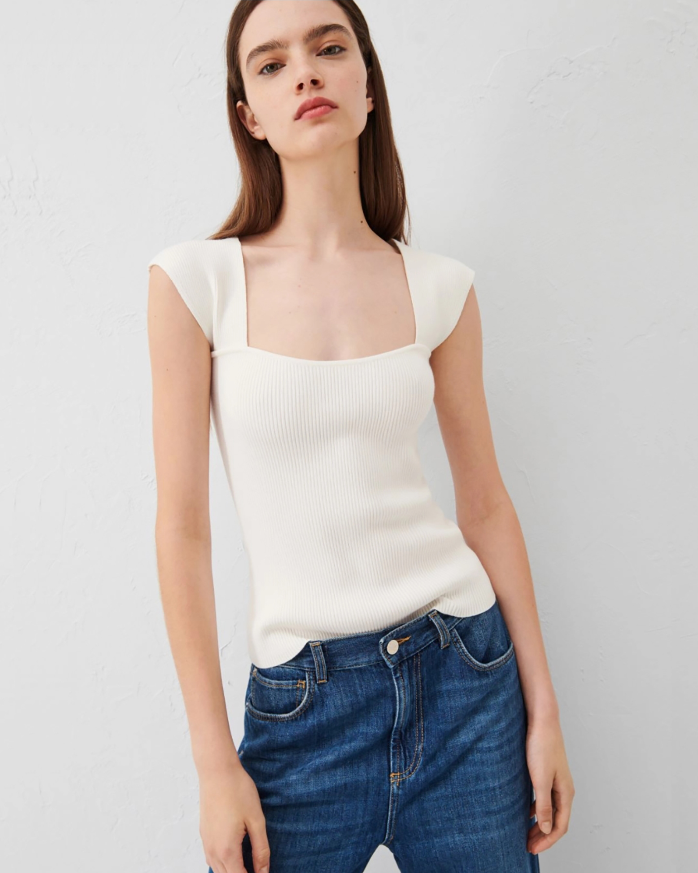 Приталенная майка-топ Marella белого цвета в мелкий рубчик. Модель с квадратным вырезом на широких лямках. Стильная майка-топ станет незаменимой вещью вашего гардероба.