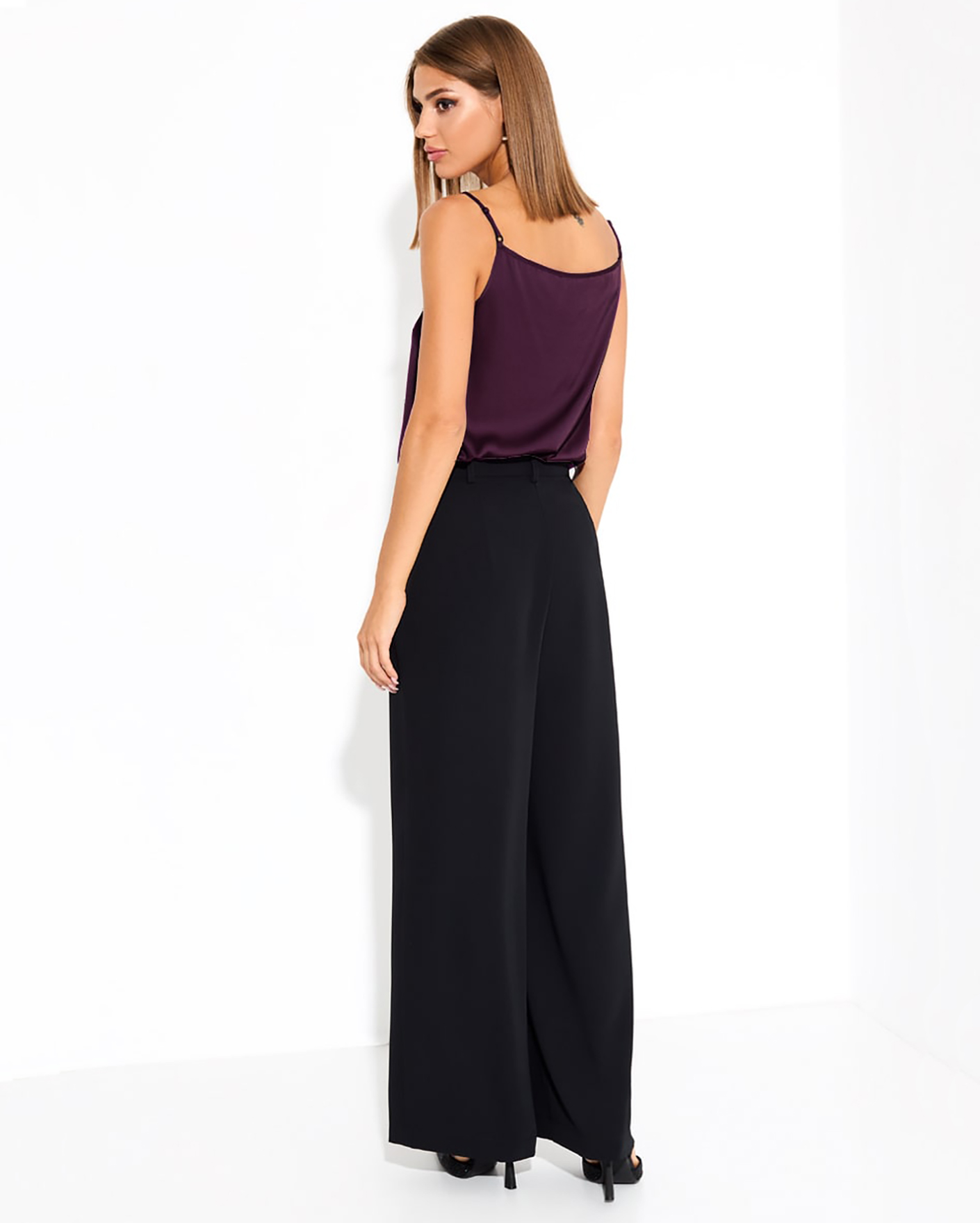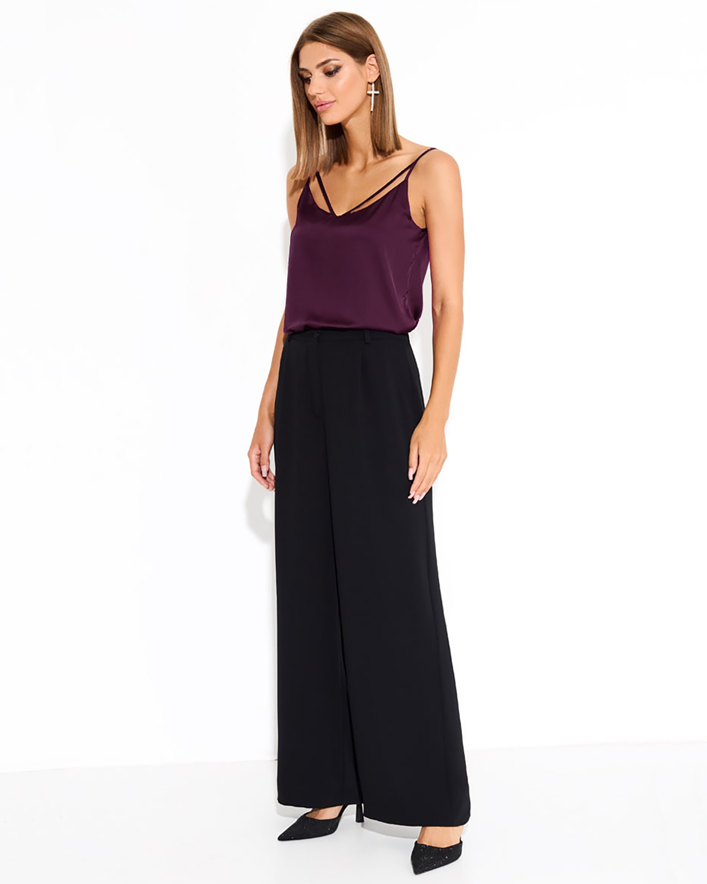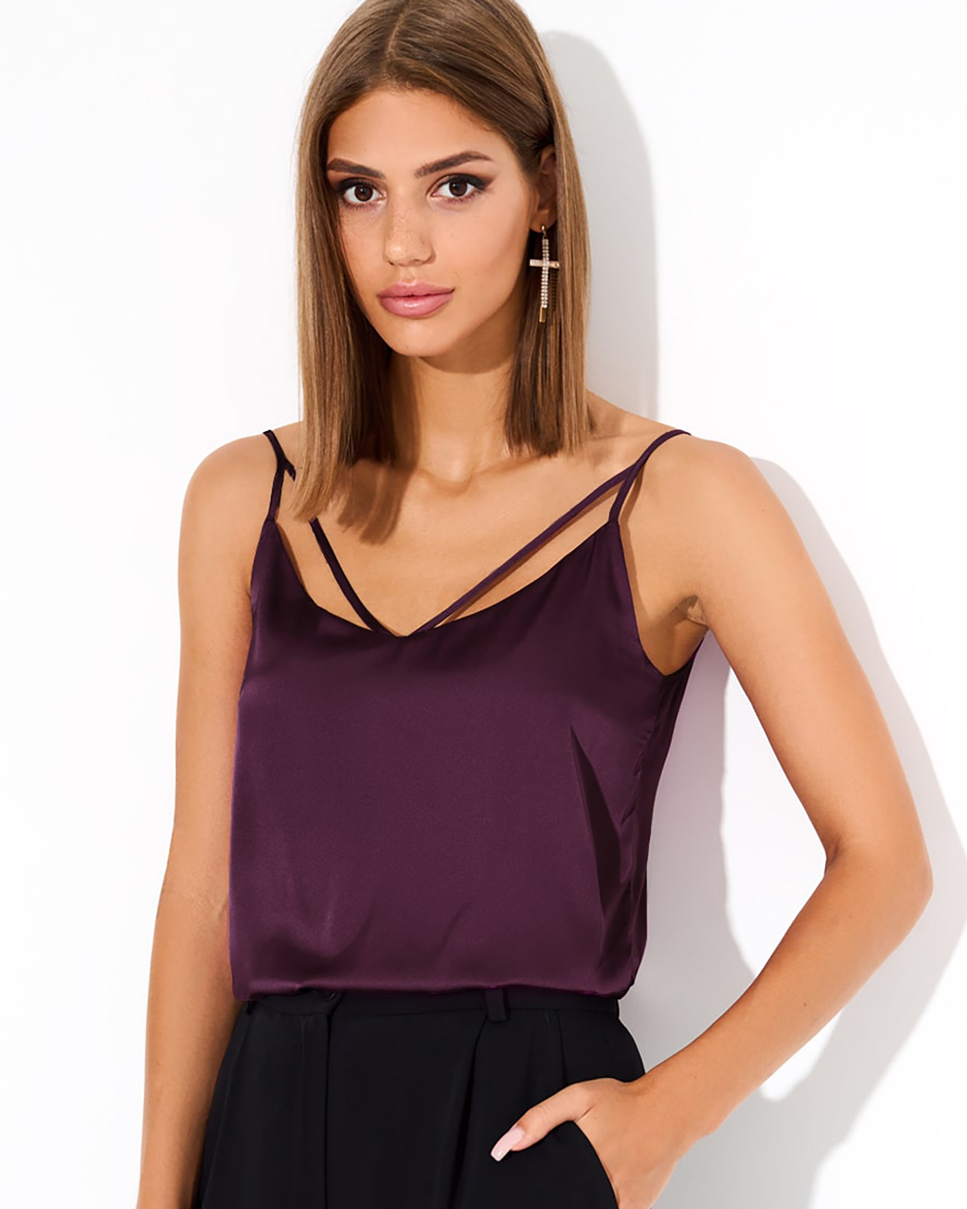 Полуприталенный топ Devita баклажанового цвета прямого кроя. Модель с декоративной окантовкой V-образного выреза спереди. Также имеются регулируемые тонкие бретели. Топ можно сочетать с кардиганом, жакетом, юбкой и брюками.